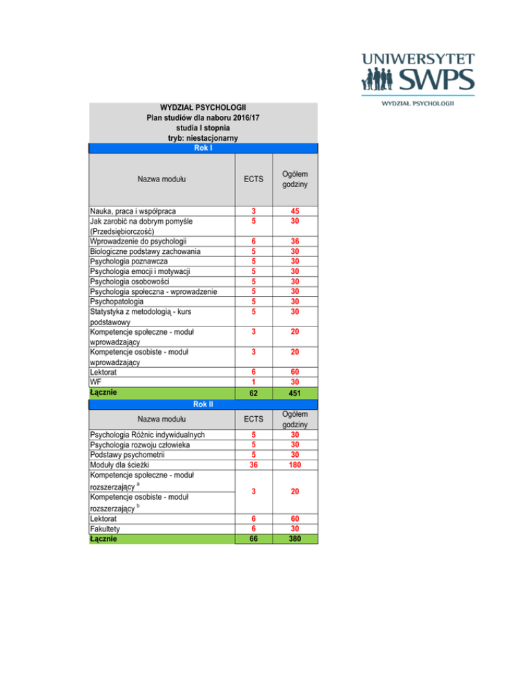 WYDZIAŁ PSYCHOLOGII Plan studiów dla naboru 2016/17 studia I stopnia tryb: niestacjonarny Rok I Nazwa modułu Nauka, praca i współpraca Jak zarobić na dobrym pomyśle (Przedsiębiorczość) Wprowadzenie do psychologii Biologiczne podstawy zachowania Psychologia poznawcza Psychologia emocji i motywacji Psychologia osobowości Psychologia społeczna - wprowadzenie Psychopatologia Statystyka z metodologią - kurs podstawowy Kompetencje społeczne - moduł wprowadzający Kompetencje osobiste - moduł wprowadzający Lektorat WF Łącznie Rok II Nazwa modułu Psychologia Różnic indywidualnych Psychologia rozwoju człowieka Podstawy psychometrii Moduły dla ścieżki Kompetencje społeczne - moduł rozszerzający a Kompetencje osobiste - moduł rozszerzający b Lektorat Fakultety Łącznie ECTS Ogółem godziny 3 5 45 30 6 5 5 5 5 5 5 5 36 30 30 30 30 30 30 30 3 20 3 20 6 1 62 60 30 451 5 5 5 36 Ogółem godziny 30 30 30 180 3 20 6 6 66 60 30 380 ECTS Rok III Nazwa modułu ECTS Ogółem Moduły dla ścieżki Seminarium licencjackie Fakultety Łącznie 36 10 6 52 180 60 30 270 SUMA 180 1101 a b - realizują studenci ścieżki Zdrowie i Rozwój - realizują studenci pozostałych scieżek WYDZIAŁ PSYCHOLOGII Szczegółowy Plan Modułów Scieżkowych 2016/17 studia I stopnia tryb: niestacjonarny ścieżka RELACJE MIĘDZYLUDZKIE Rok II Nazwa modułu ECTS Ogółem godziny 6 30 Rozumienie siebie i innych 6 30 Od wrogości do życzliwości 6 30 Kulturowe zaprogramowanie psychiki 6 30 Psychologia grupy 6 30 Psychologia miłości, przyjaźni i bliskich związków 6 30 Okiem psychologa na społeczeństwo 36 180 Łącznie Rok III Nazwa modułu ECTS Ogółem godziny 6 30 Jak ludzie na siebie wpływają 6 30 Życie w odmiennej kulturze- emigracja i akulturacja 6 30 Umiejętności komunikowania się 6 30 Władza i polityka 6 30 Internet i współczesne media 6 30 Konflikty i kryzysy- diagnoza i zarządzanie Łącznie 36 180 SUMA 72 360
