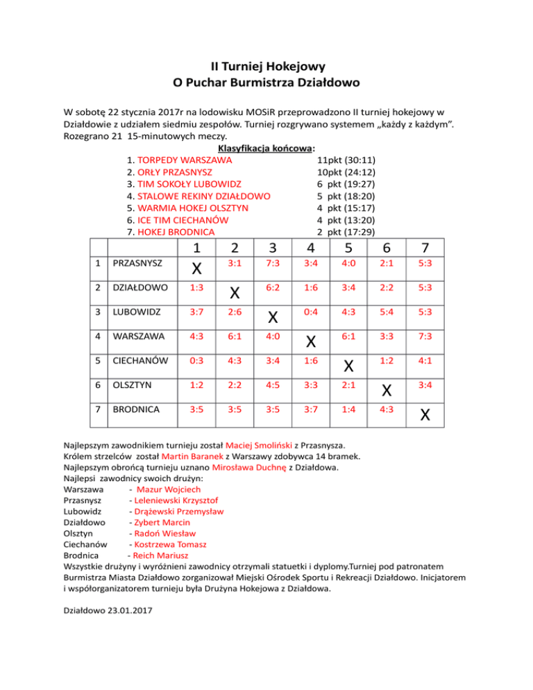 II Turniej Hokejowy O Puchar Burmistrza Działdowo W sobotę 22 stycznia 2017r na lodowisku MOSiR przeprowadzono II turniej hokejowy w Działdowie z udziałem siedmiu zespołów. Turniej rozgrywano systemem „każdy z każdym”. Rozegrano 21 15-minutowych meczy. Klasyfikacja końcowa: 1. TORPEDY WARSZAWA 11pkt (30:11) 2. ORŁY PRZASNYSZ 10pkt (24:12) 3. TIM SOKOŁY LUBOWIDZ 6 pkt (19:27) 4. STALOWE REKINY DZIAŁDOWO 5 pkt (18:20) 5. WARMIA HOKEJ OLSZTYN 4 pkt (15:17) 6. ICE TIM CIECHANÓW 4 pkt (13:20) 7. HOKEJ BRODNICA 2 pkt (17:29) 1 2 3 4 5 6 7 1 PRZASNYSZ X 3:1 7:3 3:4 4:0 2:1 5:3 2 DZIAŁDOWO 1:3 X 6:2 1:6 3:4 2:2 5:3 3 LUBOWIDZ 3:7 2:6 X 0:4 4:3 5:4 5:3 4 WARSZAWA 4:3 6:1 4:0 X 6:1 3:3 7:3 5 CIECHANÓW 0:3 4:3 3:4 1:6 X 1:2 4:1 6 OLSZTYN 1:2 2:2 4:5 3:3 2:1 X 3:4 7 BRODNICA 3:5 3:5 3:5 3:7 1:4 4:3 X Najlepszym zawodnikiem turnieju został Maciej Smoliński z Przasnysza. Królem strzelców został Martin Baranek z Warszawy zdobywca 14 bramek. Najlepszym obrońcą turnieju uznano Mirosława Duchnę z Działdowa. Najlepsi zawodnicy swoich drużyn: Warszawa - Mazur Wojciech Przasnysz - Leleniewski Krzysztof Lubowidz - Drążewski Przemysław Działdowo - Zybert Marcin Olsztyn - Radoń Wiesław Ciechanów - Kostrzewa Tomasz Brodnica - Reich Mariusz Wszystkie drużyny i wyróżnieni zawodnicy otrzymali statuetki i dyplomy.Turniej pod patronatem Burmistrza Miasta Działdowo zorganizował Miejski Ośrodek Sportu i Rekreacji Działdowo. Inicjatorem i współorganizatorem turnieju była Drużyna Hokejowa z Działdowa. Działdowo 23.01.2017