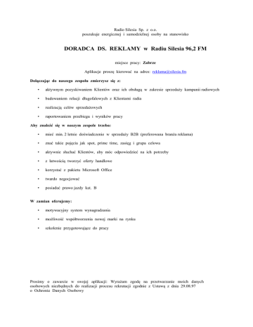 Radio Silesia Sp. z o.o. poszukuje energicznej i samodzielnej osoby na stanowisko DORADCA DS. REKLAMY w Radiu Silesia 96,2 FM miejsce pracy: Zabrze Aplikacje proszę kierować na adres: [email protected] Dołączając do naszego zespołu zmierzysz się z: • aktywnym pozyskiwaniem Klientów oraz ich obsługą w zakresie sprzedaży kampanii radiowych • budowaniem relacji długofalowych z Klientami radia • realizacją celów sprzedażowych • raportowaniem przebiegu i wyników pracy Aby znaleźć się w naszym zespole trzeba: • mieć min. 2 letnie doświadczenie w sprzedaży B2B (preferowana branża reklama) • znać takie pojęcia jak spot, prime time, zasięg i grupa celowa • aktywnie słuchać Klientów, aby móc odpowiedzieć na ich potrzeby • z łatwością tworzyć oferty handlowe • korzystać z pakietu Microsoft Office • twardo negocjować • posiadać prawo jazdy kat. B W zamian oferujemy: • motywacyjny system wynagradzania • możliwość współtworzenia nowej marki na rynku • szkolenie przygotowujące do pracy Prosimy o zawarcie w swojej aplikacji: Wyrażam zgodę na przetwarzanie moich danych osobowych niezbędnych do realizacji procesu rekrutacji zgodnie z Ustawą z dnia 29.08.97 o Ochronie Danych Osobowy