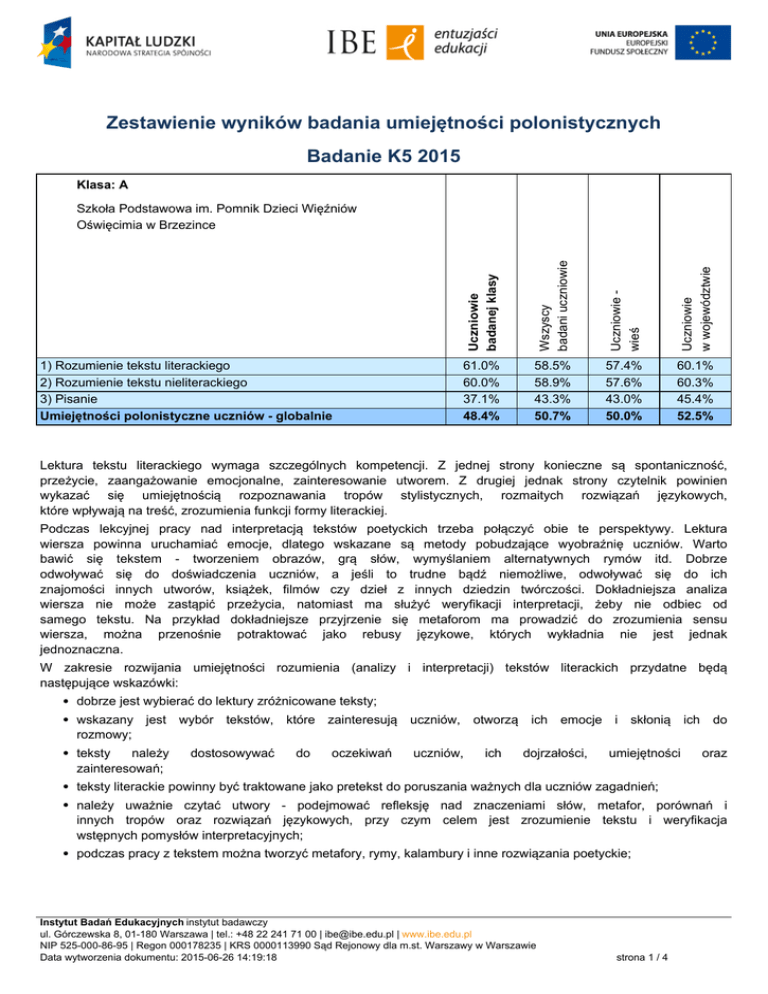 Zestawienie wyników badania umiejętności polonistycznych Badanie K5 2015 Klasa: A Wszyscy badani uczniowie Uczniowie wieś Uczniowie w województwie 1) Rozumienie tekstu literackiego 2) Rozumienie tekstu nieliterackiego 3) Pisanie Umiejętności polonistyczne uczniów - globalnie Uczniowie badanej klasy Szkoła Podstawowa im. Pomnik Dzieci Więźniów Oświęcimia w Brzezince 61.0% 60.0% 37.1% 48.4% 58.5% 58.9% 43.3% 50.7% 57.4% 57.6% 43.0% 50.0% 60.1% 60.3% 45.4% 52.5% Lektura tekstu literackiego wymaga szczególnych kompetencji. Z jednej strony konieczne są spontaniczność, przeżycie, zaangażowanie emocjonalne, zainteresowanie utworem. Z drugiej jednak strony czytelnik powinien wykazać się umiejętnością rozpoznawania tropów stylistycznych, rozmaitych rozwiązań językowych, które wpływają na treść, zrozumienia funkcji formy literackiej. Podczas lekcyjnej pracy nad interpretacją tekstów poetyckich trzeba połączyć obie te perspektywy. Lektura wiersza powinna uruchamiać emocje, dlatego wskazane są metody pobudzające wyobraźnię uczniów. Warto bawić się tekstem - tworzeniem obrazów, grą słów, wymyślaniem alternatywnych rymów itd. Dobrze odwoływać się do doświadczenia uczniów, a jeśli to trudne bądź niemożliwe, odwoływać się do ich znajomości innych utworów, książek, filmów czy dzieł z innych dziedzin twórczości. Dokładniejsza analiza wiersza nie może zastąpić przeżycia, natomiast ma służyć weryfikacji interpretacji, żeby nie odbiec od samego tekstu. Na przykład dokładniejsze przyjrzenie się metaforom ma prowadzić do zrozumienia sensu wiersza, można przenośnie potraktować jako rebusy językowe, których wykładnia nie jest jednak jednoznaczna. W zakresie rozwijania umiejętności rozumienia (analizy i interpretacji) tekstów literackich przydatne będą następujące wskazówki: dobrze jest wybierać do lektury zróżnicowane teksty; wskazany jest wybór tekstów, które zainteresują uczniów, otworzą ich emocje i skłonią ich do rozmowy; teksty należy zainteresowań; dostosowywać do oczekiwań uczniów, ich dojrzałości, umiejętności oraz teksty literackie powinny być traktowane jako pretekst do poruszania ważnych dla uczniów zagadnień; należy uważnie czytać utwory - podejmować refleksję nad znaczeniami słów, metafor, porównań i innych tropów oraz rozwiązań językowych, przy czym celem jest zrozumienie tekstu i weryfikacja wstępnych pomysłów interpretacyjnych; podczas pracy z tekstem można tworzyć metafory, rymy, kalambury i inne rozwiązania poetyckie; Instytut Badań Edukacyjnych instytut badawczy ul. Górczewska 8, 01-180 Warszawa | tel.: +48 22 241 71 00 | [email protected] | www.ibe.edu.pl NIP 525-000-86-95 | Regon 000178235 | KRS 0000113990 Sąd Rejonowy dla m.st. Warszawy w Warszawie Data wytworzenia dokumentu: 2015-06-26 14:19:18 strona 1 / 4 praca z tekstem skłania przeczytanego utworu. do snucia opowieści, które stanowiłyby Aby zrozumieć wypowiedź, odbiorca musi uważnie wczytać umiejętność. Nie wystarczy rozpoznać znaczenia słów, ważne wykorzystanych form gramatycznych, z budowy zdań, struktury przekazu itd. Czytelnik podchodzi do lektury z pewną wiedzą, kontrolować swoją lekturę, by uniknąć nieporozumień. całkowitym niezrozumieniem tekstu. dopełnienie (np. dalszy ciąg) się w nią. Wbrew pozorom to trudna jest dostrzeżenie sensów wynikających z tekstu, słownictwa wartościującego, logiki emocjami, nastawieniem. Dlatego powinien Nieuważny odbiór może skutkować Z tego powodu nauka dokładnej lektury powinna odgrywać istotną rolę w dydaktyce nauczania języka polskiego. Jest wskazane, żeby nauczyciel dobierał takie teksty, które zainteresują uczniów. Mogą one reprezentować różne gatunki i formy, a także mogą dotyczyć rozmaitych zagadnień, najlepiej jednak, jeśli są to problemy bliskie młodym ludziom (np. rodzina, dorastanie, rozwiązywanie konfliktów, ale też przyroda, historia, egzotyczne obyczaje, podróże itd.). Praca nad tekstem nie powinna być pospieszna. Przy okazji lektury można realizować te elementy programu, które związane są z nauką o języku, nauką o gatunkach publicystycznych, kwestiami rozpoznawania intencji autorskich czy sposobów oddziaływania na emocje. W zakresie wskazówki: ćwiczenie myśli; rozwijania rozumienia umiejętności całości rozumienia tekstu powinno tekstów zawsze nieliterackich zawierać przydatne wskazanie będą jego następujące głównej/głównych bardzo istotne jest odtwarzanie logiki tekstu; kluczowa w omawianym ćwiczyć cały czas; zakresie umiejętność to wyszukiwanie w tekście informacji rozumienie tekstu nieliterackiego polega również na umiejętności hierarchizowania najważniejszych do drugorzędnych - również ta umiejętność wymaga uważnych ćwiczeń; - należy ją informacji od omawiać ich przydatne są ćwiczenia w parafrazowaniu fragmentów tekstu; należy wskazywać rozwiązania językowe i formalne wykorzystane funkcję - co dla sensu tekstu wynika z przyjęcia danego rozwiązania; w tekście oraz trzeba omawiać cechy gatunkowye tekstu, ponieważ często to one decydują językowym, przyjętym (i odtwarzanym przez uczniów) sposobie widzenia spraw itd.; należy konfrontować teksty ciągłe (wyrażane werbalnie) wykresami) i tekstami ikonicznymi (np. fotografiami, rycinami). z tekstami o nieciągłymi ukształtowaniu (np. tabelami, Na pierwszym i drugim etapie edukacyjnym uczniowie mają opanować tworzenie tekstu w kilku gatunkach: opowiadanie i opis, list prywatny i oficjalny, życzenia, zaproszenie, pamiętnik i dziennik, sprawozdanie, ogłoszenie, notatka. To są podstawowe formy pisemne, potrzebne uczniowi w dalszej edukacji i w życiu dorosłym. Warto tutaj zwrócić uwagę na dwa gatunki. Opanowanie pisania notatki jest konieczne, bo uczeń powinien samodzielnie notować najważniejsze informacje, które otrzymuje podczas lekcji, oraz info