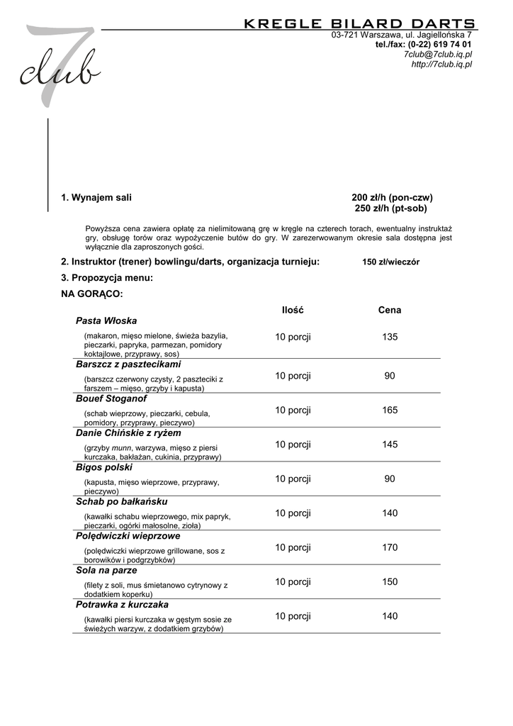 KREGLE BILARD DARTS 03-721 Warszawa, ul. Jagiellońska 7 tel./fax: (0-22) 619 74 01 [email protected] http://7club.iq.pl 1. Wynajem sali 200 zł/h (pon-czw) 250 zł/h (pt-sob) Powyższa cena zawiera opłatę za nielimitowaną grę w kręgle na czterech torach, ewentualny instruktaż gry, obsługę torów oraz wypożyczenie butów do gry. W zarezerwowanym okresie sala dostępna jest wyłącznie dla zaproszonych gości. 2. Instruktor (trener) bowlingu/darts, organizacja turnieju: 150 zł/wieczór 3. Propozycja menu: NA GORĄCO: Ilość Cena 10 porcji 135 10 porcji 90 10 porcji 165 10 porcji 145 10 porcji 90 10 porcji 140 10 porcji 170 10 porcji 150 10 porcji 140 Pasta Włoska (makaron, mięso mielone, świeża bazylia, pieczarki, papryka, parmezan, pomidory koktajlowe, przyprawy, sos) Barszcz z pasztecikami (barszcz czerwony czysty, 2 paszteciki z farszem – mięso, grzyby i kapusta) Bouef Stoganof (schab wieprzowy, pieczarki, cebula, pomidory, przyprawy, pieczywo) Danie Chińskie z ryżem (grzyby munn, warzywa, mięso z piersi kurczaka, bakłażan, cukinia, przyprawy) Bigos polski (kapusta, mięso wieprzowe, przyprawy, pieczywo) Schab po bałkańsku (kawałki schabu wieprzowego, mix papryk, pieczarki, ogórki małosolne, zioła) Polędwiczki wieprzowe (polędwiczki wieprzowe grillowane, sos z borowików i podgrzybków) Sola na parze (filety z soli, mus śmietanowo cytrynowy z dodatkiem koperku) Potrawka z kurczaka (kawałki piersi kurczaka w gęstym sosie ze świeżych warzyw, z dodatkiem grzybów) DODATKI DO DAŃ GORĄCYCH: Ziemniaki puree z koperkiem Pikantne ziemniaczki opiekane Ryż kolorowy Ryż dziki Kopytka szpinakowe lub tradycyjne Kluski śląskie Ilość 10 porcji 10 porcji 10 porcji 10 porcji 10 porcji 10 porcji Cena 50 60 50 65 70 75 Ilość Cena 10 porcji 80 10 porcji 80 10 porcji 80 10 porcji 80 10 porcji 80 10 porcji 80 10 porcji 80 10 porcji 80 10 porcji 80 SAŁATY: Śledź „pod pierzynką” (filety śledziowe, śmietana, tarty ser żółty, ogórek kiszony, cebula, oliwki) Sałatka Jarzynowa (gotowane warzywa, ogórek kiszony, ziemniaki, jabłka, groszek konserwowy, majonez, przyprawy) Sałatka z kurczaka (piersi z kurczaka gotowane, kukurydza konserwowa, ziemniaki, szynka, majonez, przyprawy) Sałatka z łososia (łosoś wędzony, kapary, czarne oliwki, kukurydza konserwowa, ziemniaki, cebula, majonez, przyprawy) Cymes (żółty ser, bakalie, orzechy, migdały, papryka, pomarańcze, majonez, przyprawy) Sałatka z tuńczykiem (tuńczyk w oliwie, jabłko, ogórek kiszony, papryka, majonez, przyprawy) Sałatka królewska (szynka, warzywa gotowane, kawałki piersi z indyka, ananas, majonez, przyprawy) Sałatka Grecka (sałata lodowa, ciemna i zielona, papryka kolorowa, pomidory, oliwki, kapary, cebula, ser feta, sos vinegrette) Sałata z owocami w migdałach (kapusta pekińska, sałata lodowa, melon, jeżyny, maliny, ogórki, papryka, pomidory, cięte migdały, sos paprykowo ziołowy) Sałatka z indykiem (sałata lodowa, pomidor, ogórek, papryka, kawałki piersi z indyka, pieczarki, sos koperkowo ziołowy) 10 porcji 80 10 porcji 80 10 porcji 80 10 porcji 80 Ilość 30 szt. dla około 5-6 osób Cena 55 55 dla około 5-6 osób 55 dla 10 osób 70 dla 10 osób 70 dla 10 osób 70 30 szt. 55 Ilość butelka 0,33 l. 250 ml. 250 ml. 250 ml. filiżanka filiżanka/czajniczek Cena 5 3 3 3 5 4 Sałatka z serem blue (mix sałat – rucola, endywia, raddicchio, lodowa, pomidor, ogórek, papryka, kawałki piersi z indyka, pieczarki, sos koperkowo ziołowy) Pomidory z mozarellą (plastry świeżych pomidorów przekładane plastrami mozarelli i filetowanych pomarańczy, w glazurze balsamico z pesto Sałata z grillowanym kurczakiem (kawałki grillowanego kurczaka, mix sałat – lodowa, ruccola, raddicchio, endywia, szparagi, czerwona fasola, sos jogurtowo czosnkowy) PRZEKĄSKI: Kanapki Deska serów z owocami Półmisek wędlin (polędwica, szynka, schab pieczony, wędliny drobiowe, salami, boczek) Roladki z łososia (serek fromage w roladce z łososia wędzonego z dodatkiem kaparów, oliwek i koperku – serwowane na lustrze) Muszle conchillioni (makaron w kształcie muszli z nadzieniem szpinakowym, grzybowym, z suszonymi pomidrorami) Cannelloni (roladki z makaronu typu lasagne, z nadzieniem seowo szpinakowym i serowo paprykowym, serwowane na lustrze) Jajka faszerowane (połówki; farsz: żółtko, pieczarki, majonez, szczypiorek) NAPOJE: Piwo Soki owocowe Napoje gazowane Woda gaz./ngaz. Kawa Herbata