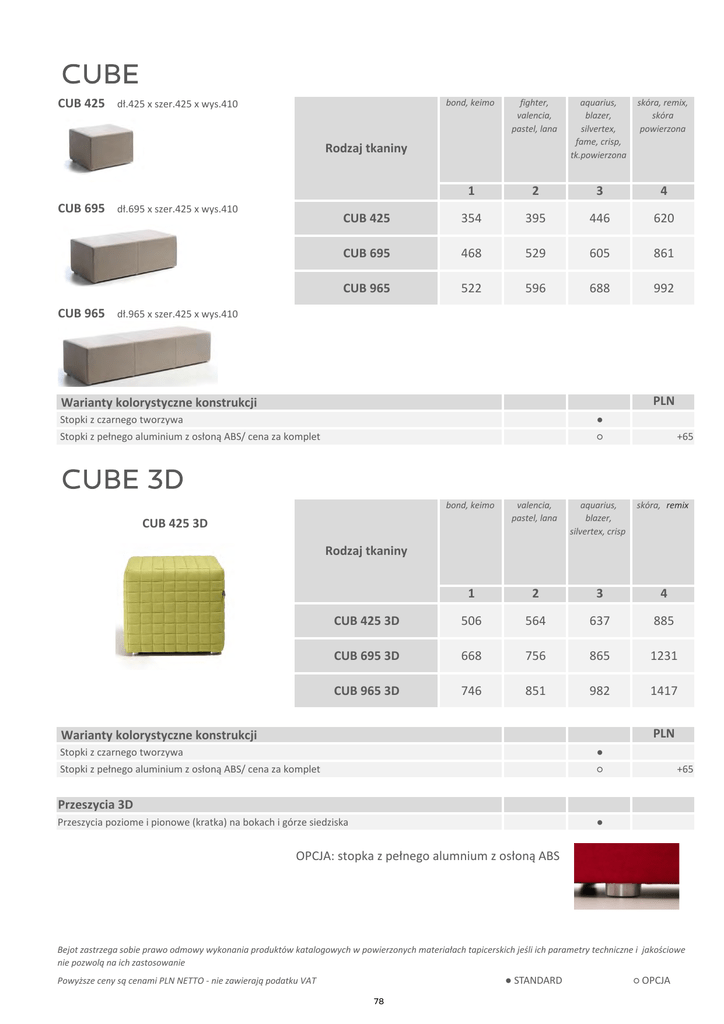 CUBE CUB 425 dł.425 x szer.425 x wys.410 bond, keimo fighter, valencia, pastel, lana aquarius, blazer, silvertex, fame, crisp, tk.powierzona skóra, remix, skóra powierzona 1 2 3 4 CUB 425 354 395 446 620 CUB 695 468 529 605 861 CUB 965 522 596 688 992 Rodzaj tkaniny CUB 695 dł.695 x szer.425 x wys.410 CUB 965 dł.965 x szer.425 x wys.410 PLN Warianty kolorystyczne konstrukcji Stopki z czarnego tworzywa ● Stopki z pełnego aluminium z osłoną ABS/ cena za komplet ○ +65 CUBE 3D bond, keimo valencia, pastel, lana aquarius, blazer, silvertex, crisp skóra, remix 1 2 3 4 CUB 425 3D 506 564 637 885 CUB 695 3D 668 756 865 1231 CUB 965 3D 746 851 982 1417 CUB 425 3D Rodzaj tkaniny PLN Warianty kolorystyczne konstrukcji Stopki z czarnego tworzywa ● Stopki z pełnego aluminium z osłoną ABS/ cena za komplet ○ +65 Przeszycia 3D Przeszycia poziome i pionowe (kratka) na bokach i górze siedziska ● OPCJA: stopka z pełnego alumnium z osłoną ABS Bejot zastrzega sobie prawo odmowy wykonania produktów katalogowych w powierzonych materiałach tapicerskich jeśli ich parametry techniczne i jakościowe nie pozwolą na ich zastosowanie ● STANDARD Powyższe ceny są cenami PLN NETTO - nie zawierają podatku VAT 78 ○ OPCJA