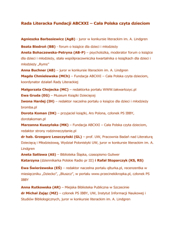 Rada Literacka Fundacji ABCXXI – Cała Polska czyta dzieciom Agnieszka Barbasiewicz (AgB) - juror w konkursie literackim im. A. Lindgren Beata Biedroń (BB) - forum o książce dla dzieci i młodzieży Aneta Bohaczewska-Petryna (AB-P) – psycholożka, moderator forum o książce dla dzieci i młodzieży, stała współpracowniczka kwartalnika o książkach dla dzieci i młodzieży „Ryms” Anna Buchner (AB) – juror w konkursie literackim im. A. Lindgren Magda Chmielewska (MCh) – Fundacja ABCXXI – Cała Polska czyta dzieciom, koordynator działań Rady Literackiej Małgorzata Chojecka (MC) – redaktorka portalu WWW.takwartozyc.pl Ewa Gruda (EG) – Muzeum Książki Dziecięcej Iwona Hardej (IH) – redaktor naczelna portalu o książce dla dzieci i młodzieży bromba.pl Dorota Koman (DK) – przyjaciel książki, Ars Polona, członek PS IBBY, dorotakoman.pl Marzanna Kuszyńska (MK) – Fundacja ABCXXI – Cała Polska czyta dzieciom, redaktor strony rodzinneczytanie.pl dr hab. Grzegorz Leszczyński (GL) – prof. UW, Pracownia Badań nad Literaturą Dziecięcą i Młodzieżową, Wydział Polonistyki UW, juror w konkursie literackim im. A. Lindgren Aneta Satława (AS) – Biblioteka Śląska, czasopismo Guliwer Katarzyna (dziennikarka Polskie Radio pr III) i Rafał Stoparczyk (KS, RS) Ewa Świerżewska (EŚ) – redaktor naczelna portalu qlturka.pl, recenzentka w miesięczniku „Dziecko”, „Bluszcz”, w portalu www.przecinekikropka.pl, członek PS IBBY Anna Rutkowska (AR) – Miejska Biblioteka Publiczna w Szczecinie dr Michał Zając (MZ) – członek PS IBBY, UW, Instytut Informacji Naukowej i Studiów Bibliologicznych, juror w konkursie literackim im. A. Lindgren