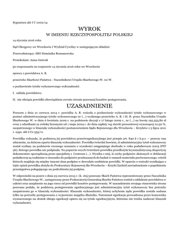 Sygnatura akt I C 1002/14 WYROK W IMIENIU RZECZYPOSPOLITEJ POLSKIEJ 14 stycznia 2016 roku Sąd Okręgowy we Wrocławiu I Wydział Cywilny w następującym składzie: Przewodniczący: SSO Dominika Romanowska Protokolant: Anna Gniwek po rozpoznaniu na rozprawie 14 stycznia 2016 roku we Wrocławiu sprawy z powództwa A. R. przeciwko Skarbowi Państwa - Naczelnikowi Urzędu Skarbowego W. we W. o pozbawienie tytułu wykonawczego wykonalności I. oddala powództwo; II. nie obciąża powódki obowiązkiem zwrotu stronie pozwanej kosztów postępowania. UZASADNIENIE Pozwem z dnia 21 czerwca 2014 r. powódka A. R. wniosła o pozbawienie wykonalności tytułu wykonawczego w postaci administracyjnego tytułu wykonawczego nr (...) wydanego przeciwko A. R. i H. R. przez Naczelnika Urzędu Skarbowego W. w dniu 6 kwietnia 2009 r. na podstawie decyzji z 17 lutego 2009 r., nr (...) na kwotę 195.553,80 zł wraz z odsetkami za zwłokę liczonymi od 1 maja 2004 r. do dnia zapłaty wg stawki procentowej wynoszącej 10,50 %, zaopatrzonego w klauzulę wykonalności postanowieniem Sądu Rejonowego dla Wrocławia – Krzyków z 5 lipca 2011 r. sygn. akt I Co 555/11. Powódka wskazała, że podstawą jej powództwa przeciwegzekucyjnego jest przepis art. 840 § 1 k.p.c. – przeczy ona zdarzeniu, na którym oparto klauzulę wykonalności. Powódka twierdzi bowiem, iż administracyjny tytuł wykonawczy został wydany na podstawie rocznego zeznania o wysokości osiągniętego dochodu w roku podatkowym 2003 (PIT 36), którego powódka nie podpisała. Na poparcie swych twierdzeń powódka przedłożyła kryminalistyczną ekspertyzę dokumentów sporządzoną przez specjalistę z Centrum (...). Wynika z niej, iż cechy podpisów złożonych w deklaracji podatkowej są rozbieżne w stosunku do podpisów przekazanych do badań w ramach materiału porównawczego, wśród których znajduje się między innymi skan podpisu w dowodzie osobistym powódki. W oparciu o wnioski wynikające z tejże opinii powódka złożyła do Prokuratury Rejonowej dla Wrocławia – Krzyki Zachód zawiadomienie o popełnieniu przestępstwa polegającego na podrobieniu jej podpisu. W odpowiedzi na pozew z dnia 23 czerwca 2015 r. (k. 165) pozwany Skarb Państwa reprezentowany przez Naczelnika Urzędu Skarbowego W., zastępowany przez Prokuratorię Generalną Skarbu Państwa wniósł o oddalenie powództwa w całości oraz zasądzenie na jego rzecz od powódki kosztów postępowania. W uzasadnieniu swojego stanowiska strona pozwana podała, że podstawą postępowania egzekucyjnego jest administracyjny tytuł wykonawczy bez potrzeby zaopatrzenia go w klauzulę wykonalności. Klauzula wykonalności, której uchylenia żąda powódka została nadana tylko na potrzeby postępowania o wyjawienie majątku dłużnika. Natomiast egzekucja prowadzona przez komornika wyznaczonego na skutek zbiegu egzekucji opiera się na tytule egzekucyjnym, któremu nie trzeba nadawać klauzuli wykonalności. Strona pozwana podniosła, że powódka w okresie od dnia doręczenia postanowienia o wszczęcia postępowania, tj. od dnia 11 lipca 2006 r. do dnia wydania decyzji podatkowej z dnia 17 lutego 2009 r. ani razu nie wskazywała na okoliczność sfałszowania jakichkolwiek dokumentów. Okoliczność rzekomego sfałszowania zeznania podatkowego z 2003 r. została zgłoszona przez powódkę organom ścigania dopiero po upływie 10 lat od złożenia tego dokumentu w Urzędzie Skarbowym. Przy tym z przedstawionej przez powódkę opinii biegłego nie wynika, że podpis powódki został sfałszowany, a jedynie że pomiędzy podpisem złożonym w zeznaniu podatkowym a materiałem przekazanym do badania występują cechy rozbieżne, przy założeniu że skanogram dowodowego podpisu nie został przerobiony graficznie. Strona pozwana wskazała, że tytuł egzekucyjny, którego pozbawienia wykonalności domaga się powódka, został wydany na podstawie ostatecznej i prawomocnej decyzji organu podatkowego. Z uwagi na brak drogi sądowej sąd nie może badać zasadności roszczenia objętego tytułem egzekucyjnym; do tego uprawniony jest wyłącznie organ administracyjny. Podważenie zobowiązania podatkowego może nastąpić wyłącznie w drodze postępowania podatkowego, w trybie nadzwyczajnych środków zaskarżenia. Strona pozwana wskazała, że powódka wniosła również w trybie przepisów administracyjnych o wznowienie postępowania zakończonego decyzją organu podstawowego, powołując się na sfałszowanie jej podpisu na zeznaniu rocznym PIT-36 za rok 2003. Organ podatkowy I instancji nie stwierdził jednak podstaw do uchylenia zaskarżonej decyzji, a Dyrektor Izby Skarbowej we W. w dniu 30 grudnia 2014 r. utrzymał w mocy zaskarżoną decyzję organu I instancji. Sąd ustalił następujący stan faktyczny: Na podstawie decyzji z 17 lutego 2009 r. Naczelnik Urzędu Skarbowego W. określił małżonkom – powódce Pani A. R. oraz Panu H. R. zobowiązanie podatkowe w podatku dochodowym od osób fizycznych za 2003 rok w wysokości 204.048 zł oraz odsetki za zwłoki od zaległości z tytułu niezapłaconych w terminie zaliczek na podatek dochodowy za 2003 r. dot. działalności gospodarczej prowadzonej przez Pana H. R. w wysokości 17.988 zł. W dniu 6 kwietnia 2009 r. Naczelnik Urzędu Skarbowego W. wystawił tytuł wykonawczy nr (...) na podstawie decyzji z dnia 17 lutego 2009 r. Dowód: - decyzja z dnia 17 lutego 2009 r., (...), k. 18 – 45 - tytuł wykonawczy nr(...), k. 15 – 17 Sąd Rejonowy dla Wrocławia-Krzyków, Wydział I Cywilny postanowieniem dnia 5 lipca 2011 r., wydanym w sprawie o sygn. akt I Co 55/11 nadał klauzulę wykonalności administracyjnemu tytułowi wykonawczemu nr (...) z dnia 6 kwietnia 2009 r., wystawionemu przez Naczelnika Urzędu Skarbowego W. przeciwko H. R. i A. R. – celem wystąpienia przez wierzyciela z wnioskiem o wyjawienie majątku. Dowód: - postanowienie Sądu Rejonowego dla Wrocławia-Krzyków z 5 lipca 2011 r. wraz z uzasadnie