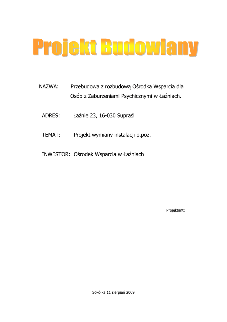 NAZWA: Przebudowa z rozbudow¹ Oœrodka Wsparcia dla Osób z Zaburzeniami Psychicznymi w £aêniach. ADRES: £aênie 23, 16-030 Supraœl TEMAT: Projekt wymiany instalacji p.po¿. INWESTOR: Oœrodek Wsparcia w £aêniach Projektant: Sokóùka 11 sierpieñ 2009 Opis techniczny Do projektu wymiany instalacji p.po¿ w budynku Oœrodka Wsparcia w £aêniach 1. Podstawa opracowania Umowa z inwestorem Podkùady architektury z elementami wyposa¿enia technologicznego Obowi¹zuj¹ce normy i przepisy BHP Zakres opracowania: Projekt obejmuje wykonanie: - wymiany instalacji p.po¿ 1. Instalacja p.po¿ Instalacjê wykonaã przewodem YnTKSYekw 1x2x0,8mm2 prowadzonym w bruzdach sufitu i œcian. Przewidziano zainstalowanie izotopowych czujek dymu. W portierni zainstalowana jest Centrala Polon-Alfa 4200, Centrala POLON 4200 jest zalecana do ochrony przeciwpo¿arowej ro¿nego rodzaju obiektów, niedu¿ych lub œredniej wielkoœci, Mo¿liwoœã adresowania elementów liniowych pozwala na identyfikacjê miejsca powstania po¿aru z dokùadnoœci¹ do pojedynczej czujki. Uwagi koñcowe: Caùoœã prac wykonaã zgodnie z obowi¹zuj¹cymi przepisami BHP i Polskimi Normami. Po wykonaniu instalacji oœwietleniowej wykonaã pomiary ochronne. Autor projektu: Plan Bezpieczeñstwa i Ochrony Zdrowia Przy wymianie instalacji p.po¿ Oœrodka Wsparcia w £aêniach Adres budowy: £aênie gm. Supraœl Inwestor: Oœrodek Wsparcia £aênie Autor opracowania: Józef Sarosiek upr. Bù. 292/92 Podstawa opracowania: Dz.U.03.120.1126. Rozporz¹dzenie Ministra Infrastruktury z dnia 23.06.2003r w sprawie informacji dotycz¹cej bezpieczeñstwa i ochrony zdrowia oraz planu bezpieczeñstwa i ochrony zdrowia ( Dz. U. z dnia `10 lipca 2003r). Na podstawie art.21a ustawy z dnia lipca 1994r – Prawo Budowlane(Dz.U. z 2000r Nr 106 poz1126 z póêniejszymi zmianami) 1. ZAKRES ROBÓT DLA CA£EGO ZAMIERZENIA BUDOWLANEGO ORAZ KOLEJNOÚà REALIZACJI POSZCZEGÓLNYCH OBIEKTÓW. Zakres robót obejmuje budowê wykonanie instalacji oœwietlenia zewnêtrznego Kolejnoœã realizacji poszczególnych prac powinna wynikaã z harmonogramu robót sporz¹dzonego przez kierownika budowy. 2. WYKAZ ISTNIEJ¥CYCH OBIEKTÓW BUDOWLANYCH. Na placu budowy projektowanej instalacji wystêpuj¹: - istniej¹ca instalacja elektryczna 3. WYKAZ ELEMENTÓW ZAGOSPODAROWANIA TERENU, KTÓRE MOG¥ STWARZAà ZAGROÝENIE BEZPIECZÆÑSTWA I OCHRONY ZDROWIA. a) praca na wysokoœci – upadek b) linie elektroenergetyczne – pora¿enie pr¹dem elektrycznym 4. WSKAZANIE DOTYCZ¥CE PRZEWIDYWANYCH ZAGROÝEÑ WYSTÆPUJ¥CYCH PODCZAS REALIZACJIROBÓT BUDOWLANYCH OKREÚLAJ¥CYCH SKALÆ I RODZAJE ZAGROÝEÑORAZ MIEJSCE I CZAS ICH WYSTÆPOWANIA a) upadek z wysokoœci – przy monta¿u przewodów oraz opraw na wysokoœci u¿yã œrodków zabezpieczaj¹cych b) pora¿enie pr¹dem elektrycznym- przy monta¿u kabli prace wykonywaã po wyù¹czeniu spod napiêcia. 5. WSKAZANIE SPOSOBU PROWADZENIA INSTRUKTAÝU PRACOWNIKÓW PRZED PRZYST¥PIENIEM DO REALIZACJI ROBÓT SZCZEGÓLNIE NIEBEZPIECZNYCH. Niniejsze prace winni wykonywaã pracownicy posiadaj¹cy odpowiednie uprawnienia do wykonywania tego rodzaju prac. Wszystkie prace w pobli¿u i na czynnych urz¹dzeniach elektrycznych mog¹ byã wykonywane tylko i wyù¹cznie po wyù¹czeniu napiêcia Pracownicy przystêpuj¹cy do pracy winni byã ubrani w ubrania robocze, kaski ochronne, rêkawice robocze. 6. WSKAZANIERODKÓW TECHNICZNYCH I ORGANIZACYJNYCH ZAPOBIEGAJACYCH NIEBEZPIECZEÑSTWOM WYNIKAJ¥CYM Z WYKONYWANIA ROBÓT BUDOWLANYCH: -Na placu budowy nale¿y umieœciã tablicê informacyjn¹ zabraniaj¹c¹ wstêpu w strefie pracy. - teren budowy w godzinach wieczornych oœwietliã - teren budowy po zakoñczeniu prac monta¿owych doprowadziã do stanu poprzedniego. Opracowaù: