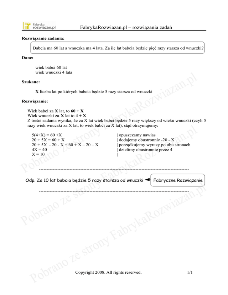 FabrykaRozwiazan.pl – rozwiązania zadań Rozwiązanie zadania: Babcia ma 60 lat a wnuczka ma 4 lata. Za ile lat babcia będzie pięć razy starsza od wnuczki? Dane: wiek babci 60 lat wiek wnuczki 4 lata Szukane: X liczba lat po których babcia będzie 5 razy starsza od wnuczki Rozwiązanie: Wiek babci za X lat, to 60 + X Wiek wnuczki za X lat to 4 + X Z treści zadania wynika, że za X lat wiek babci będzie 5 razy większy od wieku wnuczki (czyli 5 razy wiek wnuczki za X lat, to wiek babci za X lat), stąd otrzymujemy: 5(4+X) = 60 +X 20 + 5X = 60 + X 20 + 5X - 20 - X = 60 + X – 20 – X 4X = 40 X = 10 | opuszczamy nawias | dodajemy obustronnie -20 - X | porządkujemy wyrazy po obu stronach | dzielimy obustronnie przez 4 | -------------------------------------------------------------------------------------------------Odp. Za 10 lat babcia będzie 5 razy starsza od wnuczki Fabryczne Rozwiązanie -------------------------------------------------------------------------------------------------- Copyright 2008. All rights reserved. 1/1