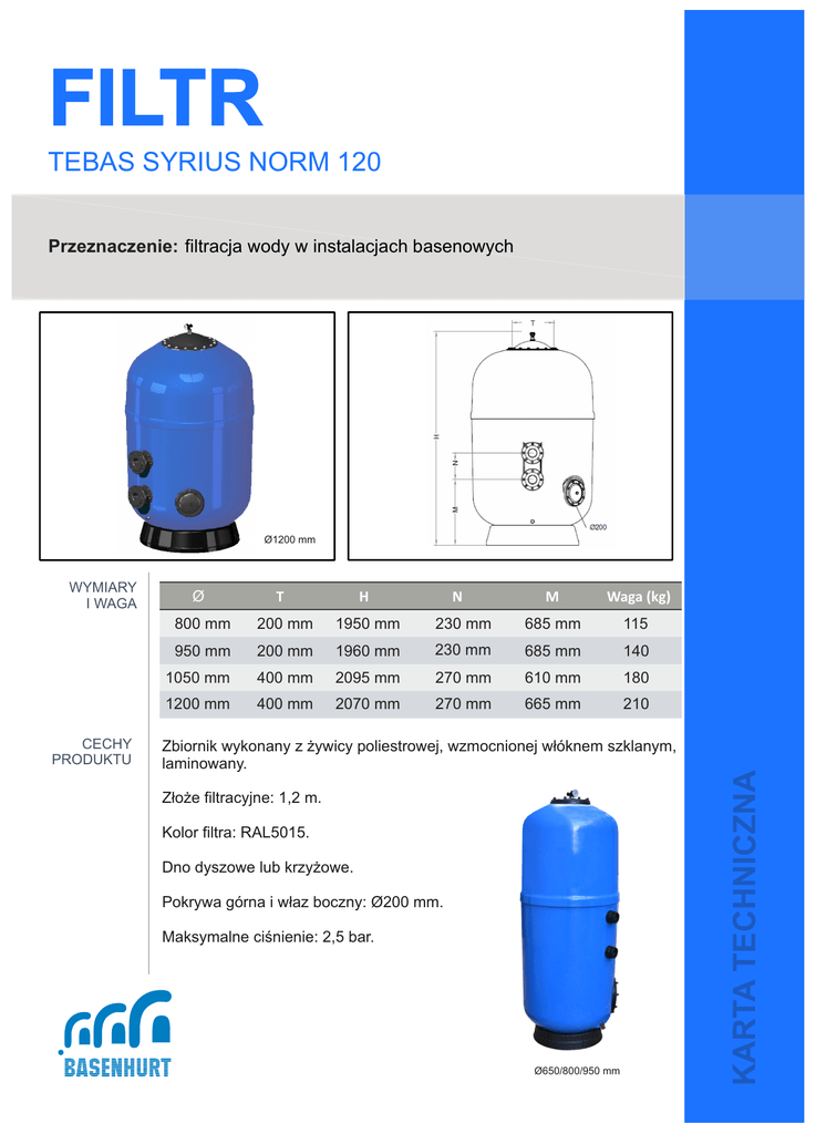 FILTR TEBAS SYRIUS NORM 120 Przeznaczenie: filtracja wody w instalacjach basenowych Ø1200 mm WYMIARY I WAGA CECHY PRODUKTU Ø T H N M Waga (kg) 800 mm 200 mm 1950 mm 230 mm 685 mm 115 950 mm 200 mm 1960 mm 230 mm 685 mm 140 1050 mm 400 mm 2095 mm 270 mm 610 mm 180 1200 mm 400 mm 2070 mm 270 mm 665 mm 210 Zbiornik wykonany z żywicy poliestrowej, wzmocnionej włóknem szklanym, laminowany. Złoże filtracyjne: 1,2 m. Kolor filtra: RAL5015. Dno dyszowe lub krzyżowe. Pokrywa górna i właz boczny: Ø200 mm. Maksymalne ciśnienie: 2,5 bar. Ø650/800/950 mm FILTR TEBAS SYRIUS NORM 120 W ZESTAWIE wyposażony w dno krzyżowe lub dyszowe odporny na korozję przystosowany do pracy z wodą słoną dostarczany w komplecie z zaworem 6-drogowym (dot. Ø800-950 mm) manometr, odpowietrznik, korek spustu wody ¼" ● górny otwór/zasyp piasku, pokrywa o średnicy 200 mm ● właz boczny, pokrywa o średnicy 200 mm ● możliwość podłączenia zaworu automatycznego oraz słupowego ● solidna podstawa ● temperatura pracy do maks. 50°C ● podłączenie kołnierzowe przy Ø1200 mm ● ● ● ● ● OPCJE DODATKOWE: ● właz boczny o średnicy 400 mm ● wziernik DANE średnica przyłącza dno krzyżowe dno dyszowe KOD ilość pow. przepływ przepływ maks. piasku filtracyjna ciśnienie 0,4-0,8 mm 2 3 3 (m ) (kg) (m /h) (m /h/m2) (bar) ilość żwiru (kg) (mm) (cal) 04012 800 2" 0,50 25 50 2,5 660 70 04014 950 2" 0,70 36 50 2,5 1015 100 04015 1050 2½" 0,86 44 50 2,5 1240 120 04016 1200 3" 1,13 57 50 2,5 1665 160 04012k 800 2" 0,50 25 50 2,5 660 165 04014k 950 2" 0,70 36 50 2,5 1015 260 04015k 1050 2½" 0,86 44 50 2,5 1240 120 04016k 1200 3" 1,13 57 50 2,5 1665 410