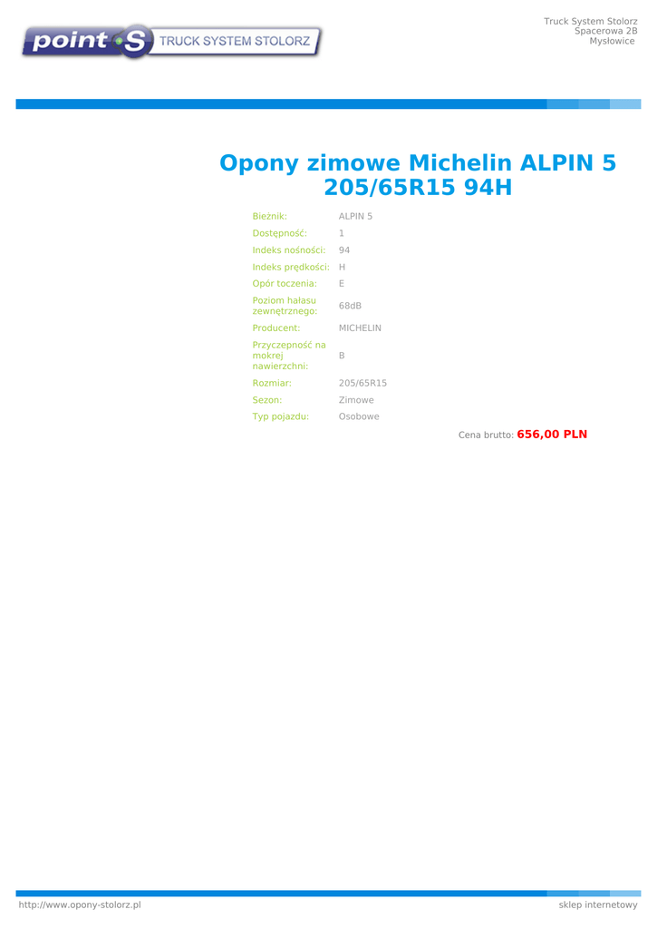 Truck System Stolorz Spacerowa 2B Mysłowice Opony zimowe Michelin ALPIN 5 205/65R15 94H Bieżnik: ALPIN 5 Dostępność: 1 Indeks nośności: 94 Indeks prędkości: H Opór toczenia: E Poziom hałasu zewnętrznego: 68dB Producent: MICHELIN Przyczepność na mokrej nawierzchni: B Rozmiar: 205/65R15 Sezon: Zimowe Typ pojazdu: Osobowe Cena brutto: http://www.opony-stolorz.pl 656,00 PLN sklep internetowy