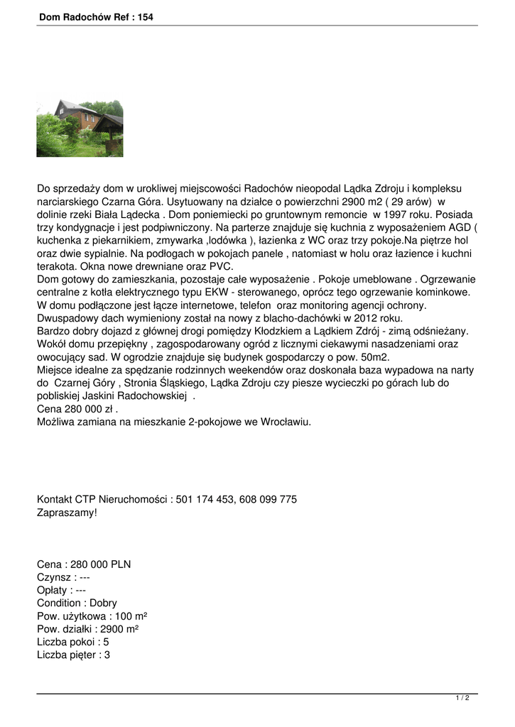 Dom Radochów Ref : 154 Do sprzedaży dom w urokliwej miejscowości Radochów nieopodal Lądka Zdroju i kompleksu narciarskiego Czarna Góra. Usytuowany na działce o powierzchni 2900 m2 ( 29 arów) w dolinie rzeki Biała Lądecka . Dom poniemiecki po gruntownym remoncie w 1997 roku. Posiada trzy kondygnacje i jest podpiwniczony. Na parterze znajduje się kuchnia z wyposażeniem AGD ( kuchenka z piekarnikiem, zmywarka ,lodówka ), łazienka z WC oraz trzy pokoje.Na piętrze hol oraz dwie sypialnie. Na podłogach w pokojach panele , natomiast w holu oraz łazience i kuchni terakota. Okna nowe drewniane oraz PVC. Dom gotowy do zamieszkania, pozostaje całe wyposażenie . Pokoje umeblowane . Ogrzewanie centralne z kotła elektrycznego typu EKW - sterowanego, oprócz tego ogrzewanie kominkowe. W domu podłączone jest łącze internetowe, telefon oraz monitoring agencji ochrony. Dwuspadowy dach wymieniony został na nowy z blacho-dachówki w 2012 roku. Bardzo dobry dojazd z głównej drogi pomiędzy Kłodzkiem a Lądkiem Zdrój - zimą odśnieżany. Wokół domu przepiękny , zagospodarowany ogród z licznymi ciekawymi nasadzeniami oraz owocujący sad. W ogrodzie znajduje się budynek gospodarczy o pow. 50m2. Miejsce idealne za spędzanie rodzinnych weekendów oraz doskonała baza wypadowa na narty do Czarnej Góry , Stronia Śląskiego, Lądka Zdroju czy piesze wycieczki po górach lub do pobliskiej Jaskini Radochowskiej . Cena 280 000 zł . Możliwa zamiana na mieszkanie 2-pokojowe we Wrocławiu. Kontakt CTP Nieruchomości : 501 174 453, 608 099 775 Zapraszamy! Cena : 280 000 PLN Czynsz : --Opłaty : --Condition : Dobry Pow. użytkowa : 100 m² Pow. działki : 2900 m² Liczba pokoi : 5 Liczba pięter : 3 1/2 Dom Radochów Ref : 154 Liczba łazienek : 1 Liczba toalet : 1 Gorąca woda : Piec kondensacyjny Ogrzewanie : Piec kondensacyjny Data dostepności : 2016-07-14 Zalety : - piwnica strych prąd woda telefon umeblowane oddzielna kuchnia pomieszczenie użytkowe okna plastikowe Adres : Radochów, RADOCHóW http://www.ctpnieruchomosci.pl/component/jea/72-dom-w-radochowie-okolice-czarnej-gory?for mat=pdf 2/2