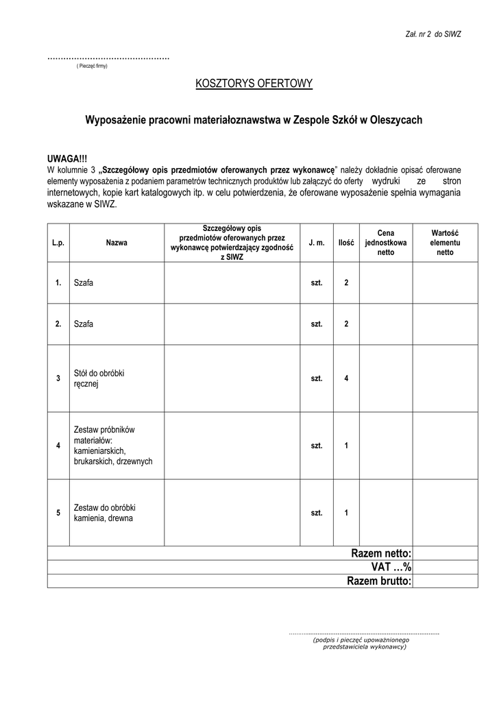 Zał. nr 2 do SIWZ .............................................. ( Pieczęć firmy) KOSZTORYS OFERTOWY Wyposażenie pracowni materiałoznawstwa w Zespole Szkół w Oleszycach UWAGA!!! W kolumnie 3 „Szczegółowy opis przedmiotów oferowanych przez wykonawcę” należy dokładnie opisać oferowane elementy wyposażenia z podaniem parametrów technicznych produktów lub załączyć do oferty wydruki ze stron internetowych, kopie kart katalogowych itp. w celu potwierdzenia, że oferowane wyposażenie spełnia wymagania wskazane w SIWZ. L.p. Nazwa Szczegółowy opis przedmiotów oferowanych przez wykonawcę potwierdzający zgodność z SIWZ J. m. Ilość 1. Szafa szt. 2 2. Szafa szt. 2 3 Stół do obróbki ręcznej szt. 4 4 Zestaw próbników materiałów: kamieniarskich, brukarskich, drzewnych szt. 1 5 Zestaw do obróbki kamienia, drewna szt. 1 Cena jednostkowa netto Wartość elementu netto Razem netto: VAT …% Razem brutto: ………..……………………………………………………………… (podpis i pieczęć upoważnionego przedstawiciela wykonawcy)