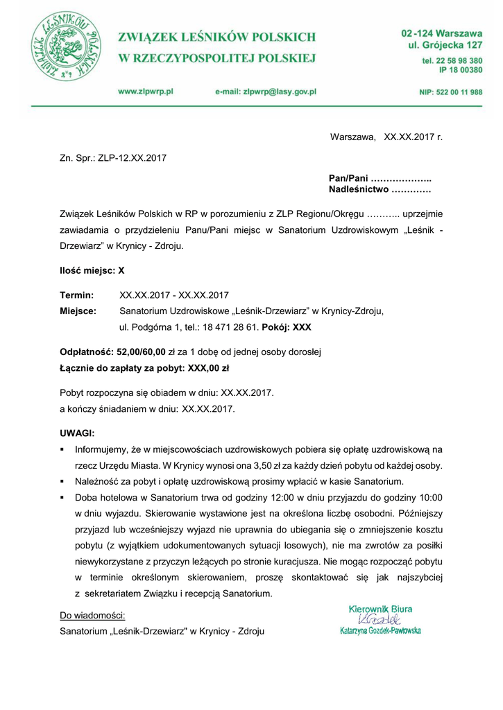 Warszawa, XX.XX.2017 r. Zn. Spr.: ZLP-12.XX.2017 Pan/Pani ……………….. Nadleśnictwo …………. Związek Leśników Polskich w RP w porozumieniu z ZLP Regionu/Okręgu ……….. uprzejmie zawiadamia o przydzieleniu Panu/Pani miejsc w Sanatorium Uzdrowiskowym „Leśnik Drzewiarz” w Krynicy - Zdroju. Ilość miejsc: X Termin: XX.XX.2017 - XX.XX.2017 Miejsce: Sanatorium Uzdrowiskowe „Leśnik-Drzewiarz” w Krynicy-Zdroju, ul. Podgórna 1, tel.: 18 471 28 61. Pokój: XXX Odpłatność: 52,00/60,00 zł za 1 dobę od jednej osoby dorosłej Łącznie do zapłaty za pobyt: XXX,00 zł Pobyt rozpoczyna się obiadem w dniu: XX.XX.2017. a kończy śniadaniem w dniu: XX.XX.2017. UWAGI: Informujemy, że w miejscowościach uzdrowiskowych pobiera się opłatę uzdrowiskową na rzecz Urzędu Miasta. W Krynicy wynosi ona 3,50 zł za każdy dzień pobytu od każdej osoby. Należność za pobyt i opłatę uzdrowiskową prosimy wpłacić w kasie Sanatorium. Doba hotelowa w Sanatorium trwa od godziny 12:00 w dniu przyjazdu do godziny 10:00 w dniu wyjazdu. Skierowanie wystawione jest na określona liczbę osobodni. Późniejszy przyjazd lub wcześniejszy wyjazd nie uprawnia do ubiegania się o zmniejszenie kosztu pobytu (z wyjątkiem udokumentowanych sytuacji losowych), nie ma zwrotów za posiłki niewykorzystane z przyczyn leżących po stronie kuracjusza. Nie mogąc rozpocząć pobytu w terminie określonym skierowaniem, proszę skontaktować się jak najszybciej z sekretariatem Związku i recepcją Sanatorium. Do wiadomości: Sanatorium „Leśnik-Drzewiarz" w Krynicy - Zdroju