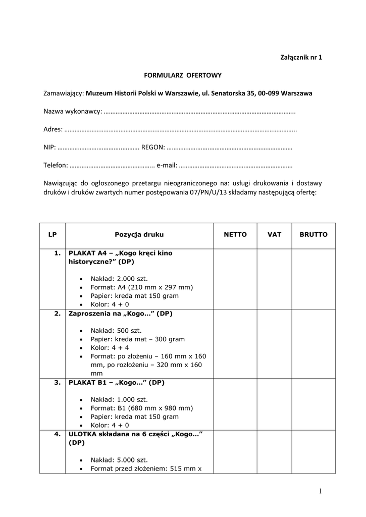 1 Załącznik nr 1 FORMULARZ OFERTOWY Zamawiający: Muzeum