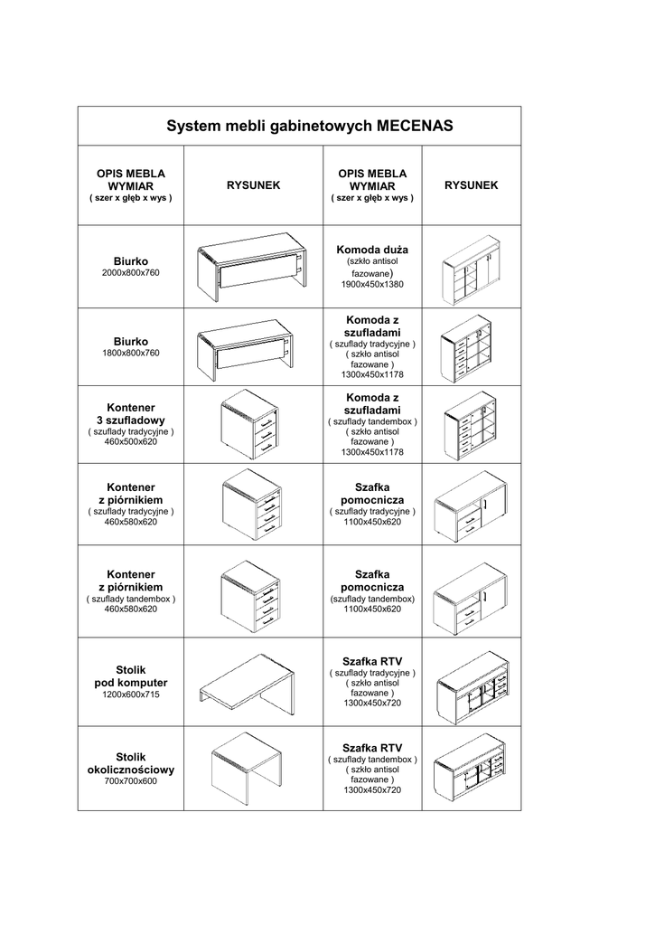 System mebli gabinetowych MECENAS OPIS MEBLA WYMIAR ( szer x głęb x wys ) Biurko 2000x800x760 Biurko 1800x800x760 Kontener 3 szufladowy RYSUNEK OPIS MEBLA WYMIAR ( szer x głęb x wys ) Komoda duża (szkło antisol fazowane) 1900x450x1380 Komoda z szufladami ( szuflady tradycyjne ) ( szkło antisol fazowane ) 1300x450x1178 Komoda z szufladami ( szuflady tradycyjne ) 460x500x620 ( szuflady tandembox ) ( szkło antisol fazowane ) 1300x450x1178 Kontener z piórnikiem Szafka pomocnicza ( szuflady tradycyjne ) 460x580x620 ( szuflady tradycyjne ) 1100x450x620 Kontener z piórnikiem Szafka pomocnicza ( szuflady tandembox ) 460x580x620 (szuflady tandembox) 1100x450x620 Stolik pod komputer ( szuflady tradycyjne ) ( szkło antisol fazowane ) 1300x450x720 1200x600x715 Stolik okolicznościowy 700x700x600 Szafka RTV Szafka RTV ( szuflady tandembox ) ( szkło antisol fazowane ) 1300x450x720 RYSUNEK Stół konferencyjny Szafa aktowa 2000x1000x760 900x450x1860 Stół konferencyjny Szafa aktowoodzieżowa 1800x1000x760 Zestaw szaf ( szkło antisol fazowane ) 1800x450x1860 900x450x1860 Biblioteczka (szkło antisol fazowane) 900x450x1860 * wymiary gabarytowe