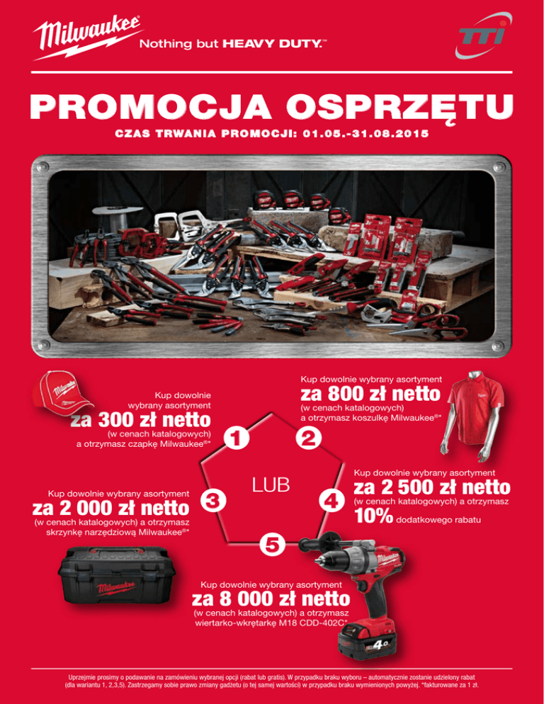PROMOCJA OSPRZĘTU C Z A S T RWA N I A P R O M O C J I : 0 1 . 0 5 . - 3 1 . 0 8 . 2 0 1 5 Kup dowolnie wybrany asortyment za 800 zł netto Kup dowolnie wybrany asortyment za 300 zł netto (w cenach katalogowych) a otrzymasz czapkę Milwaukee®* za 2 000 zł netto 3 Kup dowolnie wybrany asortyment (w cenach katalogowych) a otrzymasz skrzynkę narzędziową Milwaukee®* (w cenach katalogowych) a otrzymasz koszulkę Milwaukee®* 1 2 LUB Kup dowolnie wybrany asortyment za 2 500 zł netto 4 10% (w cenach katalogowych) a otrzymasz dodatkowego rabatu 5 Kup dowolnie wybrany asortyment za 8 000 zł netto (w cenach katalogowych) a otrzymasz wiertarko-wkrętarkę M18 CDD-402C* Uprzejmie prosimy o podawanie na zamówieniu wybranej opcji (rabat lub gratis). W przypadku braku wyboru – automatycznie zostanie udzielony rabat (dla wariantu 1, 2,3,5). Zastrzegamy sobie prawo zmiany gadżetu (o tej samej wartości) w przypadku braku wymienionych powyżej. *fakturowane za 1 zł. Kup nóż z metalową rękojeścią - 6 sztuk (4932352622) i nóż z rękojeścią Heavy Duty (4932352626) - 6 sztuk a otrzymasz nożyk z mechanizmem cofającym ostrza za 1 zł* Cena zestawu 455,72 zł + 1 zł (nożyk z mechanizmem cofającym ostrza) Kup dowolne 3 opakowania miarek a otrzymasz 10% dodatkowego rabatu Kup 2 opakowania markerów ze standardową końcówką (48223100) oraz 2 opakowania markerów kolorowych (48223106) a otrzymasz 5% dodatkowego rabatu *fakturowane za 1 zł A&M Elektronarzędzia Sp.z o.o. • Tel. 022-3799483-84
