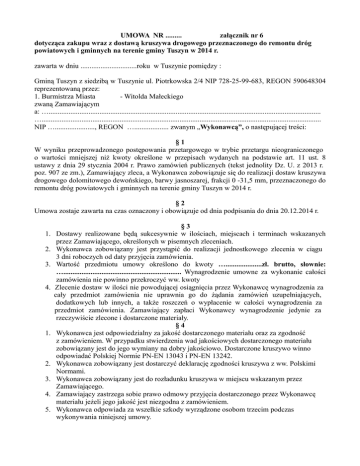 UMOWA NR ......... załącznik nr 6 dotycząca zakupu wraz z dostawą kruszywa drogowego przeznaczonego do remontu dróg powiatowych i gminnych na terenie gminy Tuszyn w 2014 r. zawarta w dniu ...............................roku w Tuszynie pomiędzy : Gminą Tuszyn z siedzibą w Tuszynie ul. Piotrkowska 2/4 NIP 728-25-99-683, REGON 590648304 reprezentowaną przez: 1. Burmistrza Miasta - Witolda Małeckiego zwaną Zamawiającym a: …...................................................................................................................................................... ….......................................................................................................................................................... NIP …......................, REGON …................... zwanym „Wykonawcą”, o następującej treści: §1 W wyniku przeprowadzonego postępowania przetargowego w trybie przetargu nieograniczonego o wartości mniejszej niż kwoty określone w przepisach wydanych na podstawie art. 11 ust. 8 ustawy z dnia 29 stycznia 2004 r. Prawo zamówień publicznych (tekst jednolity Dz. U. z 2013 r. poz. 907 ze zm.), Zamawiający zleca, a Wykonawca zobowiązuje się do realizacji dostaw kruszywa drogowego dolomitowego dewońskiego, barwy jasnoszarej, frakcji 0 -31,5 mm, przeznaczonego do remontu dróg powiatowych i gminnych na terenie gminy Tuszyn w 2014 r. §2 Umowa zostaje zawarta na czas oznaczony i obowiązuje od dnia podpisania do dnia 20.12.2014 r. §3 1. Dostawy realizowane będą sukcesywnie w ilościach, miejscach i terminach wskazanych przez Zamawiającego, określonych w pisemnych zleceniach. 2. Wykonawca zobowiązany jest przystąpić do realizacji jednostkowego zlecenia w ciągu 3 dni roboczych od daty przyjęcia zamówienia. 3. Wartość przedmiotu umowy określono do kwoty …....................zł. brutto, słownie: …................................................................. Wynagrodzenie umowne za wykonanie całości zamówienia nie powinno przekroczyć ww. kwoty 4. Zlecenie dostaw w ilości nie powodującej osiągnięcia przez Wykonawcę wynagrodzenia za cały przedmiot zamówienia nie uprawnia go do żądania zamówień uzupełniających, dodatkowych lub innych, a także roszczeń o wypłacenie w całości wynagrodzenia za przedmiot zamówienia. Zamawiający zapłaci Wykonawcy wynagrodzenie jedynie za rzeczywiście zlecone i dostarczone materiały. §4 1. Wykonawca jest odpowiedzialny za jakość dostarczonego materiału oraz za zgodność z zamówieniem. W przypadku stwierdzenia wad jakościowych dostarczonego materiału zobowiązany jest do jego wymiany na dobry jakościowo. Dostarczone kruszywo winno odpowiadać Polskiej Normie PN-EN 13043 i PN-EN 13242. 2. Wykonawca zobowiązany jest dostarczyć deklarację zgodności kruszywa z ww. Polskimi Normami. 3. Wykonawca zobowiązany jest do rozładunku kruszywa w miejscu wskazanym przez Zamawiającego. 4. Zamawiający zastrzega sobie prawo odmowy przyjęcia dostarczonego przez Wykonawcę materiału jeżeli jego jakość jest niezgodna z zamówieniem. 5. Wykonawca odpowiada za wszelkie szkody wyrządzone osobom trzecim podczas wykonywania niniejszej umowy. - 2 §5 1. Strony ustalają następujące wynagrodzenie wg następujących cen jednostkowych: dolomit dewoński mieszanka kruszyw frakcji 0 – 31,5 mm 1 tona …........zł. netto + należny podatek VAT wg. stawki na dzień podpisania umowy w wysokości …..... …........zł. brutto 2. Wyklucza się możliwość zmiany cen bez względu na warunki i okoliczności jakie będą miały miejsce w okresie obowiązywania niniejszej umowy. §6 1. Rozliczenie z Wykonawcą nastąpi fakturami częściowymi po zrealizowaniu dostaw objętych jednostkowym zleceniem. 2. Zamawiający ureguluje należności w terminie do 30 dni od daty otrzymania prawidłowo wystawionej faktury przelewem na wskazany w fakturze rachunek bankowy Wykonawcy. 3. Za datę zapłaty uznaje się dzień obciążenia rachunku bankowego Zamawiającego. §7 1. Obowiązującą formą odszkodowania uzgodnioną między stronami będą kary umowne. Wykonawca zapłaci Zamawiającemu kary umowne w następujących przypadkach: 1) Za zwłokę w przystąpieniu do realizacji określonych w zleceniu dostaw w wysokości 0,5 % wynagrodzenia brutto za całość określonego w jednostkowym zleceniu zamówienia za każdy dzień zwłoki. 2) Za zwłokę w wykonaniu określonych w zleceniu dostaw w wysokości 0,5% wynagrodzenia brutto za całość określonego w jednostkowym zleceniu zamówienia, za każdy dzień zwłoki. 2. W przypadku opóźnienia w realizacji dostaw przekraczającego 10 dni roboczych Zamawiający ma prawo do odstąpienia od umowy bez wypowiedzenia. 3. Zamawiający zapłaci Wykonawcy odsetki ustawowe za każdy dzień zwłoki w zapłacie faktury. 4. Zamawiający zastrzega sobie prawo do potrącenia kar umownych z przedłożonych do zapłaty faktur, a Wykonawca niniejszym wyraża na to zgodę. 5. Strony mogą dochodzić na zasadach ogólnych odszkodowań przewyższających kary umowne. §8 1. Wszelkie zmiany niniejszej umowy wymagają formy pisemnej pod rygorem nieważności. 2. Nieważne z mocy ustawy Prawo zamówień publicznych są istotne zmiany niniejszej umowy w stosunku do treści oferty, na podstawie której dokonano wyboru Wykonawcy §9 1. Zamawiającemu przysługuje również prawo do odstąpienia od umowy bez wypowiedzenia w przypadku stwierdzenia powtarzającego się nienależytego wywiązania się Wykonawcy w zakresie jakości dostarczanego materiału. 2. W razie zaistnienia istotnej zmiany okoliczności powodującej, że wykonanie umowy nie leży w interesie publicznym, czego nie można było przewidzieć w chwili zawarcia umowy, Zamawiający może odstąpić od umowy w terminie 14 dni od powzięcia wiadomości o tych okolicznościach. 3. Zamawiający jest zobowiązany do zapłaty za materiały dostarczone do dnia odstąpienia od umowy. - 3 § 10 Właściwym do rozpoz