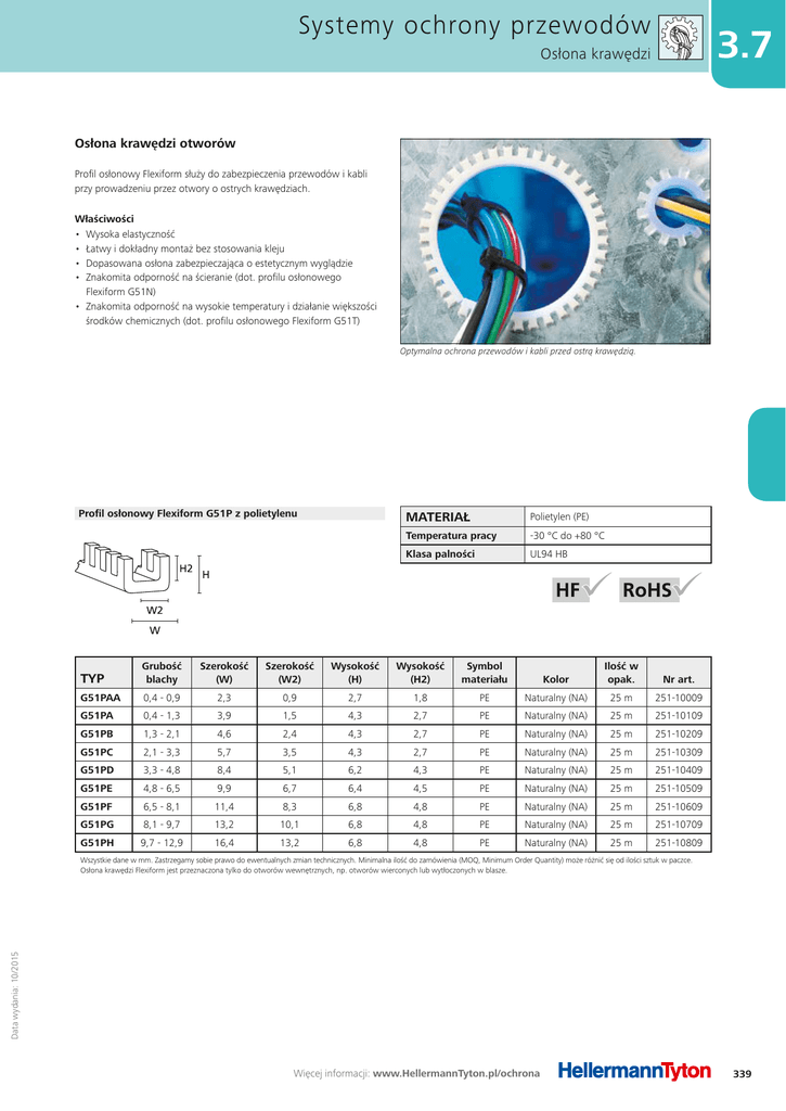 Systemy ochrony przewodów 3.7 Osłona krawędzi Osłona krawędzi otworów Profil osłonowy Flexiform służy do zabezpieczenia przewodów i kabli przy prowadzeniu przez otwory o ostrych krawędziach. Właściwości • Wysoka elastyczność • Łatwy i dokładny montaż bez stosowania kleju • Dopasowana osłona zabezpieczająca o estetycznym wyglądzie • Znakomita odporność na ścieranie (dot. profilu osłonowego Flexiform G51N) • Znakomita odporność na wysokie temperatury i działanie większości środków chemicznych (dot. profilu osłonowego Flexiform G51T) Optymalna ochrona przewodów i kabli przed ostrą krawędzią. Profil osłonowy Flexiform G51P z polietylenu MATERIAŁ Polietylen (PE) Temperatura pracy -30 °C do +80 °C Klasa palności UL94 HB TYP Grubość blachy Szerokość (W) Szerokość (W2) Wysokość (H) Wysokość (H2) Symbol materiału Kolor Ilość w opak. Nr art. G51PAA 0,4 - 0,9 2,3 0,9 2,7 1,8 PE Naturalny (NA) 25 m 251-10009 G51PA 0,4 - 1,3 3,9 1,5 4,3 2,7 PE Naturalny (NA) 25 m 251-10109 G51PB 1,3 - 2,1 4,6 2,4 4,3 2,7 PE Naturalny (NA) 25 m 251-10209 G51PC 2,1 - 3,3 5,7 3,5 4,3 2,7 PE Naturalny (NA) 25 m 251-10309 G51PD 3,3 - 4,8 8,4 5,1 6,2 4,3 PE Naturalny (NA) 25 m 251-10409 G51PE 4,8 - 6,5 9,9 6,7 6,4 4,5 PE Naturalny (NA) 25 m 251-10509 G51PF 6,5 - 8,1 11,4 8,3 6,8 4,8 PE Naturalny (NA) 25 m 251-10609 G51PG 8,1 - 9,7 13,2 10,1 6,8 4,8 PE Naturalny (NA) 25 m 251-10709 G51PH 9,7 - 12,9 16,4 13,2 6,8 4,8 PE Naturalny (NA) 25 m 251-10809 Data wydania: 10/2015 Wszystkie dane w mm. Zastrzegamy sobie prawo do ewentualnych zmian technicznych. Minimalna ilość do zamówienia (MOQ, Minimum Order Quantity) może różnić się od ilości sztuk w paczce. Osłona krawędzi Flexiform jest przeznaczona tylko do otworów wewnętrznych, np. otworów wierconych lub wytłoczonych w blasze. Więcej informacji: www.HellermannTyton.pl/ochrona 339 Systemy ochrony przewodów 3.7 Osłona krawędzi Osłona krawędzi otworów Profil osłonowy Flexiform G51N z poliamidu 6 MATERIAŁ Poliamid 6 (PA6) Temperatura pracy -60 °C do +95 °C Klasa palności UL94 HB Dopuszczenia NASM21266, NSA939510, PAN6480 TYP Grubość blachy Szerokość (W) Szerokość (W2) Wysokość (H) Wysokość (H2) Symbol materiału Kolor Ilość w opak. Nr art. G51NA 0,4 - 1,3 3,9 1,5 4,3 2,7 PA6 Naturalny (NA) 25 m 251-21109 G51NB 1,3 - 2,1 4,6 2,4 4,3 2,7 PA6 Naturalny (NA) 25 m 251-21209 G51NC 2,1 - 3,3 5,7 3,5 4,3 2,7 PA6 Naturalny (NA) 25 m 251-21309 G51ND 3,3 - 4,8 8,4 5,1 6,2 4,3 PA6 Naturalny (NA) 25 m 251-21409 G51NE 4,8 - 6,5 9,9 6,7 6,4 4,5 PA6 Naturalny (NA) 25 m 251-21509 G51NF 6,5 - 8,1 11,4 8,3 6,8 4,8 PA6 Naturalny (NA) 25 m 251-21609 G51NG 8,1 - 9,7 13,2 10,1 6,8 4,8 PA6 Naturalny (NA) 25 m 251-21709 G51NH 9,7 - 12,9 16,4 13,2 6,8 4,8 PA6 Naturalny (NA) 25 m 251-21809 Wszystkie dane w mm. Zastrzegamy sobie prawo do ewentualnych zmian technicznych. Minimalna ilość do zamówienia (MOQ, Minimum Order Quantity) może różnić się od ilości sztuk w paczce. Osłona krawędzi Flexiform jest przeznaczona tylko do otworów wewnętrznych, np. otworów wierconych lub wytłoczonych w blasze. NASM Profil osłonowy Flexiform G51T PTFE MATERIAŁ Politetrafluoroetylen (PTFE) Temperatura pracy -60 °C do +260 °C, krótkotrwale +350 °C Klasa palności UL94 V0 Dopuszczenia PAN6480 TYP Grubość blachy Szerokość (W) Szerokość (W2) Wysokość (H) Wysokość (H2) Symbol materiału Kolor Ilość w opak. Nr art. G51TA 0,4 - 1,3 3,9 1,5 4,3 2,7 PTFE Naturalny (NA) 3m 251-30109 G51TB 1,3 - 2,1 4,6 2,4 4,3 2,7 PTFE Naturalny (NA) 3m 251-30209 G51TC 2,1 - 3,3 5,7 3,5 4,3 2,7 PTFE Naturalny (NA) 3m 251-30309 G51TD 3,3 - 4,8 8,4 5,1 6,2 4,3 PTFE Naturalny (NA) 3m 251-30409 G51TE 4,8 - 6,5 9,9 6,7 6,4 4,5 PTFE Naturalny (NA) 3m 251-30509 G51TF 6,5 - 8,1 11,4 8,3 6,8 4,8 PTFE Naturalny (NA) 3m 251-30609 G51TG 8,1 - 9,7 13,2 10,1 6,8 4,8 PTFE Naturalny (NA) 3m 251-30709 G51TH 9,7 - 12,9 16,4 13,2 6,8 4,8 PTFE Naturalny (NA) 3m 251-30809 Wszystkie dane w mm. Zastrzegamy sobie prawo do ewentualnych zmian technicznych. Minimalna ilość do zamówienia (MOQ, Minimum Order Quantity) może różnić się od ilości sztuk w paczce. Osłona krawędzi Flexiform jest przeznaczona tylko do otworów wewnętrznych, np. otworów wierconych lub wytłoczonych w blasze. Szczegółowych informacji na temat norm i dopuszczeń szukaj w Załączniku. 340 Więcej informacji: www.HellermannTyton.pl/ochrona Data wydania: 10/2015 Szczegółowych informacji na temat norm i dopuszczeń szukaj w Załączniku.