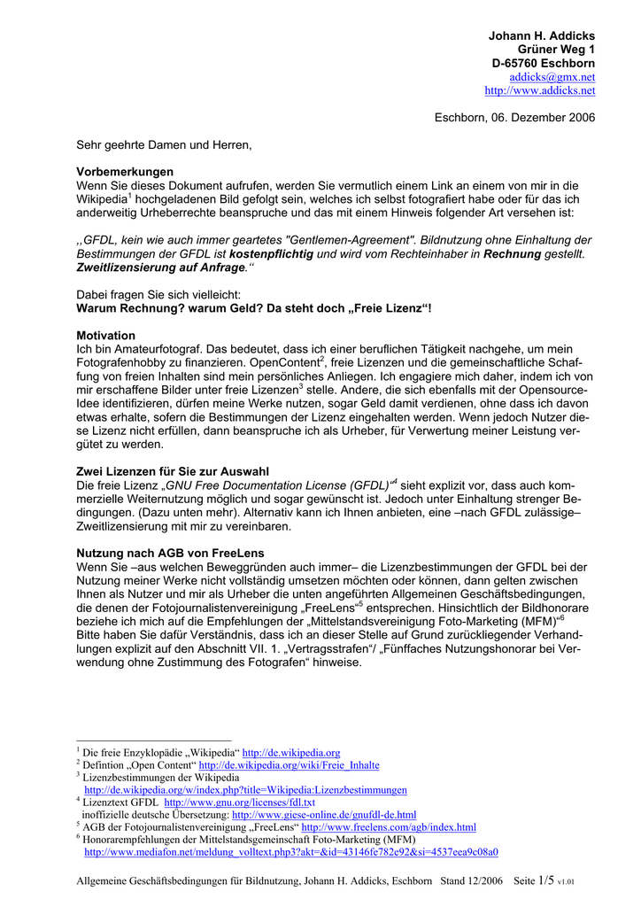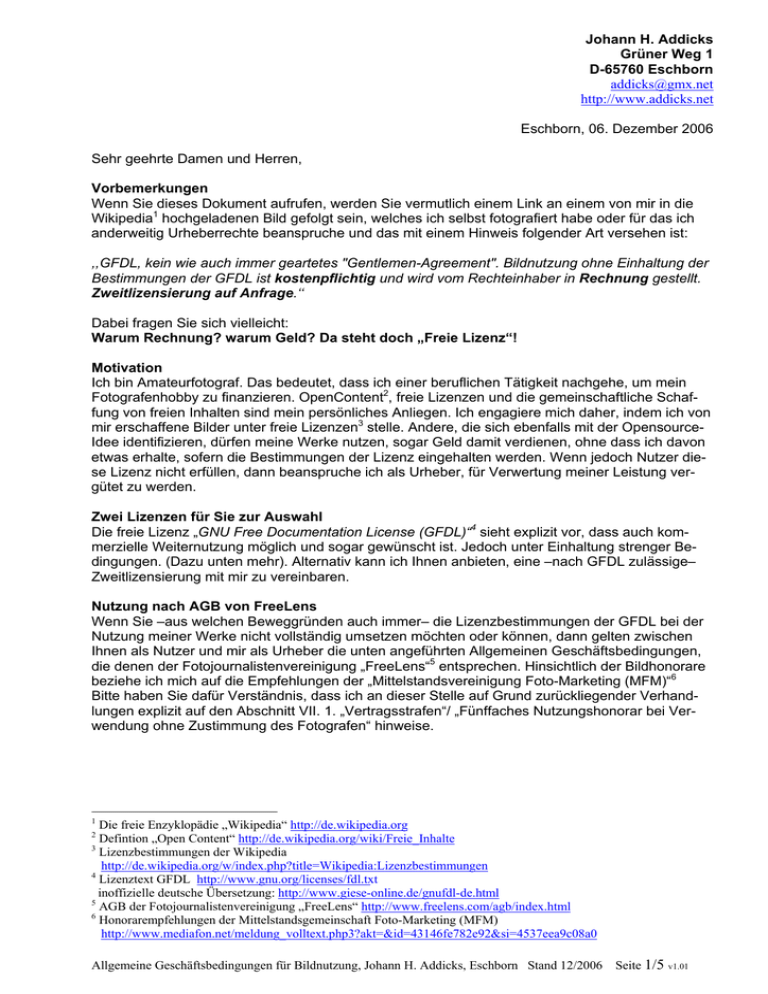 Johann H. Addicks Grüner Weg 1 D-65760 Eschborn [email protected] http://www.addicks.net Eschborn, 06. Dezember 2006 Sehr geehrte Damen und Herren, Vorbemerkungen Wenn Sie dieses Dokument aufrufen, werden Sie vermutlich einem Link an einem von mir in die Wikipedia1 hochgeladenen Bild gefolgt sein, welches ich selbst fotografiert habe oder für das ich anderweitig Urheberrechte beanspruche und das mit einem Hinweis folgender Art versehen ist: ,,GFDL, kein wie auch immer geartetes "Gentlemen-Agreement". Bildnutzung ohne Einhaltung der Bestimmungen der GFDL ist kostenpflichtig und wird vom Rechteinhaber in Rechnung gestellt. Zweitlizensierung auf Anfrage.‘‘ Dabei fragen Sie sich vielleicht: Warum Rechnung? warum Geld? Da steht doch „Freie Lizenz“! Motivation Ich bin Amateurfotograf. Das bedeutet, dass ich einer beruflichen Tätigkeit nachgehe, um mein Fotografenhobby zu finanzieren. OpenContent2, freie Lizenzen und die gemeinschaftliche Schaffung von freien Inhalten sind mein persönliches Anliegen. Ich engagiere mich daher, indem ich von mir erschaffene Bilder unter freie Lizenzen3 stelle. Andere, die sich ebenfalls mit der OpensourceIdee identifizieren, dürfen meine Werke nutzen, sogar Geld damit verdienen, ohne dass ich davon etwas erhalte, sofern die Bestimmungen der Lizenz eingehalten werden. Wenn jedoch Nutzer diese Lizenz nicht erfüllen, dann beanspruche ich als Urheber, für Verwertung meiner Leistung vergütet zu werden. Zwei Lizenzen für Sie zur Auswahl Die freie Lizenz „GNU Free Documentation License (GFDL)“4 sieht explizit vor, dass auch kommerzielle Weiternutzung möglich und sogar gewünscht ist. Jedoch unter Einhaltung strenger Bedingungen. (Dazu unten mehr). Alternativ kann ich Ihnen anbieten, eine –nach GFDL zulässige– Zweitlizensierung mit mir zu vereinbaren. Nutzung nach AGB von FreeLens Wenn Sie –aus welchen Beweggründen auch immer– die Lizenzbestimmungen der GFDL bei der Nutzung meiner Werke nicht vollständig umsetzen möchten oder können, dann gelten zwischen Ihnen als Nutzer und mir als Urheber die unten angeführten Allgemeinen Geschäftsbedingungen, die denen der Fotojournalistenvereinigung „FreeLens“5 entsprechen. Hinsichtlich der Bildhonorare beziehe ich mich auf die Empfehlungen der „Mittelstandsvereinigung Foto-Marketing (MFM)“6 Bitte haben Sie dafür Verständnis, dass ich an dieser Stelle auf Grund zurückliegender Verhandlungen explizit auf den Abschnitt VII. 1. „Vertragsstrafen“/ „Fünffaches Nutzungshonorar bei Verwendung ohne Zustimmung des Fotografen“ hinweise. 1 Die freie Enzyklopädie „Wikipedia“ http://de.wikipedia.org Defintion „Open Content“ http://de.wikipedia.org/wiki/Freie_Inhalte 3 Lizenzbestimmungen der Wikipedia http://de.wikipedia.org/w/index.php?title=Wikipedia:Lizenzbestimmungen 4 Lizenztext GFDL http://www.gnu.org/licenses/fdl.txt inoffizielle deutsche Übersetzung: http://www.giese-online.de/gnufdl-de.html 5 AGB der Fotojournalistenvereinigung „FreeLens“ http://www.freelens.com/agb/index.html 6 Honorarempfehlungen der Mittelstandsgemeinschaft Foto-Marketing (MFM) http://www.mediafon.net/meldung_volltext.php3?akt=&id=43146fe782e92&si=4537eea9c08a0 2 Allgemeine Geschäftsbedingungen für Bildnutzung, Johann H. Addicks, Eschborn Stand 12/2006 Seite 1/5 v1.01 Nutzung nach den Bestimmungen der GFDL Der Begriff „Freie Lizenz“ darf jedoch –um den oft bemühten Vergleich anzubringen- nicht mit „Freibier“ verwechselt werden. Freie Lizenzen knüpfen Bedingungen, die die Nutzer/Lizenznehmer einzuhalten haben. Dazu gehört bei der von mir in der Regel gewählten „GNU Lizenz für freie Dokumentation“ (in der Version 1.2 von Februar 2003, siehe Anhang), dass Sie unter anderem folgende Bedingungen erfüllen, wenn Sie Werke/Medien verwerten: a) Sie müssen am Bild den Urheber als Quelle namentlich nennen. Falls am Bild/Werk mehrere Personen mit Schöpfungshöhe beteiligt sind, so müssen Sie die fünf Hauptautoren/Urheber nennen. b) Das Werk muss unter gleichen Bedingungen weiterverbreitet werden, d.h. wenn Sie Änderungen am Bild vornehmen, müssen Sie anderen die Weiterverbreitung/Nutzung Ihrer Version ebenfalls unter GFDL einräumen. c) Sie müssen bei der Verwendung in OnlineMedien auf ihrem Webangebot eine (lokale) Kopie der GFDL-Bestimmungen vorrätig halten und diese direkt am Bild mit einem Link zugänglich machen. Bei OfflineMedien (CDs, Printmedien) müssen Sie eine vollständige Kopie der GFDL beifügen und darauf am Bild / den Bildern verweisen. d) Wenn Sie das Werk der Wikipedia entnommen haben, so wünscht die Wikipedia-Foundation, dass Sie die Wikipedia namentlich erwähnen und bei Onlinemedien einen Link setzen.7 Wortgetreue Einhaltung der GFDL Ich weise hiermit darauf hin, dass ich einem –wie auch immer formulierten– „GentlemenAgreement“ (z.B. hinsichtlich eines vereinfachten Quellennachweises oder des Wegfalls einer der obigen Bestimmungen a bis c) nicht zustimme und auf die Einhaltung der Bestimmungen der GFDL bestehe. Die obig angeführten Punkte sind eine Zusammenfassung wichtiger Bestimmungen der GFDL, rechtsverbindlich ist jedoch der Wortlaut des englischsprachigen GFDL-Textes. (siehe auch Anhang) Schlussbemerkungen Für Rückfragen stehe ich Ihnen gerne zur Verfügung. Sollte ich auf Ihre Anfragen nicht kurzfristig reagieren können, bitte ich Sie zu berücksichtigen, dass ich als Hobbyist kein Geschäftsbetrieb führe, also keine festen Bürozeiten habe oder fortwährende Erreichbarkeit sicherstellen kann. Es gelten die Bestimmungen und AGB jeweils aktuellen Standes. Mit freundlichem Gruß Johann H. Addicks Anhänge • AGB zur Zweitlizensierung • GNU Free Documentation License (Version 1.2, November 2002) 7 Lizenzbedingungen der deutschsprachigen Wikipedia: http://de.wikipedia.org/w/index.php?title=Wikipedia:Lizenzbestimmungen&printable=yes Allgemeine Geschäftsbedingungen für Bildnutzung, Johann H. Addicks, Eschborn Stand 12/2006 Seite 2/5 v1.01 All