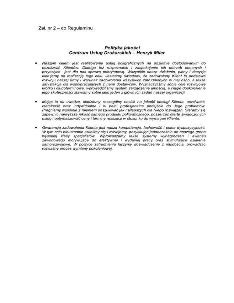 Zał. nr 2 – do Regulaminu Polityka jakości Centrum Usług Drukarskich – Henryk Miler Naszym celem jest realizowanie usług poligraficznych na poziomie dostosowanym do oczekiwań Klientów. Dlatego też rozpoznanie i zaspokojenie ich potrzeb obecnych i przyszłych jest dla nas sprawą priorytetową. Wszystkie nasze działania, plany i decyzje kierujemy na realizację tego celu. Jesteśmy świadomi, że zadowolony Klient to podstawa rozwoju naszej firmy i warunek zadowolenia wszystkich zatrudnionych w niej osób, a także satysfakcja dla współpracujących z nami dostawców. Wyznaczyliśmy sobie cele rozwojowe krótko i długoterminowe, wprowadziliśmy system zarządzania jakością, a ciągłe doskonalenie jego skuteczności stawiamy sobie jako jeden z głównych zadań naszej organizacji. Mając to na uwadze, kładziemy szczególny nacisk na jakość obsługi Klienta, uczciwość, rzetelność oraz indywidualne i w pełni profesjonalne podejście do Jego problemów. Pragniemy wspólnie z Klientem poszukiwać jak najlepszych dla Niego rozwiązań. Staramy się zapewnić najwyższą jakość samego produktu poligraficznego, poszerzać ofertę świadczonych usług i optymalizować ceny i terminy realizacji w stosunku do wymagań Klienta. Gwarancją zadowolenia Klienta jest nasza kompetencja, fachowość i pełna dyspozycyjność. W tym celu nieustannie szkolimy się i rozwijamy, pozyskując jednocześnie do naszego grona wysokiej klasy specjalistów. Wprowadzamy także systemy wynagrodzeń i awansu zawodowego motywujące do efektywnej i wydajnej pracy oraz stymulujące działania samorozwojowe. W polityce zatrudnienia łączymy doświadczenie z młodością, prowadząc rozważny proces wymiany pokoleniowej.