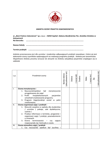 ANKIETA OCENY PRAKTYK ZAWOWDOWYCH w ,,Boni Fratres Catoviensis’’ sp. z o.o. – NZOZ Szpital Zakonu Bonifratrów Pw. Aniołów Stróżów w Katowicach Na kierunku ………………………………………………………………………………………………….……. Nazwa Szkoły ……………………………………………………………………………………………………….. Termin praktyki …………………………………………………………………………………………………... I. II. III. Ocena merytoryczna : 1. Nauczyciel/opiekun był merytorycznie przygotowany do zajęć 2. Profil hospitalizowanych pacjentów umożliwił zrealizowanie programu 3. Program Zajęć/praktyk został w pełni zrealizowany Ocena organizacji zajęć / praktyki : 1. Warunki socjalne w szpitalu dla studentów / uczniów ( pokoje, sale dydaktyczne, szatnie ) 2. Przekaz informacji o terminie, programie i organizacji zajęć / praktyk, powiadomienie o zmianach 3. Ocena terminowości – czy zajęcia rozpoczynały się i kończyły o czasie. Ocena atmosfery zajęć / praktyk 1. Czy nauczyciel/ opiekun był życzliwy i ( zdecydowanie nie) ) Źle ( raczej nie ) Słabo Średnio ( raczej tak) Przedmiot oceny Dobrze L.p. Bardzo dobrze (zdecydowanie tak ) Ankieta przeznaczona jest dla uczniów i studentów odbywających praktyki zawodowe. Celem jej jest dokonanie oceny czynników wpływających na realizację programu praktyk. Ankieta jest anonimowa. Wypełnione Ankiety prosimy wrzucać do skrzynki na Ankiety satysfakcji pacjentów znajdujące się w oddziale zaangażowany w nauczanie ? 2. Czy zajęcia/ praktyki odbywały się w atmosferze przyjaznej dla dydaktyki ? 3. Czy personel szpitala wspierał uczniów / studentów ? 4. Czy zajęcia w naszym Szpitalu są warte polecenia innym studentom /uczniom ? IV. Ocena szpitala 1. Warunki bytowe dla pacjentów (wyposażenie sal chorych, posiłki) 2. Stosunek pracowników szpitala do pacjentów. 3. Przestrzeganie praw pacjentów w naszym Szpitalu – prawo do informacji, do zachowania godności, prawo do ochrony danych osobowych, możliwość spotkania z rodziną. 4. Szpital jest dobrze zorganizowany V .Prosimy o podanie własnych spostrzeżeń dotyczących ewentualnych usprawnień w zakresie organizacji praktyk. …………………………………………………………………………………………………………………………………………………………… …………………………………………………………………………………………………………………………………………………………… …………………………………………………………………………………………………………………………………………………………