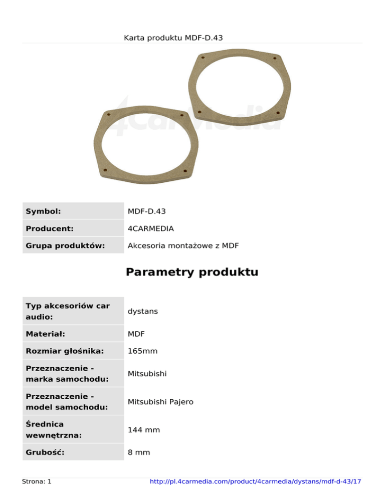 Karta produktu MDF-D.43 Symbol: MDF-D.43 Producent: 4CARMEDIA Grupa produktów: Akcesoria montażowe z MDF Parametry produktu Typ akcesoriów car audio: dystans Materiał: MDF Rozmiar głośnika: 165mm Przeznaczenie marka samochodu: Przeznaczenie model samochodu: Średnica wewnętrzna: Grubość: Strona: 1 Mitsubishi Mitsubishi Pajero 144 mm 8 mm http://pl.4carmedia.com/product/4carmedia/dystans/mdf-d-43/17 Karta produktu MDF-D.43 Właściwości car audio: impregnowany, lakierowany Informacje dodatkowe Masa brutto: Strona: 2 0,096 kg http://pl.4carmedia.com/product/4carmedia/dystans/mdf-d-43/17