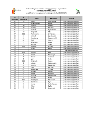 Lista rankingowa uczniów ubiegających się o stypemdium MISTRZOWIE MATEMATYKI współfinansowanego przez Fundację mBanku i ŚSO DELTA Lp rankingu 01 02 03 04 05 06 07 08 09 10 11 12 13 14 15 16 17 18 19 20 21 22 23 24 25 26 27 28 29 30 31 32 33 Nr zgłoszenia 16 11 80 30 43 60 101 36 20 82 13 25 112 17 107 7 29 8 108 5 22 34 47 78 81 51 83 105 91 68 49 75 Imię Nazwisko Jacek Maksymilian Szymon Maciej Marcel Wojciech Aleksandra Michał Konstanty Zofia Arkadiusz Michał Szymon Marta Nitychoruk Pakos Czernik Bolesta Rychlewski Ptaś Złotowska Leśniewski Kostrzewski Wiora Gnus Szwej Frelich Kładź Justyna Kamil Daniel Igor Wojciech Łukasz Marcin Piotr Agnieszka Maciej Borys Michał Witold Przemysła Dominika Maria Adam Olaf Król Krawczyk Adamski Odias Haska Kochańczyk Regieniec Karolak Sobala Małek Kowalik Prochowski Kimla Szewczak Byra Kwiatkowska Żyłka Łukomski Uwagi przyznane stypendium przyznane stypendium przyznane stypendium przyznane stypendium przyznane stypendium przyznane stypendium przyznane stypendium przyznane stypendium przyznane stypendium przyznane stypendium przyznane stypendium przyznane stypendium przyznane stypendium przyznane stypendium wniosek wycofany przyznane stypendium przyznane stypendium przyznane stypendium przyznane stypendium przyznane stypendium przyznane stypendium przyznane stypendium przyznane stypendium przyznane stypendium przyznane stypendium przyznane stypendium przyznane stypendium przyznane stypendium przyznane stypendium przyznane stypendium przyznane stypendium przyznane stypendium przyznane stypendium