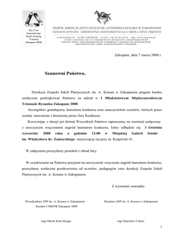 Zakopane, dnia 7 marca 2008 r. Szanowni Państwo, Dyrekcja Zespołu Szkół Plastycznych im. A. Kenara w Zakopanem pragnie bardzo serdecznie podziękować Państwu za udział w I Młodzieżowym Międzynarodowym Triennale Rysunku Zakopane 2008 Szczególnie gratulujemy laureatom konkursu oraz nauczycielom uczniów, których prace zostały zauważone i docenione przez Jury Konkursu. Korzystając z okazji już dzisiaj Wszystkich Państwa zapraszamy na wernisaż połączony z uroczystym wręczeniem nagród laureatom konkursu, który odbędzie się /czwartek/ 2008 roku o godzinie 12:00 w Miejskiej Galerii 3 kwietnia Sztuki im. Władysława hr. Zamoyskiego mieszczącej się przy ul. Krupówki 41. W załączeniu przesyłamy protokół z obrad Jury. W oczekiwaniu na Państwa przyjazd na uroczystość wręczenia nagród laureatom konkursu, przesyłamy serdeczne pozdrowienia od uczniów, pedagogów oraz dyrekcji Zespołu Szkół Plastycznych im. A. Kenara w Zakopanem. Z wyrazami szacunku Wicedyrektor ZSP im. A. Kenara w Zakopanem Dyrektor ZSP im. A. Kenara w Zakopanem Kurator I MMTR Zakopane 2008 mgr Marek Król-Józaga mgr Stanisław Cukier 1 PROTOKÓŁ Z POSIEDZENIA JURY I MŁODZIEŻOWEGO MIĘDZYNARODOWEGO TRIENNALE RYSUNKU ZAKOPANE 2008 I. Informacje organizacyjne; W dniu 5 marca 2008 roku w Zespole Szkół Plastycznych im. Antoniego Kenara w Zakopanem odbyło się posiedzenie Jury I Młodzieżowego Międzynarodowego Triennale Rysunku Zakopane 2008. Zgodnie z regulaminem konkursu Jury zostało powołane przez Dyrektora Centrum Edukacji Artystycznej w następującym składzie: Przewodniczący Jury: • prof. Zygmunt Januszewski, Akademia Sztuk Pięknych w Warszawie. Członkowie Jury: • prof. Jacek Szewczyk, • prof. Mieczysław Górowski, rektor Akademii Sztuk Pięknych we Wrocławiu Akademia Sztuk Pięknych im. Jana Matejki w Krakowie • mgr Urszula Kenar, scenograf, absolwentka Akademii Sztuk Pięknych im. Jana Matejki w Krakowie Sekretarz: • mgr Marek Król – Józaga wicedyrektor Zespołu Szkół Plastycznych im. A. Kenara w Zakopanem Na konkurs wpłynęło 3528 prac 1852 uczestników z 32 krajów, w tym z: Algierii, Białorusi, Bośni i Hercegowiny, Bułgarii, Chin, Czech, Egiptu, Estonii, Finlandii, Indii, Indonezji, Kanady, Kazachstanu, Korei, Litwy, Łotwy, Malezji, Mołdawii, Nepalu, Nowej Zelandii, Rosji, Rumunii, Serbii, Słowacji, Słowenii, Sri Lanki, Polski, Portugalii, Turcji, Ukrainy, Węgier i Włoch. 2 3 LP KRAJ LICZBA ZGŁOSZONYCH DO KONKURSU PRAC 1. 2. 3. 4. 5. 6. 7. 8. 9. 10. 11. 12. 13. 14. 15. 16. 17. 18. 19. 20. 21. 22. 23. 24. 25. 26. 27. 28. 29. 30. 31. 32. ALGIERIA BIAŁORUŚ BOŚNIA I HERCEGOWINA BUŁGARIA CHINY CZECHY EGIPT ESTONIA FINLANDIA INDIE INDONEZJA KANADA KAZACHSTAN KOREA LITWA ŁOTWA MALEZJA MOŁDAWIA NEPAL NOWA ZELANDIA ROSJA RUMUNIA SERBIA SŁOWACJA SŁOWENIA SRI LANKA POLSKA PORTUGALIA TURCJA UKRAINA WĘGRY WŁOCHY 32 KRAJE Z POLSKI Z ZAGRANICY 22 19 35 18 12 52 32 38 3 552 23 4 96 17 58 21 13 52 8 19 86 165 31 179 120 6 1560 8 10 185 78 6 3528 PRAC 1560 PRAC 1968 PRAC RAZEM I ETAP: Jury po wnikliwej analizie wszystkich nadesłanych na konkurs prac wyłoniło do dalszej selekcji łącznie 178 prace, w tym: - 80 prac w kategorii dziecięcej, w wieku 13-15 lat, - 64 prace w kategorii młodzieży, w wiek 16-18 lat, - 34 prace w kategorii młodzieży, w wieku 19-20 lat. Ponad to Jury zdecydowało, iż 178 prace wyłonione w pierwszym etapie wraz z pracami nagrodzonymi zostaną zaprezentowane na wystawie pokonkursowej. Otwarcie wystawy oraz 4 uroczystość wręczania nagród odbędzie się 3 kwietnia 2008 roku w Miejskiej Galerii Sztuki im. Władysława hr. Zamoyskiego w Zakopanem, ul. Krupówki 41 o godzinie 12.00 na które już dzisiaj bardzo serdecznie zapraszamy. Uwaga! Organizator nie ponosi kosztów podróży, zakwaterowania oraz noclegów. II ETAP: W wyniku selekcji Jury 65 prac zakwalifikowało się do finału konkursu. Wszystkie wyżej wymienione prace zostały nominowane do nagród. W tym; - 27 prac w kategorii dziecięcej, w wieku od 13 do 15 lat, - 23 prace w kategorii młodzieży, w wieku od 16 do 18 lat, - 15 prac w kategorii młodzieży, w wieku od 19 do 20 lat. Spośród 65 prac finałowych Jury wyłoniło nagrodę główną Grand Prix I Młodzieżowego Międzynarodowego Triennale Rysunku Zakopane 2008, I, II, III Nagrodę w trzech kategoriach wiekowych oraz 12 równorzędnych wyróżnień. W tym 5 wyróżnień w kategorii dziecięcej w wieku 13-15 lat, 3 wyróżnienia w kategorii młodzieży w wieku 13-15 lat i 4 wyróżnienia w kategorii młodzieży w wieku 19-20 lat. Jury Konkursu dodatkowo postanowiło przyznać 3 Nagrody Specjalne ufundowane przez Przewodniczącego Jury Konkursu prof. Zygmunta Januszewskiego oraz Członków Jury Konkursu, prof. Mieczysława Górowskiego i panią Urszulę Kenar. PRACE ZAKWALIFIKOWANE DO WYSTAWY KATEGORIA 13-15 LAT LP. AUTOR: TYTUŁ PRACY 1. BERTA KISAND „THE SHIP OF MY DREAMS” NAUCZYCIEL PROWADZĄCY LEMBI SCHMIDT SZKOŁA KRAJ PELGULINA HIGH SCHOOL, TALLIN ESTONIA 5 1 2. 3. 4. 5. APPAMBEIT JYOTHSHNA PREETHI SHET KRIMA JIGAR SHAH MEGHA MUKHEUJCE „INDIAN MARRIAGE” NELLORE BAL BHAVAN INDIE „INDIAN TRADITIONAL DANCE” „FRESH FISH” BAL BHAVAN BANGALORE INDIE KANTI RANA’S HOBBY CENTRE, GUJARAT ROSE BANK EDU-CARE HIGH SCHOOL, MADHYAMGRAM TULIKA FOR CHILD ART, BHAVANAGAR INDIE LUCKNOW PUBLIC SCHOOL SACHARA, STATES JANKI PURAM CHILDREN’ ART SCHOOL, LISAKOVS INDIE KAZACHSTAN 1 SELAQUI WORLD SCHOOL, INCHEON ADOMAS BRAKAS ART. SCHOOL, KLAIPEDA KAUNAS ART GYMNASIUM KOREA 1 ŠAULIAI LITWA „GINTA LATINA” LICEUM, CHISINÁU „GINTA LATINA” LICEUM, CHISINÁU „GINTA LATINA” LICEUM, CHISINÁU MOŁDAWIA ZESPÓŁ SZKÓŁ PLASTYCZNYCH IM. ST. KOPYSTYŃSKIEGO WE WROCŁAWIU ZESPÓŁ SZKÓŁ PLASTYCZNYCH IM. ST. KOPYSTYŃSKIEGO WE WROCŁAWIU ZESPÓŁ SZKÓŁ PLASTYCZNYCH IM. ST. KOPYSTYŃSKIEGO WE WROCŁAWIU OGÓLNOKSZTAŁCĄCA SZKOŁA SZTUK PIĘKNYCH W ZESPOLE SZKÓŁ NR 18 W ZABRZU AUTORSKIE ATE