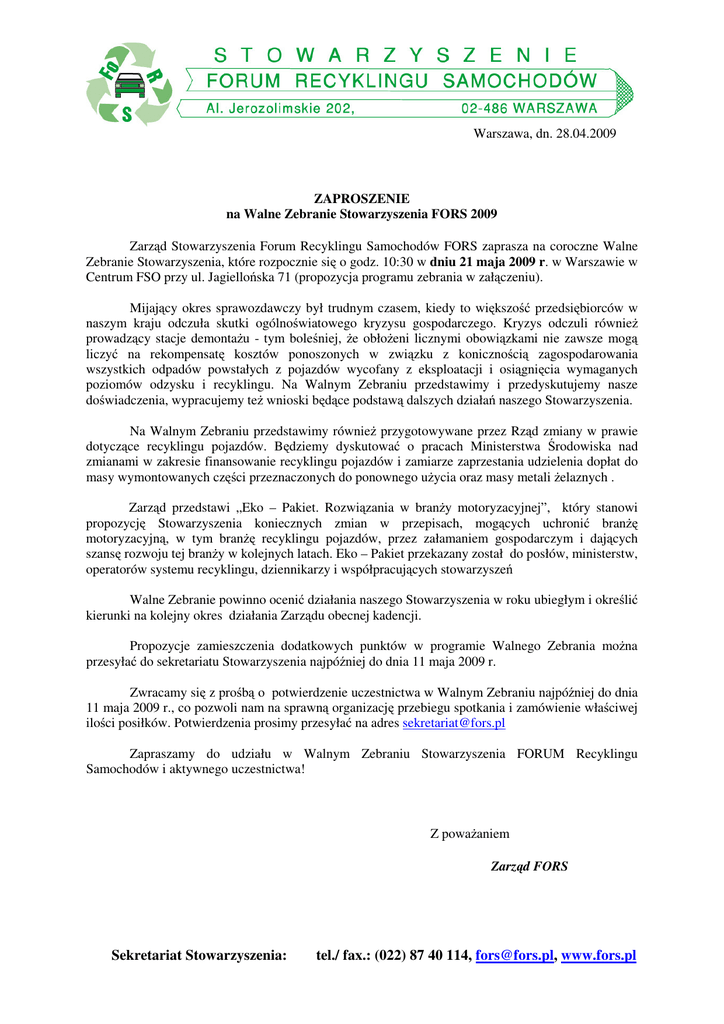 Warszawa, dn. 28.04.2009 ZAPROSZENIE na Walne Zebranie Stowarzyszenia FORS 2009 Zarząd Stowarzyszenia Forum Recyklingu Samochodów FORS zaprasza na coroczne Walne Zebranie Stowarzyszenia, które rozpocznie się o godz. 10:30 w dniu 21 maja 2009 r. w Warszawie w Centrum FSO przy ul. Jagiellońska 71 (propozycja programu zebrania w załączeniu). Mijający okres sprawozdawczy był trudnym czasem, kiedy to większość przedsiębiorców w naszym kraju odczuła skutki ogólnoświatowego kryzysu gospodarczego. Kryzys odczuli również prowadzący stacje demontażu - tym boleśniej, że obłożeni licznymi obowiązkami nie zawsze mogą liczyć na rekompensatę kosztów ponoszonych w związku z konicznością zagospodarowania wszystkich odpadów powstałych z pojazdów wycofany z eksploatacji i osiągnięcia wymaganych poziomów odzysku i recyklingu. Na Walnym Zebraniu przedstawimy i przedyskutujemy nasze doświadczenia, wypracujemy też wnioski będące podstawą dalszych działań naszego Stowarzyszenia. Na Walnym Zebraniu przedstawimy również przygotowywane przez Rząd zmiany w prawie dotyczące recyklingu pojazdów. Będziemy dyskutować o pracach Ministerstwa Środowiska nad zmianami w zakresie finansowanie recyklingu pojazdów i zamiarze zaprzestania udzielenia dopłat do masy wymontowanych części przeznaczonych do ponownego użycia oraz masy metali żelaznych . Zarząd przedstawi „Eko – Pakiet. Rozwiązania w branży motoryzacyjnej”, który stanowi propozycję Stowarzyszenia koniecznych zmian w przepisach, mogących uchronić branżę motoryzacyjną, w tym branżę recyklingu pojazdów, przez załamaniem gospodarczym i dających szansę rozwoju tej branży w kolejnych latach. Eko – Pakiet przekazany został do posłów, ministerstw, operatorów systemu recyklingu, dziennikarzy i współpracujących stowarzyszeń Walne Zebranie powinno ocenić działania naszego Stowarzyszenia w roku ubiegłym i określić kierunki na kolejny okres działania Zarządu obecnej kadencji. Propozycje zamieszczenia dodatkowych punktów w programie Walnego Zebrania można przesyłać do sekretariatu Stowarzyszenia najpóźniej do dnia 11 maja 2009 r. Zwracamy się z prośbą o potwierdzenie uczestnictwa w Walnym Zebraniu najpóźniej do dnia 11 maja 2009 r., co pozwoli nam na sprawną organizację przebiegu spotkania i zamówienie właściwej ilości posiłków. Potwierdzenia prosimy przesyłać na adres [email protected] Zapraszamy do udziału w Walnym Zebraniu Stowarzyszenia FORUM Recyklingu Samochodów i aktywnego uczestnictwa! Z poważaniem Zarząd FORS Sekretariat Stowarzyszenia: tel./ fax.: (022) 87 40 114, [email protected], www.fors.pl