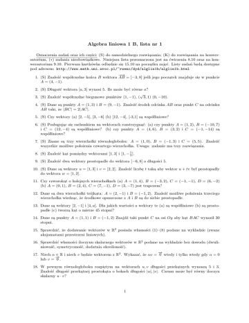 Algebra liniowa 1 B, lista nr 1 (S) do samodzielnego rozwiazania; (K) do rozwiazania na konwerOznaczenia zadań oraz ich cześci: , , , satorium, (∗) zadania nieobowiazkowe. Niniejsza lista przeznaczona jest na ćwiczenia 8.10 oraz na kon, wersatorium 9.10. Pierwsza kartkówka odbedzie si e 15.10 na pocz atku zaj eć. Listy zadań b ed a dost epne , , , , , , , pod adresem: http://www.math.uni.wroc.pl/~rwenc/dyd/alglin1b/alglin1b.html −−→ 1. (S) Znaleźć wspólrzedne końca B wektora AB = [−3, 8] jeśli jego poczatek znajduje sie, w punkcie , , A = (4, −1). 2. (S) Dlugość wektora [a, 3] wynosi 5. Ile może być równe a? √ 3. (S) Znaleźć wspólrzedne biegunowe punktów (1, −1), ( 3, 1) (0, −10). , 4. (S) Dane sa, punkty A = (1, 3) i B = (9, −1). Znaleźć środek odcinka AB oraz punkt C na odcinku AB taki, że |BC| = 2|AC|. 5. (S) Czy wektory (a) [2, −5], [3, −6] (b) [12, −4], [-3,1] sa, wspólliniowe? 6. (S) Poslugujac (a) czy punkty A = (1, 2), B = (−10, 7) , sie, rachunkiem na wektorach rozstrzygnać: , i C = (12, −4) sa, wspólliniowe? (b) czy punkty A = (4, 6), B = (3, 2) i C = (−1, −14) sa, wspólliniowe? 7. (S) Znane sa, trzy wierzcholki równolegloboku: A = (1, 0), B = (−1, 3) i C = (5, 5). Znaleźć wszystkie możliwe polożenia czwartego wierzcholka. Uwaga: zadanie ma trzy rozwiazania. , 8. (S) Znaleźć kat wektorami [1, 3] i [1, − 31 ]. , pomiedzy , 9. (S) Znaleźć dwa wektory prostopadle do wektora [−6, 8] o dlugości 5. 10. (S) Dane sa, wektory u = [1, 3] i v = [2, 2]. Znaleźć liczbe, t taka, aby wektor u + tv byl prostopadly do wektora w = [1, 2]. 11. Czy czworokat , o kolejnych wierzcholkach (a) A = (1, 4), B = (−3, 2), C = (−1, −1), D = (6, −2) (b) A = (0, 1), B = (2, 4), C = (7, −1), D = (3, −7) jest trapezem? 12. Dane sa, dwa wierzcholki trójkata: A = (2, −1) i B = (−1, 2). Znaleźć możliwe polożenia trzeciego , wierzcholka wiedzac, że środkowe opuszczone z A i B sa, do siebie prostopadle. , 13. Dane sa, wektory [2, −1] i [4, a]. Dla jakich wartości a wektory te (a) sa, wspólliniowe (b) sa, prostopadle (c) tworza, kat , o mierze 45 stopni? 14. Dane sa, punkty A = (1, 1) i B = (−1, 2) Znajdź taki punkt C na osi Oy aby kat , BAC wynosil 30 stopni. 15. Sprawdzić, że dodawanie wektorów w R2 posiada wlasności (1)–(8) podane na wykladzie (zwane aksjomatami przestrzeni liniowych). 16. Sprawdzić wlasności iloczynu skalarnego wektorów w R2 podane na wykladzie bez dowodu (dwuliniowość, symetryczność, dodatnia określoność). → − 17. Niech α ∈ R i niech v bedzie wektorem z R2 . Wykazać, że αv = 0 wtedy i tylko wtedy gdy α = 0 , → − lub v = 0 . 18. W pewnym równolegloboku rozpietym na wektorach u, v dlugości przekatnych wynosza, 5 i 3. , , Znaleźć dlugość przekatnej prostok ata o bokach d lugości |u|, |v|. Czemu może być równy iloczyn , , skalarny u · v? 1 19. Wykazać, że dla wektorów u, v z R2 mamy |u + v|2 = |u|2 + |v|2 wtedy i tylko wtedy gdy u · v = 0. 20. Znaleźć cosinusy katów wewnetrznych trójkata ABC, gdzie A = (1, 3), B = (3, −2), C = (2, −5) , , , oraz cosinusy miedzy środkowymi tego trójk ata. , , 21. W każdym z przypadków rozstrzygnać prostokatny czy rozwar, czy trójkat , ABC jest ostrokatny, , , tokatny. , (a) A = (5, −4, ), B = (3, 2), C = (2, −5). (b) A = (1, 1), B = (3, −2), C = (6, −3). (c) A = (1, 1), B = (3, −2), C = (6, 2). Zadanie należy rozwiazać badajac , , znak iloczynu skalarnego odpowiednich wektorów. 22. Na plaszczyźnie dane sa, niewspólliniowe punkty A = (a1 , a2 ), B = (b1 , b2 ), C = (c1 , c2 ). Znaleźć wspólrzedne środków boków trójkata ABC oraz wspólrzedne punktu przeciecia sie, jego środkowych. , , , , Poslużyć sie, odpowiednimi wlasnościami wektorów. Można skorzystać z faktu, że środkowe trójkata , przecinaja, sie, w punkcie, który dzieli je w stosunku 1:2. 23. Niech A1 , . . . , An bed a punktami na plaszczyźnie. Wykazać, że istnieje jedyny punkt S taki, że −−→ −−→ → −, , SA1 + . . . SAn = 0 . Punkt ten nazywamy środkiem cieżkoṡci ukladu A1 , . . . , An . Zauważyć, że , jeśli n = 3 i punkty A1 , A2 , A3 sa, niewspólliniowe, to S jest punktem przeciecia sie, środkowych , trójkata A A A . 1 2 3 , 24. (K) Na wykladzie zostaly podane zależności miedzy wspólrzednymi kartezjańskimi a biegunowymi , , na plaszczyźnie: x = r cos ϕ, y = r sin ϕ, gdzie r ≥ 0 i 0 ≤ ϕ < 2π. Wyrazić r, ϕ przy pomocy x, y pamietaj ac , o zakresie ϕ oraz o tym, że dla x = y = 0 wartść ϕ jest nieokreślona. , 25. (K) Niech S bedzie środkiem cieżkości ukladu punktów A1 , . . . , An na plaszczyźnie. Wykazać, że , , dla dowolnego punktu X plaszczyzny, wartość wyrażenia |XA1 |2 + . . . |XAn |2 − n|XS|2 nie zależy od wyboru punktu X. Zadanie rozwiazać na dwa sposoby: (a) wprowadzajac , , uklad wspólrzednych , kartezjańskich i wyrażajac odleg lości punktów za pomoc a ich wspó lrz ednych; (b) używajac , , , odpo, wiednich wlasności iloczynu skalarnego bez wprowadzania ukladu wspólrzednych. Czym jest wartość , powyższego wyrażenia w sytuacji gdy: (1) n = 4 i A1 A2 A3 A4 jest prostokatem o bokach dlugości , a, b; (2) n = 3 i A1 A2 A3 jest trójkatem równobocznym o boku d lugości a. , 26. (K) Na wykladzie nierówność Schwarza dla wektorów u, v z R2 zostala wyprowadzona jako wniosek ze wzoru u·v = |u||v| cos α, gdzie α to miara kata pomiedzy wektorami u i v. Znaleźć inny dowód tej , , nierówności rozpoczynajacy si e od obserwacji, że dla dowolnego t ∈ R, (u + tv)2 ≥ 0 i korzystajacy , , , z odpowiednich wlasności funkcji kwadratowej. R. Wencel, 2.10.2014 r. 2