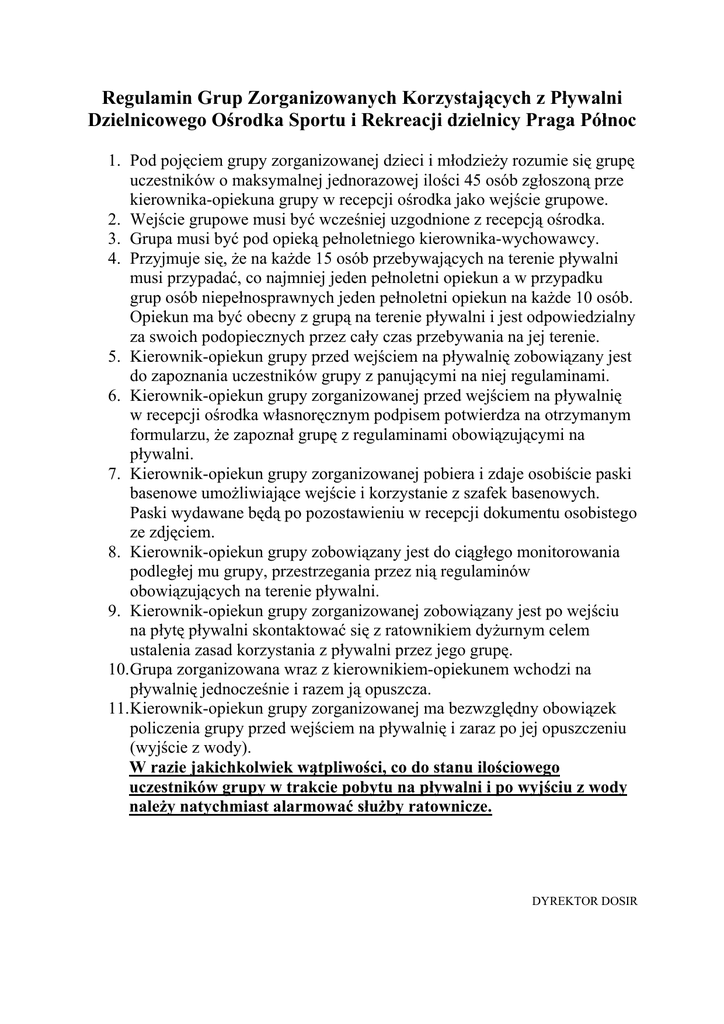 Regulamin Grup Zorganizowanych Korzystających z Pływalni Dzielnicowego Ośrodka Sportu i Rekreacji dzielnicy Praga Północ 1. Pod pojęciem grupy zorganizowanej dzieci i młodzieży rozumie się grupę uczestników o maksymalnej jednorazowej ilości 45 osób zgłoszoną prze kierownika-opiekuna grupy w recepcji ośrodka jako wejście grupowe. 2. Wejście grupowe musi być wcześniej uzgodnione z recepcją ośrodka. 3. Grupa musi być pod opieką pełnoletniego kierownika-wychowawcy. 4. Przyjmuje się, że na każde 15 osób przebywających na terenie pływalni musi przypadać, co najmniej jeden pełnoletni opiekun a w przypadku grup osób niepełnosprawnych jeden pełnoletni opiekun na każde 10 osób. Opiekun ma być obecny z grupą na terenie pływalni i jest odpowiedzialny za swoich podopiecznych przez cały czas przebywania na jej terenie. 5. Kierownik-opiekun grupy przed wejściem na pływalnię zobowiązany jest do zapoznania uczestników grupy z panującymi na niej regulaminami. 6. Kierownik-opiekun grupy zorganizowanej przed wejściem na pływalnię w recepcji ośrodka własnoręcznym podpisem potwierdza na otrzymanym formularzu, że zapoznał grupę z regulaminami obowiązującymi na pływalni. 7. Kierownik-opiekun grupy zorganizowanej pobiera i zdaje osobiście paski basenowe umożliwiające wejście i korzystanie z szafek basenowych. Paski wydawane będą po pozostawieniu w recepcji dokumentu osobistego ze zdjęciem. 8. Kierownik-opiekun grupy zobowiązany jest do ciągłego monitorowania podległej mu grupy, przestrzegania przez nią regulaminów obowiązujących na terenie pływalni. 9. Kierownik-opiekun grupy zorganizowanej zobowiązany jest po wejściu na płytę pływalni skontaktować się z ratownikiem dyżurnym celem ustalenia zasad korzystania z pływalni przez jego grupę. 10. Grupa zorganizowana wraz z kierownikiem-opiekunem wchodzi na pływalnię jednocześnie i razem ją opuszcza. 11. Kierownik-opiekun grupy zorganizowanej ma bezwzględny obowiązek policzenia grupy przed wejściem na pływalnię i zaraz po jej opuszczeniu (wyjście z wody). W razie jakichkolwiek wątpliwości, co do stanu ilościowego uczestników grupy w trakcie pobytu na pływalni i po wyjściu z wody należy natychmiast alarmować służby ratownicze. DYREKTOR DOSIR Warszawa dnia,………………….. OŚWIADCZENIE KIEROWNIKA-OPIEKUNA GRUPY ZORGANIZOWANEJ Ja niżej podpisany (a)…………………………………………………………… imię i nazwisko zamieszkały(a)…………………………………………………………………. legitymujący (a) się ……………………………………………………………. podać rodzaj, numer i serię dokumentu stwierdzającego tożsamość oświadczam, że jestem kierownikiem-opiekunem grupy ……………………… podać nazwę grupy o ilości uczestników ………………… . podać ilość Oświadczam, że przed wejściem na pływalnię zapoznałem (am) wszystkich uczestników grupy z regulaminem pływalni Dzielnicowego Ośrodka Sportu i Rekreacji Dzielnicy Praga Północ oraz że znany mi jest regulamin grup zorganizowanych korzystających z pływalni Dzielnicowego Ośrodka Sportu i Rekreacji Dzielnicy Praga Północ. ……………………………. czytelny podpis