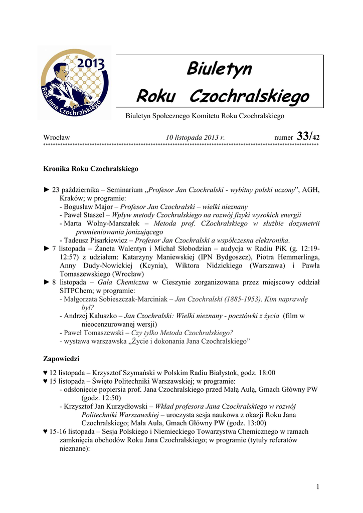 Biuletyn Roku Czochralskiego Biuletyn Społecznego Komitetu Roku Czochralskiego Wrocław 10 listopada 2013 r. numer 33/42 ***************************************************************************************************************** Kronika Roku Czochralskiego ► 23 października – Seminarium „Profesor Jan Czochralski - wybitny polski uczony”, AGH, Kraków; w programie: - Bogusław Major – Profesor Jan Czochralski – wielki nieznany - Paweł Staszel – Wpływ metody Czochralskiego na rozwój fizyki wysokich energii - Marta Wolny-Marszałek – Metoda prof. CZochralskiego w służbie dozymetrii promieniowania jonizującego - Tadeusz Pisarkiewicz – Profesor Jan Czochralski a współczesna elektronika. ► 7 listopada – Żaneta Walentyn i Michał Słobodzian – audycja w Radiu PiK (g. 12:1912:57) z udziałem: Katarzyny Maniewskiej (IPN Bydgoszcz), Piotra Hemmerlinga, Anny Dudy-Nowickiej (Kcynia), Wiktora Nidzickiego (Warszawa) i Pawła Tomaszewskiego (Wrocław) ► 8 listopada – Gala Chemiczna w Cieszynie zorganizowana przez miejscowy oddział SITPChem; w programie: - Małgorzata Sobieszczak-Marciniak – Jan Czochralski (1885-1953). Kim naprawdę był? - Andrzej Kałuszko – Jan Czochralski: Wielki nieznany - pocztówki z życia (film w nieocenzurowanej wersji) - Paweł Tomaszewski – Czy tylko Metoda Czochralskiego? - wystawa warszawska „Życie i dokonania Jana Czochralskiego” Zapowiedzi ♥ 12 listopada – Krzysztof Szymański w Polskim Radiu Białystok, godz. 18:00 ♥ 15 listopada – Święto Politechniki Warszawskiej; w programie: - odsłonięcie popiersia prof. Jana Czochralskiego przed Małą Aulą, Gmach Główny PW (godz. 12:50) - Krzysztof Jan Kurzydłowski – Wkład profesora Jana Czochralskiego w rozwój Politechniki Warszawskiej – uroczysta sesja naukowa z okazji Roku Jana Czochralskiego; Mała Aula, Gmach Główny PW (godz. 13:00) ♥ 15-16 listopada – Sesja Polskiego i Niemieckiego Towarzystwa Chemicznego w ramach zamknięcia obchodów Roku Jana Czochralskiego; w programie (tytuły referatów nieznane): 1 - Sekcja 1. Życie i działalność naukowa Jana Czochralskiego: Janusz Rachoń, Piotr Hemmerling, Franciszek Rozpłoch i Paweł Tomaszewski; Senat RP (15 listopada, godz. 17:00) - wystawa o Janie Czochralskim - Sekcja 2. Chemia i fizyka monokryształów: Ewa Talik, Mirosław Handke i Mirosław Nader; Politechnika Warszawska (16 listopada, godz. 10:00) - Sekcja 3. Chemia metali – materiałoznawstwo: Krzysztof Kurzydłowski, Ulrich Schubert, Andrzej Zięba, Borys Mikułowski i Zbigniew Tucholski - Sekcja 4. Chemia gospodarcza: Antonius Kettrup, Izabela Nowak i Jerzy Bałdyga ♥ 19 listopada – Paweł Tomaszewski – O wielkości zapomnianego - prof. Jan Czochralski – Kazimierzowski Uniwersytet Trzeciego Wieku, Bydgoszcz (godz. 16:00) ♥ 21 listopada – Anna Czerwińska-Rydel – spotkanie z czytelnikami w Kcyni (godz. 11:00) ♥ 21 listopada – Paweł Tomaszewski – Czy Jan Czochralski jest ojcem elektroniki półprzewodnikowej? – Wykłady PAN, Gdańsk; Ratusz Staromiejski (godz. 17:00) ♥ 22 listopada – Paweł Tomaszewski – Nie tylko „metoda Czochralskiego” – konferencja naukowo-techniczna SITPChem "PRZEMYSŁ CHEMICZNY - wyzwania i bariery", Ustroń-Jaszowiec; DW Jawor Informacje prasowe i internetowe ♦ 24 października – ros/pmw/PAP – Monografia o Janie Czochralskim zostanie wydana też po niemiecku – www.naukawpolsce.pap.pl/aktualnosci/news,397717,monografia-ojanie-czochralskim-zostanie-wydana-tez-po-niemiecku.html [A] ******** Kuferek Czochralskiego W kilku przedwakacyjnych numerach „Biuletynu...” wspominałem o mającej się odbyć siódmej konferencji-warsztatach pt. „Pokazać-Przekazać”. Dziś kilka wspomnień z tej jakże cennej i dużej (300 uczestników!) imprezy. Była dedykowana prof. Janowi Czochralskiemu i odbyła się w dniach 23-24 sierpnia br. w Centrum Nauki Kopernik w Warszawie. Wysłuchaliśmy referatu prof. Marka Godlewskiego pt. Jan Czochralski - ojciec współczesnej elektroniki. Odbyły się trzy sesje panelowe. Jedna dotyczyła tematu Mów do mnie po ludzku, czyli jak skutecznie przybliżać osiągnięcia naukowe w szkole? na przykładzie odkryć prof. Jana Czochralskiego (Wojciech Mikołuszko, Monika Jędrzejewska. Dobrochna Kaława. Zygmunt Łuczyński, Mirosław Nader, Paweł Tomaszewski i Łukasz Turski). W kuluarach konferencji można było obejrzeć kcyńską wystawę o Janie Czochralskim. Niezwykle cenną inicjatywą jest opracowanie przez zespół pracowników Centrum Nauki Kopernik zestawu edukacyjnego „Walizka Profesora Czochralskiego”. Na specjalnych dwudniowych warsztatach testowaliśmy w dwóch grupach część zawartości tego kuferka. Zajęcia prowadziły Urszula Koss, Joanna Olejniczak, Katarzyna Andrejczuk, Bogusława Juchełka a moderatorami były Monika Jędrzejewska i Magdalena Czapkiewicz. Taki kuferek zawiera materiały (np. mikroskopy, lasery, mierniki itp.) i scenariusze niezbędne do przeprowadzenia eksperymentów przez nauczycieli różnych przedmiotów. Docelowo w kuferku ma być 6 takich zestawów. My testowaliśmy cztery z nich. Jeden dotyczył analizy sześciu dawnych materiałów prasowych z procesu „Czochralski - Broniewski” i nosił tytuł: „Przez życie do historii” – niezwykła biografia Jana Czochralskiego. Przy okazji poznaliśmy, że manipulowanie informacjami nie jest tylko dzisiejszym wynalazkiem. Drugi zestaw nosi 2 tytuł Krystalizacja błyskawicznie, trzeci – Co oko widziało, czyli materia pod mikroskopem, a czwarty – Metal metalowi nierówny. Nagrania z konferencji są dostępne na stronie internetowej Centrum, a walizki miały być bezpłatnie wręczone w terminie późniejszym. ******** Odkrycia Publikujemy fragment zbioru wierszy Jana Pałuckiego (czyli Jana Czochralskiego) z 1950 r. i zatytułowanego „Pieśń o Bogu i Ziemi”. Rękopis przywieziony przed tygodniem z USA to kratkowany zeszyt w jasnobrązowej o
