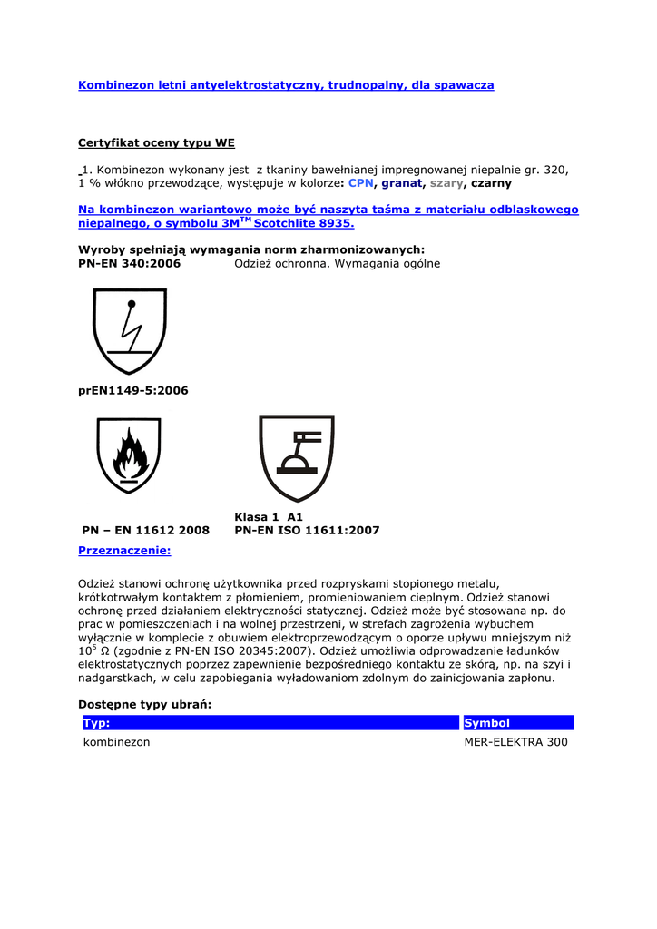 Kombinezon letni antyelektrostatyczny, trudnopalny, dla spawacza Certyfikat oceny typu WE 1. Kombinezon wykonany jest z tkaniny bawełnianej impregnowanej niepalnie gr. 320, 1 % włókno przewodzące, występuje w kolorze: CPN, granat, szary, czarny Na kombinezon wariantowo może być naszyta taśma z materiału odblaskowego niepalnego, o symbolu 3MTM Scotchlite 8935. Wyroby spełniają wymagania norm zharmonizowanych: PN-EN 340:2006 Odzież ochronna. Wymagania ogólne prEN1149-5:2006 PN – EN 11612 2008 Klasa 1 A1 PN-EN ISO 11611:2007 Przeznaczenie: Odzież stanowi ochronę użytkownika przed rozpryskami stopionego metalu, krótkotrwałym kontaktem z płomieniem, promieniowaniem cieplnym. Odzież stanowi ochronę przed działaniem elektryczności statycznej. Odzież może być stosowana np. do prac w pomieszczeniach i na wolnej przestrzeni, w strefach zagrożenia wybuchem wyłącznie w komplecie z obuwiem elektroprzewodzącym o oporze upływu mniejszym niż 105 Ω (zgodnie z PN-EN ISO 20345:2007). Odzież umożliwia odprowadzanie ładunków elektrostatycznych poprzez zapewnienie bezpośredniego kontaktu ze skórą, np. na szyi i nadgarstkach, w celu zapobiegania wyładowaniom zdolnym do zainicjowania zapłonu. Dostępne typy ubrań: Typ:A SymbolSYMBOL kombinezon MER-ELEKTRA 300 Opis wyrobu: Kombinezon MER - ELECTRA 300: Zapięcie przednie na całej długości korpusu przykryte listwą. Na przodzie naszywane dwie kieszenie. Na wysokości pasa z przodu, po bokach i z tyłu wykonany tunel z gumą ściągającą. Rękawy wykończone mankietem zapinanym na guzik. Kombinezon MER-ELECTRA-300 Jednostka notyfikowana biorąca udział w procesie oceny zgodności: Centralny Instytut Ochrony Pracy-Państwowy Instytut Badawczy, 00-701 Warszawa, ul. Czerniakowska 16