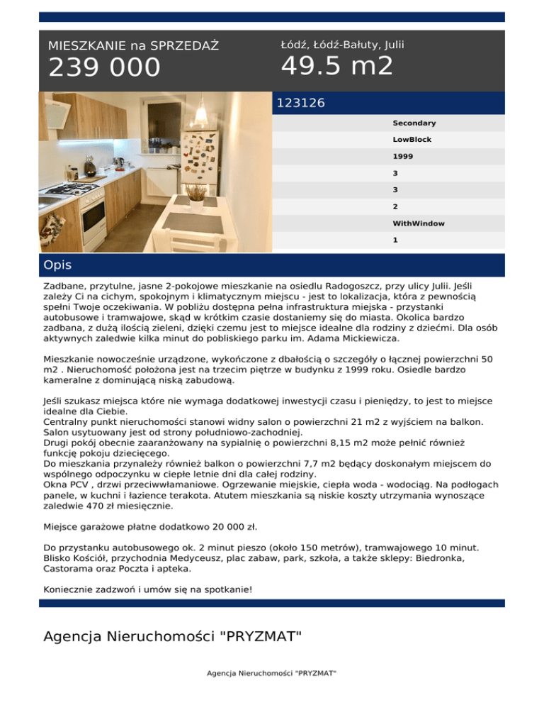 MIESZKANIE na SPRZEDAŻ 239 000 Łódź, Łódź-Bałuty, Julii 49.5 m2 123126 Secondary LowBlock 1999 3 3 2 WithWindow 1 Opis Zadbane, przytulne, jasne 2-pokojowe mieszkanie na osiedlu Radogoszcz, przy ulicy Julii. Jeśli zależy Ci na cichym, spokojnym i klimatycznym miejscu - jest to lokalizacja, która z pewnością spełni Twoje oczekiwania. W pobliżu dostępna pełna infrastruktura miejska - przystanki autobusowe i tramwajowe, skąd w krótkim czasie dostaniemy się do miasta. Okolica bardzo zadbana, z dużą ilością zieleni, dzięki czemu jest to miejsce idealne dla rodziny z dziećmi. Dla osób aktywnych zaledwie kilka minut do pobliskiego parku im. Adama Mickiewicza. Mieszkanie nowocześnie urządzone, wykończone z dbałością o szczegóły o łącznej powierzchni 50 m2 . Nieruchomość położona jest na trzecim piętrze w budynku z 1999 roku. Osiedle bardzo kameralne z dominującą niską zabudową. Jeśli szukasz miejsca które nie wymaga dodatkowej inwestycji czasu i pieniędzy, to jest to miejsce idealne dla Ciebie. Centralny punkt nieruchomości stanowi widny salon o powierzchni 21 m2 z wyjściem na balkon. Salon usytuowany jest od strony południowo-zachodniej. Drugi pokój obecnie zaaranżowany na sypialnię o powierzchni 8,15 m2 może pełnić również funkcję pokoju dziecięcego. Do mieszkania przynależy również balkon o powierzchni 7,7 m2 będący doskonałym miejscem do wspólnego odpoczynku w ciepłe letnie dni dla całej rodziny. Okna PCV , drzwi przeciwwłamaniowe. Ogrzewanie miejskie, ciepła woda - wodociąg. Na podłogach panele, w kuchni i łazience terakota. Atutem mieszkania są niskie koszty utrzymania wynoszące zaledwie 470 zł miesięcznie. Miejsce garażowe płatne dodatkowo 20 000 zł. Do przystanku autobusowego ok. 2 minut pieszo (około 150 metrów), tramwajowego 10 minut. Blisko Kościół, przychodnia Medyceusz, plac zabaw, park, szkoła, a także sklepy: Biedronka, Castorama oraz Poczta i apteka. Koniecznie zadzwoń i umów się na spotkanie! Agencja Nieruchomości "PRYZMAT" Agencja Nieruchomości "PRYZMAT" tel. 25 758 66 26 email: [email protected] Agencja Nieruchomości "PRYZMAT" Powered by TCPDF (www.tcpdf.org)