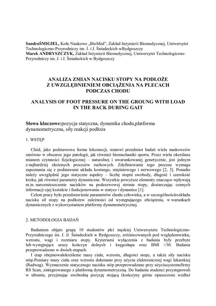 SandraŚMIGIEL, Koło Naukowe „BioMed”, Zakład Inżynierii Biomedycznej, Uniwersytet Technologiczno-Przyrodniczy im. J. i J. Śniadeckich wBydgoszczy Marek ANDRYSZCZYK, Zakład Inżynierii Biomedycznej, Uniwersytet TechnologicznoPrzyrodniczy im. J. i J. Śniadeckich w Bydgoszczy ANALIZA ZMIAN NACISKU STOPY NA PODŁOŻE Z UWZGLĘDNIENIEM OBCIĄŻENIA NA PLECACH PODCZAS CHODU ANALYSIS OF FOOT PRESSURE ON THE GROUNG WITH LOAD IN THE BACK DURING GAIT Słowa kluczowe:pozycja statyczna, dynamika chodu,platforma dynamometryczna, siły reakcji podłoża 1. WSTĘP Chód, jako podstawowa forma lokomocji, stanowi przedmiot badań wielu naukowców zarówno w obszarze jego patologii, jak również biomechaniki sportu. Przez wielu określana mianem czynności fizjologicznej – naturalnej i uwarunkowanej genetycznie, jest jednym z najbardziej złożonych procesów ruchowych. Zdefiniowanie tego procesu wymaga zapoznania się z podstawami układu kostnego, mięśniowego i nerwowego [2, 3]. Ponadto należy uwzględnić jego statyczne aspekty – liczbę stopni swobody, długość i szerokość kroku, jak również parametry dynamiczne. Wszystkie powyższe elementy znacząco wpływają m.in. narozmieszczenie nacisków na podeszwowej stronie stopy, dostarczając cennych informacji ojej kształcie i funkcjonowaniu w statyce i dynamice [1]. Celem pracy było przedstawienie parametrów chodu człowieka, a w szczególnościrozkładu nacisku sił stopy na podłożew zależności od występującego obciążenia, w warunkach dynamicznych z wykorzystaniem platformy dynamometrycznej. 2. METODOLOGIA BADAŃ Badaniem objęto grupę 10 studentów płci męskiej Uniwersytetu TechnologicznoPrzyrodniczego im. J. iJ. Śniadeckich w Bydgoszczy, zróżnicowanych pod względemwieku, wzrostu, wagi i rozmiaru stopy. Kryteriami wyłączenia z badania były przebyte lub występujące urazy kończyn dolnych i kręgosłupa oraz BMI >30. Badania przeprowadzono w dwóch etapach. I etap obejmowałokreślenie masy ciała, wzrostu, długości stopy, a także siły nacisku stóp.Pomiary masy ciała oraz wzrostu dokonano przy użyciu elektronicznej wagi lekarskiej (Radwag). Wyznaczenie statycznego nacisku stóp przeprowadzano przy użyciusystemufirmy RS Scan, zintegrowanego z platformą dynamometryczną. Do badania studenci przystępowali w ubraniu, przyjmując swobodną pozycję stojącą (kończyny górne opuszczone wzdłuż XII Konferencja Naukowa Majówka Młodych Biomechaników im. prof. Dagmary Tejszerskiej s. 140 tułowia) z bosymi stopami równolegle rozstawionymi w środkowej części platformy. Na podstawie tych danych określano wskaźnik BMI badanych, prawidłowe długości stópi rozkład ich obciążenia. W II etapie badań przeprowadzono testy dynamiczne (w trakcie chodu) z wykorzystaniem platformy dynamometrycznej. Wykonywano kolejno trzy pomiary: bez dodatkowego obciążenia, z obciążeniem 10% i 20% masy ciała. Obciążenie stanowił plecak umieszczony na plecach badanych, wraz z umieszczonymi obciążnikami. Przed każdą próbą określano statyczną wartość nacisku stóp, po czym badani stawali na starcie wyznaczonej trasy i przechodzili po niej stawiając w pierwszym kroku lewą stopę na platformie. Wynikiem każdego z pomiarów byłmaksymalny nacisk części anatomicznych stopy na podłoże. W dalszej ocenie wykorzystywano pomiary będące sumą nacisków poszczególnych obszarów stopy, stanowiących cztery strefy: pięty, śródstopia, przodostopia i palców. Uzyskane wyniki opracowano na podstawie graficznej oceny rozkładu sił nacisku z platformy dynamometrycznej oraz analizy statystycznej wykonanej w pakiecie Statistica. 3. WYNIKI I DYSKUSJA Przeprowadzone testy statystyczne wykazały znaczący wzrost nacisku stopy na podłoże w sektorach przodostopia(M2-M5) oraz pięty(HM i HL),dla 10% obciążenia.W obszarze przodostopia-II i III głowy jej kości - wartość nacisku zwiększyła się o 20%. Natomiast w obszarze pięty wzrost ten był tylko na poziomie większym o 10%. Nie zauważono znaczących różnic porównując obciążenia 10% i 20%, co wiązano przy zmianie obciążeniaze zwiększoną powierzchnią kontaktu stopy z podłożem i rozłożeniem przenoszonego obciążenia. Ocena obciążeń pozostałych segmentów stopy nie wykazała istotnych zmian. 4. PODSUMOWANIE Na podstawie uzyskanych wyników można stwierdzić, że strefami najbardziej obciążanymi sąprzodostopie i pięta, co pozwala stwierdzić, że stanowią onegłównyobszar dystrybucji obciążeń w trakcie chodu, dodatkowo w obszarze przodostopia wzrasta w istotny sposób stosunek obciążenia do całkowitego nacisku stopy na podłoże. Przedstawione badania stanowią metodę analizy rozkładu sił nacisku poszczególnych stref stopy na podłoże, która może być podstawą w diagnostyce zmian chorobowychstóp. LITERATURA [1] Balzer J., Bauer C., Linden M., Schelldorfer S.: Effects of simulater crouch gait on foot kinematics and kinetics in healthy children. Gait & Posture, Elsevier, 2013 [2] Bober T., Zawadzki J.: Biomechanika układu ruchu człowieka. Wyd. 3, Wydawnictwo BK, Wrocław, 2006 [3] Kundson D.: Fundamentals of Biomechanics. Second Edition, Springer Science+Busines Media, LLC, New York, 2007