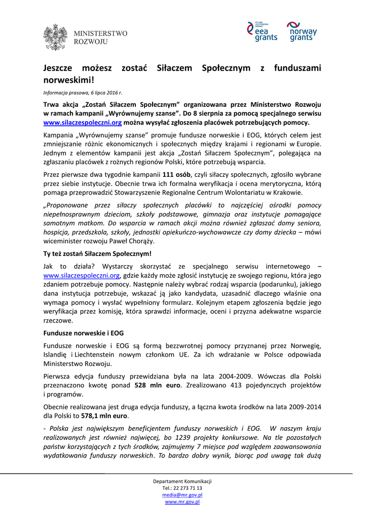 Jeszcze możesz norweskimi! zostać Siłaczem Społecznym z funduszami Informacja prasowa, 6 lipca 2016 r. Trwa akcja „Zostań Siłaczem Społecznym” organizowana przez Ministerstwo Rozwoju w ramach kampanii „Wyrównujemy szanse”. Do 8 sierpnia za pomocą specjalnego serwisu www.silaczespoleczni.org można wysyłać zgłoszenia placówek potrzebujących pomocy. Kampania „Wyrównujemy szanse” promuje fundusze norweskie i EOG, których celem jest zmniejszanie różnic ekonomicznych i społecznych między krajami i regionami w Europie. Jednym z elementów kampanii jest akcja „Zostań Siłaczem Społecznym”, polegająca na zgłaszaniu placówek z rożnych regionów Polski, które potrzebują wsparcia. Przez pierwsze dwa tygodnie kampanii 111 osób, czyli siłaczy społecznych, zgłosiło wybrane przez siebie instytucje. Obecnie trwa ich formalna weryfikacja i ocena merytoryczna, którą pomaga przeprowadzić Stowarzyszenie Regionalne Centrum Wolontariatu w Krakowie. „Proponowane przez siłaczy społecznych placówki to najczęściej ośrodki pomocy niepełnosprawnym dzieciom, szkoły podstawowe, gimnazja oraz instytucje pomagające samotnym matkom. Do wsparcia w ramach akcji można również zgłaszać domy seniora, hospicja, przedszkola, szkoły, jednostki opiekuńczo-wychowawcze czy domy dziecka – mówi wiceminister rozwoju Paweł Chorąży. Ty też zostań Siłaczem Społecznym! Jak to działa? Wystarczy skorzystać ze specjalnego serwisu internetowego – www.silaczespoleczni.org, gdzie każdy może zgłosić instytucję ze swojego regionu, która jego zdaniem potrzebuje pomocy. Następnie należy wybrać rodzaj wsparcia (podarunku), jakiego dana instytucja potrzebuje, wskazać ją jako kandydata, uzasadnić dlaczego właśnie ona wymaga pomocy i wysłać wypełniony formularz. Kolejnym etapem zgłoszenia będzie jego weryfikacja przez komisję, która sprawdzi informacje, oceni i przyzna adekwatne wsparcie rzeczowe. Fundusze norweskie i EOG Fundusze norweskie i EOG są formą bezzwrotnej pomocy przyznanej przez Norwegię, Islandię i Liechtenstein nowym członkom UE. Za ich wdrażanie w Polsce odpowiada Ministerstwo Rozwoju. Pierwsza edycja funduszy przewidziana była na lata 2004-2009. Wówczas dla Polski przeznaczono kwotę ponad 528 mln euro. Zrealizowano 413 pojedynczych projektów i programów. Obecnie realizowana jest druga edycja funduszy, a łączna kwota środków na lata 2009-2014 dla Polski to 578,1 mln euro. - Polska jest największym beneficjentem funduszy norweskich i EOG. W naszym kraju realizowanych jest również najwięcej, bo 1239 projekty konkursowe. Na tle pozostałych państw korzystających z tych środków, zajmujemy 7 miejsce pod względem zaawansowania wydatkowania funduszy norweskich. To bardzo dobry wynik, biorąc pod uwagę tak dużą Departament Komunikacji Tel.: 22 273 71 13 [email protected] www.mr.gov.pl alokację. Obserwujemy wysoką dynamikę płatności zarówno na poziomie projektów, jak i programów – mówi wiceminister rozwoju Paweł Chorąży. Wśród instytucji, które otrzymały wsparcie dzięki funduszom norweskim można wymienić m.in: Wyremontowany Oddział Anestezjologii i Intensywnej Terapii Dzieci i Noworodków w opolskim Wojewódzkim Centrum Medycznym, Bank kobiecego mleka w Opolskim Centrum Ginekologii, Położnictwa i Neonatologii, Instytut „Centrum Zdrowia Matki Polki” w Łodzi – termomodernizacja, Szpital Kliniczny Przemienienia Pańskiego Uniwersytetu Medycznego im. Karola Marcinkowskiego w Poznaniu, gdzie rozbudowano laboratorium diagnostyki hematologicznej oraz pracownię histopatologii wraz z przebudową i modernizacją pracowni endoskopii onkologicznej. Nowa edycja fundusz norweskich 2014-2021 3 maja 2016 r. podpisano porozumienia pomiędzy Islandią, Liechtensteinem i Norwegią a Unią Europejską w sprawie funduszy norweskich i funduszy EOG na okres od 1 maja 2014 r. do 30 kwietnia 2021 r. Polska pozostanie największym beneficjentem tych środków - alokacja przewidziana dla naszego kraju to 809,3 mln euro. Podpisanie porozumień z UE umożliwia rozpoczęcie oficjalnych negocjacji bilateralnych Polski z darczyńcami, dotyczących wykorzystania tych funduszy. Szczegółowe informacje na temat funkcjonowania funduszy norweskich i EOG znajdują się na stronie: http://www.eog.gov.pl/ Departament Komunikacji Tel.: 22 273 71 13 [email protected] www.mr.gov.pl