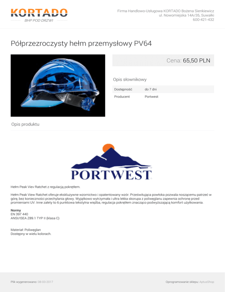 Firma Handlowo-Usługowa KORTADO Bożena Sienkiewicz ul. Nowomiejska 14A/35, Suwałki 600-421-432 Półprzezroczysty hełm przemysłowy PV64 Cena: 65,50 PLN Opis słownikowy Dostępność do 7 dni Producent Portwest Opis produktu Hełm Peak Viev Ratchet z regulacją pokrętłem. Hełm Peak View Ratchet oferuje ekskluzywne wzornictwo i opatentowany wzór. Prześwitująca powłoka pozwala noszącemu patrzeć w górę, bez konieczności przechylania głowy. Wyjątkowo wytrzymała i ultra lekka skorupa z poliwęglanu zapewnia ochronę przed promieniami UV. Inne zalety to 6 punktowa tekstylna więźba, regulacja pokrętłem znacząco podwyższającą komfort użytkowania. Normy EN 397 440 ANSI/ISEA Z89.1 TYP II (klasa C) Materiał: Poliwęglan Dostępny w wielu kolorach. Plik wygenerowano: 08-03-2017 Oprogramowanie sklepu: AptusShop Firma Handlowo-Usługowa KORTADO Bożena Sienkiewicz ul. Nowomiejska 14A/35, Suwałki 600-421-432 Parametry Kolor Niebieski , Przezroczysty, Zielony , Pomarańczowy, Różowy , Czerwony, Przydymiony, Żółty Galeria Plik wygenerowano: 08-03-2017 Powered by TCPDF (www.tcpdf.org) Oprogramowanie sklepu: AptusShop