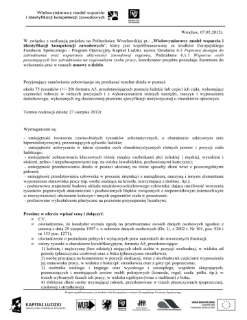 Wielowymiarowy model wsparcia i identyfikacji kompetencji zawodowych Wrocław, 07.05.2012r. W związku z realizacją projektu na Politechnice Wrocławskiej pt.: „Wielowymiarowy model wsparcia i identyfikacji kompetencji zawodowych”, który jest współfinansowany ze środków Europejskiego Funduszu Społecznego - Program Operacyjny Kapitał Ludzki, nazwa Działania 6.1 Poprawa dostępu do zatrudnienia oraz wspieranie aktywności zawodowej regionie, Podziałanie 6.1.1 Wsparcie osób pozostających bez zatrudnienia na regionalnym rynku pracy, koordynator projektu poszukuje ilustratora do wykonania prac w ramach umowy o dzieło. Przyjmujący zamówienie zobowiązuje się przekazać rezultat dzieła w postaci: około 75 rysunków (+/- 20) formatu A5, przedstawiających postacie ludzkie lub części ich ciała, wykonujące czynności robocze w różnych pozycjach i z wykorzystaniem różnych narzędzi, maszyn i wyposażenia dodatkowego, wykonanych wg dostarczonej pisemnie specyfikacji merytorycznej o charakterze opisowym. Termin realizacji dzieła: 27 sierpnia 2012r. Wymaganiami są: - umiejętność tworzenia czarno-białych rysunków schematycznych, o charakterze szkicowym (nie hiperrealistycznym), prezentujących sylwetki ludzkie; - umiejętność uchwycenia w takim rysunku cech charakterystycznych różnych postaw i pozycji ciała ludzkiego; - umiejętność zobrazowania kluczowych różnic między osobnikami płci żeńskiej i męskiej, wysokimi i niskimi, pełno- i niepełnosprawnymi (np. na wózku inwalidzkim, pozbawionymi kończyny); - umiejętność przedstawienia detalu w postaci ułożonej na różne sposoby dłoni wraz z poszczególnymi palcami; - umiejętność przedstawienia człowieka w procesie interakcji z narzędziem, maszyną i innymi elementami wyposażenia stanowiska pracy (np. osoba siedząca na krześle, korzystająca z drabiny, itp.); - podstawowa znajomość budowy układu mięśniowo-szkieletowego człowieka, dająca możliwość tworzenia rysunków poprawnych anatomicznie i pozbawionych błędów związanych z nieprawidłowym (niemożliwym w rzeczywistości) ułożeniem kończyn i innych segmentów ciała w przestrzeni; - preferowane wykształcenie plastyczne na poziomie przynajmniej licealnym; Prosimy w ofercie wpisać cenę i dołączyć: • CV, • oświadczenie, że kandydat wyraża zgodę na przetwarzanie swoich danych osobowych zgodnie z ustawą z dnia 29 sierpnia 1997 r. o ochronie danych osobowych (Dz. U. z 2002 r. Nr 101, poz. 926 i nr 153 poz. 1271), • oświadczenie o posiadaniu pełnych i wyłącznych praw autorskich do stworzonych ilustracji, • cztery rysunki o charakterze kwalifikacyjnym, formatu A5, przedstawiające: 1) kobietę i mężczyznę (bez odzieży) stojących obok siebie w pozycji swobodnej, w widoku od przodu (płaszczyzna czołowa) oraz z boku (płaszczyzna strzałkowa), 2) osobę pracującą na komputerze w pozycji siedzącej, wraz z niezbędnymi częściami wyposażenia jej stanowiska pracy, w widoku z boku (pł. strzałkowa) oraz z góry (pł. poprzeczna), 3) osobnika niskiego i krępego oraz wysokiego i szczupłego, wspólnie skręcających, przenoszących i montujących zestaw mebli pokojowych (komoda, regał, szafa, półki, itp.), w trzech wybranych fazach ich pracy, w widoku ogólnym (wraz z meblami) z boku, 4) zbliżenie dłoni osoby trzymającej młotek, przedstawione w trzech płaszczyznach (poprzecznej, czołowej i strzałkowej). Projekt współfinansowany ze środków Unii Europejskiej w ramach Europejskiego Funduszu Społecznego. Wielowymiarowy model wsparcia i identyfikacji kompetencji zawodowych • rysunki należy wykonać wg następującej specyfikacji technicznej (obowiązującej również podczas realizacji dzieła): - rysunki należy dostarczyć na nośniku cyfrowym (płyta CD/DVD, pendrive, itp.), każdy rysunek zapisany w osobnym pliku; - rysunki stworzone przy pomocy oprogramowania komputerowego do grafiki wektorowej (np. Adobe Illustrator, CorelDRAW) powinny być zapisane w odpowiednim formacie wektorowym (np. AI, CDR) oraz wyrenderowane do bezstratnych formatów bitmapowych (PNG, BMP lub TIFF) w rozdzielczości 600 DPI; - rysunki wykonywane przy pomocy oprogramowania komputerowego do grafiki bitmapowej (np. Adobe Photoshop, GIMP) powinny być stworzone w rozdzielczości natywnej 600 DPI i zapisane w bezstratnym formacie bitmapowym (PNG, BMP lub TIFF) w tej samej rozdzielczości; - rysunki stworzone odręcznie na papierze lub innym medium powinny być zeskanowane i zapisane w bezstratnym formacie bitmapowym (PNG, BMP lub TIFF) w rozdzielczości 600 DPI, przy czym należy bezwzględnie dopilnować, by w każdym przypadku tło rysunku było jednolicie białe, bez przebić i zabrudzeń, a kreska czytelna, odpowiednio kontrastowa i ostra. Oferty należy składać do 28 maja 2012 do godz. 15.00 w Sekretariacie Instytutu Organizacji i Zarządzania, Wrocław ul. Łukasiewicza 5, bud. B-4 Politechniki Wrocławskiej, pok. 514. Oferty otrzymane po terminie składania ofert nie będą rozpatrywane. Przy wyborze oferty będzie brana pod uwagę cena za wykonanie dzieła i zgodność rysunków z podanymi wymaganiami. W razie pytań dotyczących kwestii formalnych proszę o kontakt z koordynatorem projektu dr inż. Katarzyną Jach, tel. 71 348 50 50, e-mail: [email protected], ul. Chełmońskiego 16, Wrocław 51-630, Bud. P-2 Politechniki Wrocławskiej, p. 43. W razie pytań dotyczących technicznych wymagań (rysunki) proszę o kontakt z dr inż. Marcinem Kulińskim, tel. 71 348 50 50, e-mail: [email protected], ul. Chełmońskiego 16, Wrocław 51630, Bud. P-2 Politechniki Wrocławskiej, p. 43. Projekt współfinansowany ze środków Unii Europejskiej w ramach Europejskiego Funduszu Społecznego.