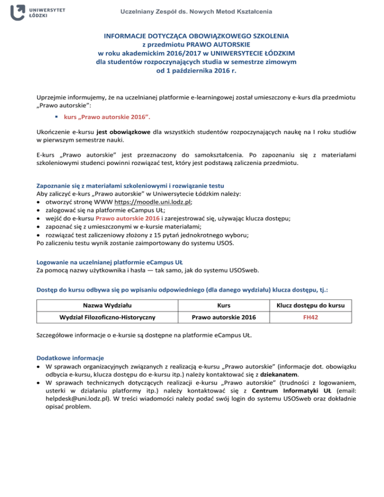 Uczelniany Zespół ds. Nowych Metod Kształcenia INFORMACJE DOTYCZĄCA OBOWIĄZKOWEGO SZKOLENIA z przedmiotu PRAWO AUTORSKIE w roku akademickim 2016/2017 w UNIWERSYTECIE ŁÓDZKIM dla studentów rozpoczynających studia w semestrze zimowym od 1 października 2016 r. Uprzejmie informujemy, że na uczelnianej platformie e-learningowej został umieszczony e-kurs dla przedmiotu „Prawo autorskie”: kurs „Prawo autorskie 2016”. Ukończenie e-kursu jest obowiązkowe dla wszystkich studentów rozpoczynających naukę na I roku studiów w pierwszym semestrze nauki. E-kurs „Prawo autorskie” jest przeznaczony do samokształcenia. Po zapoznaniu się z materiałami szkoleniowymi studenci powinni rozwiązać test, który jest podstawą zaliczenia przedmiotu. Zapoznanie się z materiałami szkoleniowymi i rozwiązanie testu Aby zaliczyć e-kurs „Prawo autorskie” w Uniwersytecie Łódzkim należy: otworzyć stronę WWW https://moodle.uni.lodz.pl; zalogować się na platformie eCampus UŁ; wejść do e-kursu Prawo autorskie 2016 i zarejestrować się, używając klucza dostępu; zapoznać się z umieszczonymi w e-kursie materiałami; rozwiązać test zaliczeniowy złożony z 15 pytań jednokrotnego wyboru; Po zaliczeniu testu wynik zostanie zaimportowany do systemu USOS. Logowanie na uczelnianej platformie eCampus UŁ Za pomocą nazwy użytkownika i hasła — tak samo, jak do systemu USOSweb. Dostęp do kursu odbywa się po wpisaniu odpowiedniego (dla danego wydziału) klucza dostępu, tj.: Nazwa Wydziału Kurs Klucz dostępu do kursu Wydział Filozoficzno-Historyczny Prawo autorskie 2016 FH42 Szczegółowe informacje o e-kursie są dostępne na platformie eCampus UŁ. Dodatkowe informacje W sprawach organizacyjnych związanych z realizacją e-kursu „Prawo autorskie” (informacje dot. obowiązku odbycia e-kursu, klucza dostępu do e-kursu itp.) należy kontaktować się z dziekanatem. W sprawach technicznych dotyczących realizacji e-kursu „Prawo autorskie” (trudności z logowaniem, usterki w działaniu platformy itp.) należy kontaktować się z Centrum Informatyki UŁ (email: [email protected]). W treści wiadomości należy podać swój login do systemu USOSweb oraz dokładnie opisać problem.
