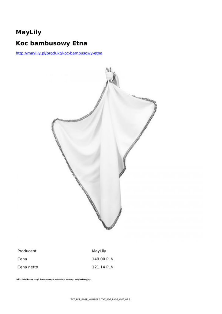 MayLily Koc bambusowy Etna http://maylily.pl/produkt/koc-bambusowy-etna Producent MayLily Cena 149.00 PLN Cena netto 121.14 PLN Lekki i delikatny kocyk bambusowy - naturalny, zdrowy, antybakteryjny. TXT_PDF_PAGE_NUMBER 1 TXT_PDF_PAGE_OUT_OF 2 Idealny dla młodzieży i dorosłych Wspaniale sprawdzi się w lecie - na plażę, na wycieczkę, do samochodu, samolotu W kolorze śmietankowym z pomponikami w kolorze szarym. Dlaczego warto go mieć? Jest antybakteryjny i antygrzybiczny, dzięki czemu znakomicie sprawdza się w przypadku nawet najbardziej wrażliwej skóry, skłonnej do alergii Jest bardzo chłonny - absorbuje wilgoć nawet o 70% lepiej niż bawełna, dzięki czemu jest idealny na lato Jest niezwykle miły i delikatny w dotyku Ma właściwości termoregulacyjne - w lecie przyjemnie chłodzi, zimą delikatnie ogrzewa Został uszyty z tkaniny wyprodukowanej w Polsce Cechy produktu Skład 100% bambus Wymiary 120 x 150 cm Czy można prać w pralce? 1 TXT_PDF_PAGE_NUMBER 2 TXT_PDF_PAGE_OUT_OF 2