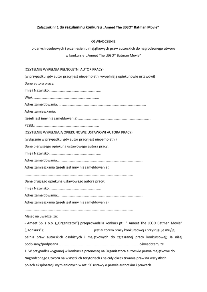 Załącznik nr 1 do regulaminu konkursu „Ameet The LEGO® Batman Movie” OŚWIADCZENIE o danych osobowych i przeniesieniu majątkowych praw autorskich do nagrodzonego utworu w konkursie „Ameet The LEGO® Batman Movie” (CZYTELNIE WYPEŁNIA PEŁNOLETNI AUTOR PRACY) (w przypadku, gdy autor pracy jest niepełnoletni wypełniają opiekunowie ustawowi) Dane autora pracy: Imię i Nazwisko: ………………………………………………… Wiek:……………………………………………………………….. Adres zameldowania: ……………………………………………………………………………………… Adres zamieszkania: (jeżeli jest inny niż zameldowania) ………………………………………………………………………. PESEL: ……………………………………………………………… (CZYTELNIE WYPEŁNIAJĄ OPIEKUNOWIE USTAWOWI AUTORA PRACY) (wyłącznie w przypadku, gdy autor pracy jest niepełnoletni) Dane pierwszego opiekuna ustawowego autora pracy: Imię i Nazwisko: ………………………………………………… Adres zameldowania:……………………………………………………………………………………. Adres zamieszkania (jeżeli jest inny niż zameldowania ) …………………………………………………………………………………………………………… Dane drugiego opiekuna ustawowego autora pracy: Imię i Nazwisko: ………………………………………………… Adres zameldowania:……………………………………………………………………………………. Adres zamieszkania (jeżeli jest inny niż zameldowania) …………………………………………………………………………………………………………… Mając na uwadze, że: - Ameet Sp. z o.o. („Organizator”) przeprowadziła konkurs pt.: “ Ameet The LEGO Batman Movie” („Konkurs”); ………………………………………………..jest autorem pracy konkursowej i przysługuje mu/jej pełnia praw autorskich osobistych i majątkowych do zgłaszanej pracy konkursowej; Ja niżej podpisany/podpisana ………………………………………...…………………………………... oświadczam, że 1. W przypadku wygranej w konkursie przenoszę na Organizatora autorskie prawa majątkowe do Nagrodzonego Utworu na wszystkich terytoriach i na cały okres trwania praw na wszystkich polach eksploatacji wymienionych w art. 50 ustawy o prawie autorskim i prawach pokrewnych, w szczególności na następujących polach eksploatacji: a. utrwalenie i zwielokrotnienie - wytworzenie dowolną techniką jego egzemplarzy w tym w szczególności techniką drukarską, reprograficzną, zapisu magnetycznego, techniką cyfrową, b. wprowadzenie do obrotu, najem, użyczenie, publiczne rozpowszechnianie oryginału lub egzemplarzy, na których go utrwalono, poprzez publiczne wykonanie, wystawienie, wyświetlenie, odtworzenie oraz nadawanie i reemitowanie, a także publiczne udostępnianie utworu w taki sposób, aby każdy mógł mieć do niego dostęp w miejscu i czasie przez siebie wybranym, c. wykorzystanie całości lub pojedynczych elementów w celu wprowadzenia utworów do obrotu, w sposób określony w lit. b, d. wykorzystanie całości lub pojedynczych elementów w celu stworzenia dowolnych materiałów reklamowych (reklamy prasowe, ulotki, plakaty o dowolnych rozmiarach, materiały okolicznościowe) oraz korzystania z nich, a w szczególności wprowadzania do obrotu, w sposób określony w lit. b, e. rozpowszechnianie i udostępnianie w sieci Internet poprzez wprowadzenie do pamięci komputera bez względu na ilość nadań, emisji, wytworzonych egzemplarzy. 2. Nagrodzony Utwór jest utworem oryginalnym, nie narusza ustawy z dnia 4 lutego 1994 r. o prawie autorskim i prawa pokrewnych ani jakichkolwiek praw osób trzecich oraz nie jest obciążony prawami osób trzecich. Nagrodzony Utwór może być wykorzystywany zarówno w całości, jak i w części. 3. Upoważniam Organizatora do: a. decydowania w jego imieniu o pierwszym publicznym rozpowszechnieniu zgłoszonej pracy, b. przeprowadzenia w jego imieniu nadzoru autorskiego przed rozpowszechnieniem zgłoszonej przez niego pracy, c. rozpowszechnienia zgłoszonej pracy anonimowo. 4. Zezwalam na wykonywanie przez Organizatora praw zależnych do Nagrodzonego Utworu w rozumieniu ustawy z dnia 4 lutego 1994 r. o prawie autorskim i prawa pokrewnych, w szczególności do rozporządzania i korzystania z opracowania, przeróbki i adaptacji Nagrodzonego Utworu. 5. Przeniesienie praw autorskich do Nagrodzonego Utworu następuje w zamian za przyznaną nagrodę. Organizator nabywa własność nadesłanego egzemplarza Nagrodzonego Utworu. Jako przedstawiciele ustawowi/opiekunowie Autora pracy wyrażam zgodę na udział mego podopiecznego w niniejszym konkursie oraz akceptuję warunki niniejszego Regulaminu. Potwierdzam również, iż zgadzam się, aby doszło do cesji praw i udzielenia upoważnień określonych w niniejszym dokumencie. Będąc autorem / przedstawicielami ustawowymi / opiekunami Autora pracy jako miejsce wysłania ewentualnej nagrody w Konkursie wskazuję / wskazujemy adres: Imię i Nazwisko: ……………………………………………………………….. Adres: ul. ……………………………………………, nr domu …………, nr mieszania …………. Kod pocztowy: ……………………., miasto: ……………………………… Jako dane kontaktowe z Autorem / przedstawicielami ustawowymi / opiekunami Autora w sprawach związanych z konkursem ustalam/-y: Imię i Nazwisko: …………………………………………………….. adres e-mail kontaktowego: ……………………………………………………………. nr telefonu kontaktowego:………………………………………………….. ____________________________ 
