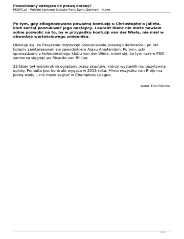 Poszukiwany zastępca na prawą obronę? PSGFC.pl - Polskie centrum kibiców Paris Saint-Germain - News Po tym, gdy zdiagnozowano poważną kontuzję u Chriostophe'a Jalleta, klub zaczął poszukiwać jego następcy. Laurent Blanc nie może bowiem sobie pozwolić na to, by w przypadku kontuzji van der Wiela, nie miał w obwodzie wartościowego zmiennika. Okazuje się, że Paryżanie rozpoczęli poszukiwania prawego defensora i po raz kolejny zainteresowali się zawodnikiem Ajaxu Amsterdam. Po tym, gdy sprowadzono z holenderskiego klubu van der Wiela, mówi się, że tym razem PSG zamierza sięgnąć po Ricardo van Rhijna. 22-latek był wielokrotnie oglądany przez skautów, którzy wystawili mu pozytywną opinię. Ponadto jest kontrakt wygasa w 2015 roku. Mimo wszystko van Rhijn ma jedną wadę... nie może zagrać w Champions League. Autor: Don Patrizio 1/1 Powered by TCPDF (www.tcpdf.org)