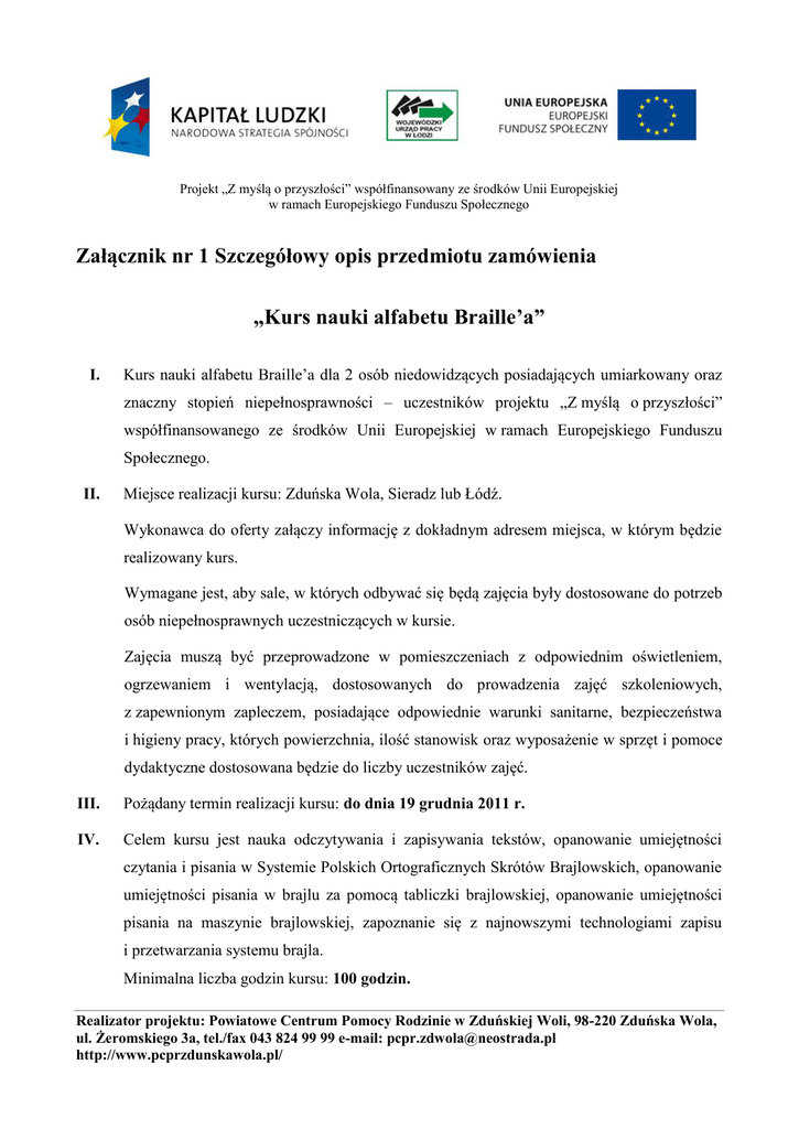Projekt „Z myślą o przyszłości” współfinansowany ze środków Unii Europejskiej w ramach Europejskiego Funduszu Społecznego Załącznik nr 1 Szczegółowy opis przedmiotu zamówienia „Kurs nauki alfabetu Braille’a” I. Kurs nauki alfabetu Braille’a dla 2 osób niedowidzących posiadających umiarkowany oraz znaczny stopień niepełnosprawności – uczestników projektu „Z myślą o przyszłości” współfinansowanego ze środków Unii Europejskiej w ramach Europejskiego Funduszu Społecznego. II. Miejsce realizacji kursu: Zduńska Wola, Sieradz lub Łódź. Wykonawca do oferty załączy informację z dokładnym adresem miejsca, w którym będzie realizowany kurs. Wymagane jest, aby sale, w których odbywać się będą zajęcia były dostosowane do potrzeb osób niepełnosprawnych uczestniczących w kursie. Zajęcia muszą być przeprowadzone w pomieszczeniach z odpowiednim oświetleniem, ogrzewaniem i wentylacją, dostosowanych do prowadzenia zajęć szkoleniowych, z zapewnionym zapleczem, posiadające odpowiednie warunki sanitarne, bezpieczeństwa i higieny pracy, których powierzchnia, ilość stanowisk oraz wyposażenie w sprzęt i pomoce dydaktyczne dostosowana będzie do liczby uczestników zajęć. III. Pożądany termin realizacji kursu: do dnia 19 grudnia 2011 r. IV. Celem kursu jest nauka odczytywania i zapisywania tekstów, opanowanie umiejętności czytania i pisania w Systemie Polskich Ortograficznych Skrótów Brajlowskich, opanowanie umiejętności pisania w brajlu za pomocą tabliczki brajlowskiej, opanowanie umiejętności pisania na maszynie brajlowskiej, zapoznanie się z najnowszymi technologiami zapisu i przetwarzania systemu brajla. Minimalna liczba godzin kursu: 100 godzin. Realizator projektu: Powiatowe Centrum Pomocy Rodzinie w Zduńskiej Woli, 98-220 Zduńska Wola, ul. Żeromskiego 3a, tel./fax 043 824 99 99 e-mail: [email protected] http://www.pcprzdunskawola.pl/ Projekt „Z myślą o przyszłości” współfinansowany ze środków Unii Europejskiej w ramach Europejskiego Funduszu Społecznego V. Kadra szkoląca W ramach organizacji i realizacji kursu wykonawca ma obowiązek zapewnić minimum 1 wykładowcę posiadającego odpowiednie kwalifikacje do przeprowadzenia kursu, który posiada kwalifikacje zawodowe, doświadczenie i wykształcenie umożliwiające realizację kursu. Kwalifikacje i umiejętności wykładowcy powinny być adekwatne do zakresu programowego prowadzonego przez niego zajęć. VI. Potencjał techniczny Wykonawca zobowiązany jest do zapewnienia niezbędnego sprzętu do przeprowadzenia kursu m. in.: tabliczki brajlowskiej, maszyny brajlowskiej, drukarki brajlowskiej oraz linijki brajlowskiej. VII. Ponadto: 1. Wykonawca zapewni uczestnikom w dniach kursu drobny poczęstunek (np. kawa, herbata, woda mineralna, ciastka lub podobne) oraz ciepły posiłek, do czasu trwania kursu nie wlicza się przerw kawowych, przerw obiadowych, ani też innych przerw technicznych. 2. Wykonawca zobowiązany jest w przypadku organizacji kursu w Sieradzu lub Łodzi zapewnić uczestnikom kursu transport ze Zduńskiej Woli (zbiórka pod siedzibą PCPRu) do miejsca odbywania kursu i z powrotem. Koszty transportu należy ująć w koszcie kursu 3. Wykonawca zobowiązany jest zapewnić ubezpieczenie uczestników w drodze na kurs, podczas jego trwania i z powrotem. Koszt ubezpieczenia NW należy ująć w koszcie kursu. 4. Wykonawca zobowiązany jest do przygotowania i druku materiałów dydaktycznych (dla każdego uczestnika kursu: program kursu i harmonogram zajęć zbindowane lub w inny sposób połączone, materiały szkoleniowe, długopis, notatnik, dodatkowe multimedialne Realizator projektu: Powiatowe Centrum Pomocy Rodzinie w Zduńskiej Woli, 98-220 Zduńska Wola, ul. Żeromskiego 3a, tel./fax 043 824 99 99 e-mail: [email protected] http://www.pcprzdunskawola.pl/ Projekt „Z myślą o przyszłości” współfinansowany ze środków Unii Europejskiej w ramach Europejskiego Funduszu Społecznego lub/i papierowe materiały dydaktyczne oraz jeden komplet tak przygotowanych materiałów dla Zamawiającego, z naniesionymi odpowiednio logotypami, których wzór Wykonawca otrzyma od Zamawiającego. 5. Wykonawca zobowiązuje się do przeprowadzenia wśród uczestników szkolenia ankiety ewaluacyjnej na początku i na zakończenie szkolenia, oznaczonej odpowiednimi logotypami, których wzór otrzyma od Zamawiającego. 6. Wykonawca jest odpowiedzialny za zebranie wszystkich wypełnionych przez uczestników szkolenia ankiet i przekazanie ich Zamawiającemu po zakończeniu szkolenia. 7. Wykonawca zobowiązany jest umożliwić Zamawiającemu oznakowanie miejsca szkolenia oraz sal, w których prowadzone będą zajęcia, logo Unii Europejskiej, Europejskiego Funduszu Społecznego, Wojewódzkiego Urzędu Pracy w Łodzi, nazwą realizatora, nazwą programu i tytułem projektu oraz zamieszczenia informacji o współfinansowaniu projektu ze środków Unii Europejskiej w ramach Europejskiego Funduszu Społecznego. 8. Wykonawca w uzgodnieniu z Zamawiającym, wystawi uczestnikowi kursu zaświadczenie (certyfikat) uczestnictwa w kursie z logo Unii Europejskiej, EFS, Wojewódzkiego Urzędu Pracy w Łodzi, nazwą realizatora, tytułem projektu i nazwą programu. 9. Uczestnik na zakończenie kursu otrzyma zaświadczenie potwierdzające jego ukończenie na druku zgodnym z §6 Rozporządzenia Ministra Edukacji i Nauki z dnia 3 lutego 2006 r. w sprawie uzyskiwania i uzupełniania przez osoby dorosłe wiedzy ogólnej, umiejętności i kwalifikacji zawodowych w formach pozaszkolnych (Dz. U. Nr 31, poz. 216). Realizator projektu: Powiatowe Centrum Pomocy Rodzinie w Zduńskiej Woli, 98-220 Zduńska Wola, ul. Żeromskiego 3a, tel./fax 043 824 99 99 e-mail: [email protected] http://www.pcprzdunskawola.pl/ Projekt „Z myślą o przyszłości” współfinansowany ze środków Unii Europejskiej w ramach Europejskiego Funduszu Społecznego VIII. 1. Zamawiający zastrzega sobie