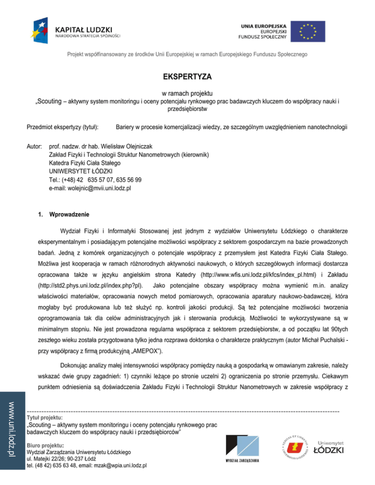Projekt współfinansowany ze środków Unii Europejskiej w ramach Europejskiego Funduszu Społecznego EKSPERTYZA w ramach projektu „Scouting – aktywny system monitoringu i oceny potencjału rynkowego prac badawczych kluczem do współpracy nauki i przedsiębiorstw Przedmiot ekspertyzy (tytuł): Autor: Bariery w procesie komercjalizacji wiedzy, ze szczególnym uwzględnieniem nanotechnologii prof. nadzw. dr hab. Wielisław Olejniczak Zakład Fizyki i Technologii Struktur Nanometrowych (kierownik) Katedra Fizyki Ciała Stałego UNIWERSYTET ŁÓDZKI Tel.: (+48) 42 635 57 07, 635 56 99 e-mail: [email protected] 1. Wprowadzenie Wydział Fizyki i Informatyki Stosowanej jest jednym z wydziałów Uniwersytetu Łódzkiego o charakterze eksperymentalnym i posiadającym potencjalne możliwości współpracy z sektorem gospodarczym na bazie prowadzonych badań. Jedną z komórek organizacyjnych o potencjale współpracy z przemysłem jest Katedra Fizyki Ciała Stałego. Możliwa jest kooperacja w ramach różnorodnych aktywności naukowych, o których szczegółowych informacji dostarcza opracowana także w języku angielskim strona Katedry (http://www.wfis.uni.lodz.pl/kfcs/index_pl.html) i Zakładu (http://std2.phys.uni.lodz.pl/index.php?pl). Jako potencjalne obszary współpracy można wymienić m.in. analizy właściwości materiałów, opracowania nowych metod pomiarowych, opracowania aparatury naukowo-badawczej, która mogłaby być produkowana lub też służyć np. kontroli jakości produkcji. Są też potencjalne możliwości tworzenia oprogramowania tak dla celów administracyjnych jak i sterowania produkcją. Możliwości te wykorzystywane są w minimalnym stopniu. Nie jest prowadzona regularna współpraca z sektorem przedsiębiorstw, a od początku lat 90tych zeszłego wieku została przygotowana tylko jedna rozprawa doktorska o charakterze praktycznym (autor Michał Puchalski przy współpracy z firmą produkcyjną „AMEPOX”). Dokonując analizy małej intensywności współpracy pomiędzy nauką a gospodarką w omawianym zakresie, należy wskazać dwie grupy zagadnień: 1) czynniki leżące po stronie uczelni 2) ograniczenia po stronie przemysłu. Ciekawym punktem odniesienia są doświadczenia Zakładu Fizyki i Technologii Struktur Nanometrowych w zakresie współpracy z www.uni.lodz.pl -------------------------------------------------------------------------------------------------------------------------------- Tytuł projektu: „Scouting – aktywny system monitoringu i oceny potencjału rynkowego prac badawczych kluczem do współpracy nauki i przedsiębiorców” Biuro projektu: Wydział Zarządzania Uniwersytetu Łódzkiego ul. Matejki 22/26; 90-237 Łódź tel. (48 42) 635 63 48, email: [email protected] Projekt współfinansowany ze środków Unii Europejskiej w ramach Europejskiego Funduszu Społecznego przemysłem. Na koniec opracowania wskazane zostaną propozycje zmian mogących zintensyfikować współpracę na linii nauka-przemysł w obszarze fizyki. 2. Czynniki leżące po stronie uczelni W obszarze czynników leżących po stronie uczelni, można zidentyfikować szereg istotnych elementów mających wpływ na możliwość prowadzenia efektywnych badań aplikacyjnych. Zostały on wskazane oraz, krótko scharakteryzowane poniżej. a. zaplecze warsztatowe Od początku procesu transformacji ustrojowej w początku lat 90tychnastąpił proces stopniowej likwidacji zaplecza warsztatowego uczelni wyższych (dotyczy to także politechnik). Poprzez to utracona została możliwość wykonywania prototypów aparatury. Bardzo niskie wynagrodzenie kadry technicznej i brak stabilności zatrudnienia, powoduje że uczelnie mają również problemy z utrzymaniem laboratoriów dydaktycznych. Brakuje tym samym odpowiednio wykształconych pracowników technicznych, tymczasem jednostka aspirująca do prowadzenia badań doświadczalnych potrzebuje wysoko wykwalifikowanych pracowników naukowo-technicznych, wysokiej klasy konstruktorów. Mnożone są stanowiska administracyjne, a maleje liczba naukowo-technicznych. b. parametryczny system ocen placówek naukowych Wprowadzony od ok. 2000 r. tzw. „parametryczny system oceny placówek naukowych” spowodował, że głównym czynnikiem oceny tak wydziałów uczelni wyższych jak i poszczególnych pracowników stała się liczba publikacji w czasopismach (w szczególności zagranicznych). Powoduje to, że w ramach aktywności badawczej pracowników preferowane są prace teoretyczne oraz prace wykonywane za granicą (ułatwia to publikowanie w czasopismach zagranicznych). W konsekwencji, w trosce o zatrudnienie, pracownicy naukowi wolą publikować niż działać na rzecz ochrony praw własności do wynalazków. Konieczność publikowania w czasopismach zagranicznych sprawia, iż potencjalnie cenne osiągnięcia od razy wypływają poza granice RP, gdzie ochrona patentowa nie jest możliwa ze względu na zbyt wysokie koszty. Ze względu na fakt, że badania aplikacyjne są długotrwałe i kosztowne, pracownik naukowy podejmujący się takich prac, przez dłuższy okres nie wykazuje się publikowaniem ich rezultatów. Taka sytuacja jest niekorzystna z punktu widzenia oceny jego osiągnięć naukowych przez uczelnię. W krańcowych przypadkach zaangażowanie się w prace aplikacyjne może więc skutkować zwolnieniem pracownika. www.uni.lodz.pl -------------------------------------------------------------------------------------------------------------------------------- Tytuł projektu: „Scouting – aktywny system monitoringu i oceny potencjału rynkowego prac badawczych kluczem do współpracy nauki i przedsiębiorców” Biuro projektu: Wydział Zarządzania Uniwersytetu Łódzkiego ul. Matejki 22/26; 90-237 Łódź tel. (48 42) 635 63 48, email: [email protected] Projekt współfinansowany ze środków Unii Europejskiej w ramach Europejskiego Funduszu Społecznego c. perspektywa tworzenia tzw. Ośrodków Naukowych Wiodących Niezwyk