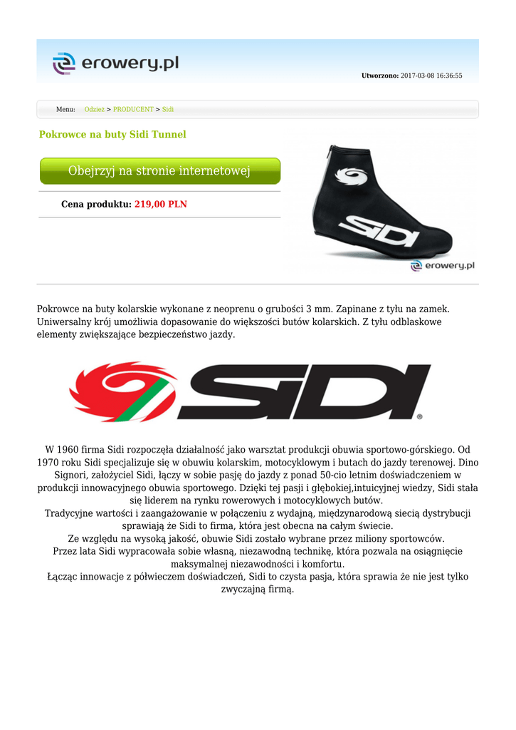 Utworzono: 2017-03-08 16:36:55 Menu: Odzież > PRODUCENT > Sidi Pokrowce na buty Sidi Tunnel Obejrzyj na stronie internetowej Cena produktu: 219,00 PLN Pokrowce na buty kolarskie wykonane z neoprenu o grubości 3 mm. Zapinane z tyłu na zamek. Uniwersalny krój umożliwia dopasowanie do większości butów kolarskich. Z tyłu odblaskowe elementy zwiększające bezpieczeństwo jazdy. W 1960 firma Sidi rozpoczęła działalność jako warsztat produkcji obuwia sportowo-górskiego. Od 1970 roku Sidi specjalizuje się w obuwiu kolarskim, motocyklowym i butach do jazdy terenowej. Dino Signori, założyciel Sidi, łączy w sobie pasję do jazdy z ponad 50-cio letnim doświadczeniem w produkcji innowacyjnego obuwia sportowego. Dzięki tej pasji i głębokiej,intuicyjnej wiedzy, Sidi stała się liderem na rynku rowerowych i motocyklowych butów. Tradycyjne wartości i zaangażowanie w połączeniu z wydajną, międzynarodową siecią dystrybucji sprawiają że Sidi to firma, która jest obecna na całym świecie. Ze względu na wysoką jakość, obuwie Sidi zostało wybrane przez miliony sportowców. Przez lata Sidi wypracowała sobie własną, niezawodną technikę, która pozwala na osiągnięcie maksymalnej niezawodności i komfortu. Łącząc innowacje z półwieczem doświadczeń, Sidi to czysta pasja, która sprawia że nie jest tylko zwyczajną firmą. Kolor Czarny_#000000 Mimo dołożenia wszelkich starań nie gwarantujemy, że publikowane opisy i specyfikacje techniczne niezawierają uchybień lub błędów, które nie mogą jednak być podstawą do roszczeń. W przypadku jakichkolwiek wątpliwości, przed podjęciem decyzji prosimy o kontakt. Adres: www.erowery.pl Telefon: 605 515 185, 34 361 16 71 Email: [email protected]