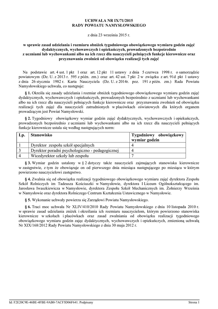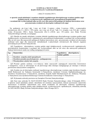 UCHWAŁA NR IX/71/2015 RADY POWIATU NAMYSŁOWSKIEGO z dnia 23 września 2015 r. w sprawie zasad udzielania i rozmiaru obniżek tygodniowego obowiązkowego wymiaru godzin zajęć dydaktycznych, wychowawczych i opiekuńczych, prowadzonych bezpośrednio z uczniami lub wychowankami albo na ich rzecz dla nauczycieli pełniących funkcje kierownicze oraz przyznawania zwolnień od obowiązku realizacji tych zajęć Na podstawie art. 4 ust. 1 pkt 1 oraz art. 12 pkt 11 ustawy z dnia 5 czerwca 1998 r. o samorządzie powiatowym (Dz. U. z 2013 r. 595 z późn. zm.) oraz art. 42 ust. 7 pkt 2 w związku z art. 91d pkt 1 ustawy z dnia 26 stycznia 1982 r. Karta Nauczyciela (Dz. U. z 2014r. poz. 191 z późn. zm.) Rada Powiatu Namysłowskiego uchwala, co następuje: § 1. Określa się zasady udzielania i rozmiar obniżek tygodniowego obowiązkowego wymiaru godzin zajęć dydaktycznych, wychowawczych i opiekuńczych, prowadzonych bezpośrednio z uczniami lub wychowankami albo na ich rzecz dla nauczycieli pełniących funkcje kierownicze oraz przyznawania zwolnień od obowiązku realizacji tych zajęć dla nauczycieli zatrudnionych w placówkach oświatowych dla których organem prowadzącym jest Powiat Namysłowski. § 2. Tygodniowy obowiązkowy wymiar godzin zajęć dydaktycznych, wychowawczych i opiekuńczych, prowadzonych bezpośrednio z uczniami lub wychowankami albo na ich rzecz dla nauczycieli pełniących funkcje kierownicze ustala się według następujących norm: Lp. Stanowisko 1 3 4 Dyrektor zespołu szkół specjalnych Dyrektor poradni psychologiczno - pedagogicznej Wicedyrektor szkoły lub zespołu Tygodniowy obowiązkowy wymiar godzin 4 4 7 § 3. Wymiar godzin ustalony w § 2 dotyczy także nauczycieli zajmujących stanowiska kierownicze w zastępstwie, z tym że obowiązuje on od pierwszego dnia miesiąca następującego po miesiącu w którym powierzono nauczycielowi zastępstwo. § 4. Zwalnia się od obowiązku realizacji tygodniowego obowiązkowego wymiaru zajęć dyrektora Zespołu Szkół Rolniczych im Tadeusza Kościuszki w Namysłowie, dyrektora I Liceum Ogólnokształcącego im. Jarosława Iwaszkiewicza w Namysłowie, dyrektora Zespołu Szkół Mechanicznych im. Żołnierzy Września w Namysłowie oraz dyrektora Rolniczego Centrum Kształcenia Ustawicznego w Namysłowie. § 5. Wykonanie uchwały powierza się Zarządowi Powiatu Namysłowskiego. § 6. Traci moc uchwała Nr XLIV/410/2010 Rady Powiatu Namysłowskiego z dnia 10 listopada 2010 r. w sprawie zasad udzielania zniżek i określania ich rozmiaru nauczycielom, którym powierzono stanowiska kierownicze w szkołach i placówkach oraz zasad zwalniania od obowiązku realizacji tygodniowego obowiązkowego wymiaru godzin zajęc dydaktycznych, wychowawczych i opiekuńczych, zmienioną uchwałą Nr XIX/168/2012 Rady Powiatu Namysłowskiego z dnia 30 maja 2012 r. Id: F2E20C9E-46BE-4FBE-9AB0-7ACF5D06F641. Podpisany Strona 1 § 7. Uchwała wchodzi w życie po upływie 14 dni od dnia ogłoszenia w Dzienniku Urzędowym Województwa Opolskiego. Przewodniczący Rady Powiatu Namysłowskiego Sławomir Gradzik Id: F2E20C9E-46BE-4FBE-9AB0-7ACF5D06F641. Podpisany Strona 2