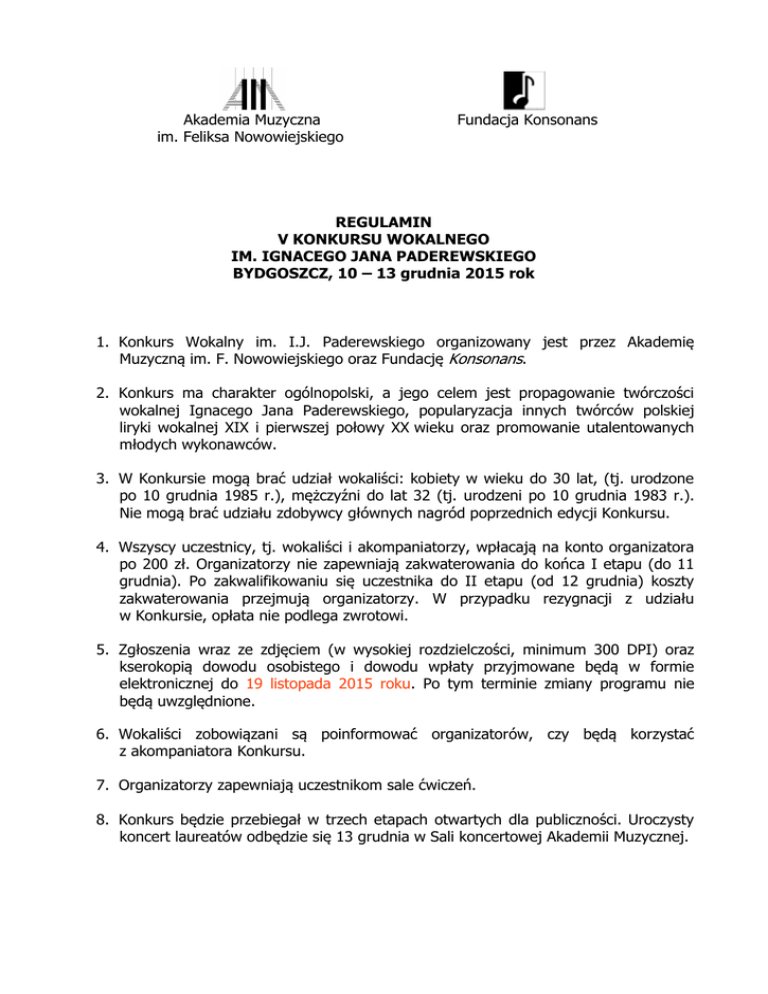 Akademia Muzyczna im. Feliksa Nowowiejskiego Fundacja Konsonans REGULAMIN V KONKURSU WOKALNEGO IM. IGNACEGO JANA PADEREWSKIEGO BYDGOSZCZ, 10 – 13 grudnia 2015 rok 1. Konkurs Wokalny im. I.J. Paderewskiego organizowany jest przez Akademię Muzyczną im. F. Nowowiejskiego oraz Fundację Konsonans. 2. Konkurs ma charakter ogólnopolski, a jego celem jest propagowanie twórczości wokalnej Ignacego Jana Paderewskiego, popularyzacja innych twórców polskiej liryki wokalnej XIX i pierwszej połowy XX wieku oraz promowanie utalentowanych młodych wykonawców. 3. W Konkursie mogą brać udział wokaliści: kobiety w wieku do 30 lat, (tj. urodzone po 10 grudnia 1985 r.), mężczyźni do lat 32 (tj. urodzeni po 10 grudnia 1983 r.). Nie mogą brać udziału zdobywcy głównych nagród poprzednich edycji Konkursu. 4. Wszyscy uczestnicy, tj. wokaliści i akompaniatorzy, wpłacają na konto organizatora po 200 zł. Organizatorzy nie zapewniają zakwaterowania do końca I etapu (do 11 grudnia). Po zakwalifikowaniu się uczestnika do II etapu (od 12 grudnia) koszty zakwaterowania przejmują organizatorzy. W przypadku rezygnacji z udziału w Konkursie, opłata nie podlega zwrotowi. 5. Zgłoszenia wraz ze zdjęciem (w wysokiej rozdzielczości, minimum 300 DPI) oraz kserokopią dowodu osobistego i dowodu wpłaty przyjmowane będą w formie elektronicznej do 19 listopada 2015 roku. Po tym terminie zmiany programu nie będą uwzględnione. 6. Wokaliści zobowiązani są poinformować organizatorów, czy będą korzystać z akompaniatora Konkursu. 7. Organizatorzy zapewniają uczestnikom sale ćwiczeń. 8. Konkurs będzie przebiegał w trzech etapach otwartych dla publiczności. Uroczysty koncert laureatów odbędzie się 13 grudnia w Sali koncertowej Akademii Muzycznej. 9. Za udział w koncercie laureatów oraz za dokonane w celach dokumentacji i promocji Konkursu nagrania fonograficzne, radiowe i telewizyjne, wokaliści i akompaniatorzy nie mogą wnosić roszczeń finansowych. 10. Kolejność przesłuchań zostanie ustalona w drodze losowania i będzie obowiązywała do końca Konkursu. Losowanie odbędzie się w dniu 10 grudnia 2015 w siedzibie Akademii Muzycznej. 11. Do II etapu Konkursu zostanie dopuszczonych nie więcej niż 10 wokalistów, do III - 5. 12. Przesłuchania konkursowe ocenia Jury, powołane przez władze Akademii. Jury pracuje w oparciu o odrębny regulamin. Obrady jury są tajne, a decyzje ostateczne. 13. Program Konkursu: Etap I a) dowolna pieśń kompozytora polskiego epoki I.J. Paderewskiego (lata 1860-1941); b) dowolna pieśń I.J. Paderewskiego. Etap II a) dwa utwory I.J. Paderewskiego ze zbioru 12 pieśni do poezji Catulle Mendèsa op. 22; b) dwie zróżnicowane stylistycznie pieśni Karola Szymanowskiego (jedna z opusów napisanych do 1910 roku, druga z opusów napisanych po 1911). Etap III a) pieśń I.J. Paderewskiego ze zbioru 6 pieśni do słów A. Mickiewicza op. 18; b) pieśń I.J. Paderewskiego ze zbioru 4 pieśni do słów A. Asnyka op. 7 c) trzy dowolnie wybrane utwory z dorobku wokalnego kompozytorów polskich epoki I.J. Paderewskiego (wykaz nazwisk kompozytorów wg załączonego aneksu). Uwagi do pkt. 13: a) w związku z przypadającą w 2015 roku 100. rocznicą urodzin Franciszka Maklakiewicza Jury Konkursu zaleca wykonanie jednej z jego pieśni; b) dopuszcza się możliwość transpozycji (z wyjątkiem "Pieśni Księżniczki z baśni" oraz "Słopiewni" Karola Szymanowskiego); c) kolejność wykonywania utworów w poszczególnych etapach jest dowolna. 14. W Konkursie zostaną przyznane laureatom następujące nagrody i wyróżnienia: I nagroda II nagroda III nagroda 7 000 zł 5 000 zł 3 000 zł I wyróżnienie II wyróżnienie 1 500 zł 1 000 zł Nagroda im. J. Lefelda dla najlepszego pianisty-akompaniatora - 2 000 zł Nagroda Specjalna za wykonanie pieśni I.J. Paderewskiego - 500 zł Nagroda Specjalna za wykonanie pieśni F. Maklakiewicza - 500 zł (wszystkie nagrody - brutto) oraz nagrody pozaregulaminowe w formie koncertów m. in. Nagroda Specjalna Towarzystwa im. Witolda Lutosławskiego za wykonanie pieśni W. Lutosławskiego dla laureata jednego z trzech pierwszych miejsc – półrecital podczas festiwalu ŁAŃCUCH XVII (informacje dotyczące warunków ubiegania się o nagrodę w aneksie) 15. Jury ma prawo zdecydować o innym podziale nagród. Aneks do regulaminu a) Przykładowy wykaz kompozytorów, których pieśni wchodzą do programu V Konkursu Wokalnego: Grażyna Bacewicz Tadeusz Baird Grzegorz Fitelberg Ignacy Friedman Witold Friemann Jerzy Gablenz Jan Gall Ludwik Grossman Zdzisław Jachimecki Henryk Jarecki Tadeusz Jarecki (syn) Tadeusz Joteyko Kazimierz Jurdziński Mieczysław Karłowicz Tadeusz Kassern Stanisław Kazuro Feliks Nowowiejski Henryk Opieński Henryk Pachulski Ignacy Jan Paderewski Eugeniusz Pankiewicz Piotr Perkowski Marceli Popławski Stefan Bolesław Poradowski Gustaw Roguski Ludomir Różycki Antoni Wincenty Rutkowski Feliks Rybicki Piotr Rytel Kazimierz Sikorski Adam Sołtys Mieczysław Sołtys Stefan Kisielewski Józef Koffler Jerzy Lefeld Stanisław Lipski Witold Lutosławski Feliks Roderyk Łabuński Franciszek Maklakiewicz Jan Maklakiewicz Witold Maliszewski Czesław Marek Piotr Maszyński Henryk Melcer-Szczawiński Emil Młynarski Eugeniusz Morawski Karol Mroszczyk Stanisław Niewiadomski Zygmunt Noskowski Roman Statkowski Antoni Stolpe Bolesław Szabelski Tadeusz Szeligowski Apolinary Szeluto Felicjan Szopski Karol Szymanowski Michał Świerzyński Aleksander Tansman Zbigniew Turski Bolesław Wallek-Walewski Stanisław Wiechowicz Aleksander Wielhorski Józef Wieniawski Bolesław Woytowicz Aleksander Zarzycki Władysław Żeleński b) Wykaz utworów W. Lutosławskiego (do wyboru) dla uczestników ubiegających się o nagrodę Towarzystwa im. Witolda Lutosławskiego: - Cykl Chantefleurs et Chantefables – sopran z fortepianem w opr. Eugeniusza Knapika, wydane przez PWM, (co najmniej 3 pieśni) - Tryptyk śląski na sopran i forte