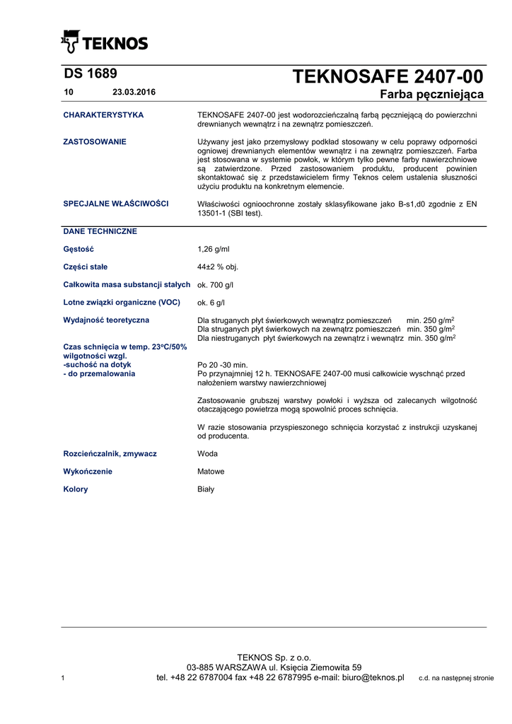DS 1689 10 TEKNOSAFE 2407-00 23.03.2016 Farba pęczniejąca CHARAKTERYSTYKA TEKNOSAFE 2407-00 jest wodorozcieńczalną farbą pęczniejącą do powierzchni drewnianych wewnątrz i na zewnątrz pomieszczeń. ZASTOSOWANIE Używany jest jako przemysłowy podkład stosowany w celu poprawy odporności ogniowej drewnianych elementów wewnątrz i na zewnątrz pomieszczeń. Farba jest stosowana w systemie powłok, w którym tylko pewne farby nawierzchniowe są zatwierdzone. Przed zastosowaniem produktu, producent powinien skontaktować się z przedstawicielem firmy Teknos celem ustalenia słuszności użyciu produktu na konkretnym elemencie. SPECJALNE WŁAŚCIWOŚCI Właściwości ognioochronne zostały sklasyfikowane jako B-s1,d0 zgodnie z EN 13501-1 (SBI test). DANE TECHNICZNE Gęstość 1,26 g/ml Części stałe 44±2 % obj. Całkowita masa substancji stałych ok. 700 g/l Lotne związki organiczne (VOC) ok. 6 g/l Wydajność teoretyczna Dla struganych płyt świerkowych wewnątrz pomieszczeń min. 250 g/m2 Dla struganych płyt świerkowych na zewnątrz pomieszczeń min. 350 g/m2 Dla niestruganych płyt świerkowych na zewnątrz i wewnątrz min. 350 g/m2 Czas schnięcia w temp. 23oC/50% wilgotności wzgl. -suchość na dotyk - do przemalowania Po 20 -30 min. Po przynajmniej 12 h. TEKNOSAFE 2407-00 musi całkowicie wyschnąć przed nałożeniem warstwy nawierzchniowej Zastosowanie grubszej warstwy powłoki i wyższa od zalecanych wilgotność otaczającego powietrza mogą spowolnić proces schnięcia. W razie stosowania przyspieszonego schnięcia korzystać z instrukcji uzyskanej od producenta. Rozcieńczalnik, zmywacz Woda Wykończenie Matowe Kolory Biały 1 TEKNOS Sp. z o.o. 03-885 WARSZAWA ul. Księcia Ziemowita 59 tel. +48 22 6787004 fax +48 22 6787995 e-mail: [email protected] c.d. na następnej stronie TEKNOSAFE 2407-00 SPOSÓB STOSOWANIA Przygotowanie podłoża DS. 1689-10 Strona 2 Powierzchnia musi być czysta i sucha. Zawartość wilgoci w drewnie nie powinna przekraczać 20%. Zaleca się aby drewno przeznaczone do użytku na zewnątrz było wstępnie zagruntowane TEKNOL AQUA 1410-01 lub GORI 356, które chronią drewno przed próchnicą, grzybami i pleśnią. Warunki podczas aplikacji Temperatura otaczającego powietrza, malowanej powierzchni i farby powinna być powyżej +5oC, a wilgotność względna powietrza poniżej 80% zarówno podczas malowania jak i w czasie schnięcia wyrobu. Najlepsze rezultaty osiąga się gdy temperatura otaczającego powietrza znajduje się w przedziale +23 +38oC, a wilgotność względna powietrza wynosi 50 -70% przy jednocześnie dobrej wentylacji. Aplikacja Przed użyciem farbę dokładnie wymieszać. Aplikacja przemysłowa metoda natryskową. Natrysk bezpowietrzny lub ze wspomaganiem powietrznym airmix. Natrysk bezpowietrzny: dysza (płaska) o średnicy 0,33mm , ciśnienie100-110bar Natrysk ze wspomaganiem powietrznym: dysza(plaska) o średnicy 0,33mm, ciśnienie 80-100bar i ciśnienie powietrza wspomagającego 1-1,5 bar Wymagane jest użycie większych niż w przypadku farb nawierzchniowych dysz i filtrów w aparatach do natrysku. Po zagruntowaniu należy nałożyć NORDICA EKO 3330-03 jako powłokę nawierzchniową. PRZECHOWYWANIE Nie może zamarzać. Optymalna temperatura przechowywania od +10 do +25oC. Informacje zawarte w karcie danych zostały stworzone w oparciu o badania laboratoryjne i praktyczne doświadczenie. Nie mając wpływu na warunki aplikacji jak również sposób postępowania możemy brać odpowiedzialność wyłącznie za jakość wyrobu i gwarantować, że odpowiada on naszym normom. Nie bierzemy również odpowiedzialności za straty lub uszkodzenia powstałe w wyniku nanoszenia wyrobów niezgodnie z zaleceniami lub z powodu niewłaściwego ich użycia. Produkt przeznaczony jest do użytku profesjonalnego. Oznacza to, że użytkownik posiada wystarczającą wiedzę do korzystania z produktu przestrzegając ściśle warunków technicznych i bezpieczeństwa pracy. Najnowsze wersje kart danych technicznych i charakterystyki znajdują się na stronie: www.teknos.com. 2 TEKNOS Sp. z o.o. 03-885 WARSZAWA ul. Księcia Ziemowita 59 tel. +48 22 6787004 fax +48 22 6787995 e-mail: [email protected]