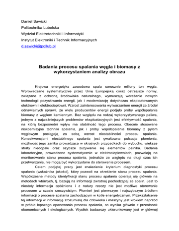 Daniel Sawicki Politechnika Lubelska Wydział Elektrotechniki i Informatyki Instytut Elektroniki i Technik Informacyjnych [email protected] Badania procesu spalania węgla i biomasy z wykorzystaniem analizy obrazu Krajowa energetyka zawodowa spala corocznie miliony ton węgla. Wprowadzane systematycznie przez Unię Europejską coraz ostrzejsze normy, związane z ochroną środowiska naturalnego, wymuszają wdrażanie nowych technologii pozyskiwania energii, jak i modernizację dotychczas eksploatowanych elektrowni i elektrociepłowni. Wzrost zainteresowania wytwarzaniem energii ze źródeł odnawialnych sprawił, że wielu producentów energii podjęło próby współspalania biomasy z węglem kamiennym. Bez względu na rodzaj wykorzystywanego paliwa, jednym z najważniejszych problemów eksploatacyjnych jest efektywność spalania, na którą bezpośredni wpływ ma stabilność tego procesu. Obecnie stosowane niskoemisyjne techniki spalania, jak i próby współspalania biomasy z pyłem węglowym pociągają za sobą wzrost niestabilności procesu spalania. Konsekwencjami niestabilnego spalania jest gwałtowna pulsacja płomienia, możliwość jego zaniku prowadząca w skrajnych przypadkach do wybuchu, większe straty niedopału oraz szybsze zużywanie się elementów palnika. Badania laboratoryjne, prowadzone systematycznie w elektrociepłowniach, pozwalają na monitorowanie stanu procesu spalania, jednakże ze względu na długi czas ich przetwarzania, nie mogą być wykorzystane do sterowania procesem. Celem podjętej pracy jest znalezienie kryterium diagnostyki procesu spalania (wskaźnika jakości), który pozwoli na określenie stanu procesu spalania. Współczesne metody identyfikacji stanu procesu spalania opierają się głównie na metodach wtórnych, tj. bazują na informacji zwrotnej pochodzącej ze spalin. Jest to niestety informacja opóźniona i z natury rzeczy nie jest możliwe sterowanie procesem w czasie rzeczywistym. Płomień jest pierwszym i najszybszym źródłem informacji o procesie spalania zachodzącym w kotle energetycznym. Przekształcenie tej informacji w informację zrozumiałą dla człowieka i maszyny jest krokiem naprzód w próbie lepszego opanowania procesu spalania, co wynika głównie z przesłanek ekonomicznych i ekologicznych. Wysiłek badawczy ukierunkowany jest w głównej mierze na poznanie zjawisk zachodzących w kotle energetycznym podczas współspalania biomasy z pyłem węglowym oraz wypracowaniu metody analizy obrazu takiego płomienia. Proponowane podejście analizy obrazu płomienia za pomocą parametrów geometrycznych oraz składowych głównych, opracowanie na tej podstawie wskaźnika jakości pozwoli na monitorowanie i sterowanie stanem procesu. Obecnie w Polsce, autorowi nie są znane ośrodki naukowe ani osoby zajmujące się sterowaniem procesem spalania w czasie rzeczywistym. Badania związane ze stabilnością procesu spalania mają ogromne znaczenie przy produkcji energii z wykorzystaniem biomasy. Ze względu na najniższy koszt inwestycyjny, krajowa energetyka zawodowa najczęściej decyduje się na współspalanie biomasy z węglem. Właściwości fizyko-chemiczne biomasy: słabe rozdrobnienie, zmienna wilgotność, niezadowalające wymieszanie, silnie zmniejszają stabilność i sprawność procesu. Wprowadzane dyrektywy Unijne, nakazujące wzrost udziału energii ze źródeł odnawialnych, spowodują jeszcze większe wykorzystanie biomasy, nawet w niewielkich elektrociepłowniach.