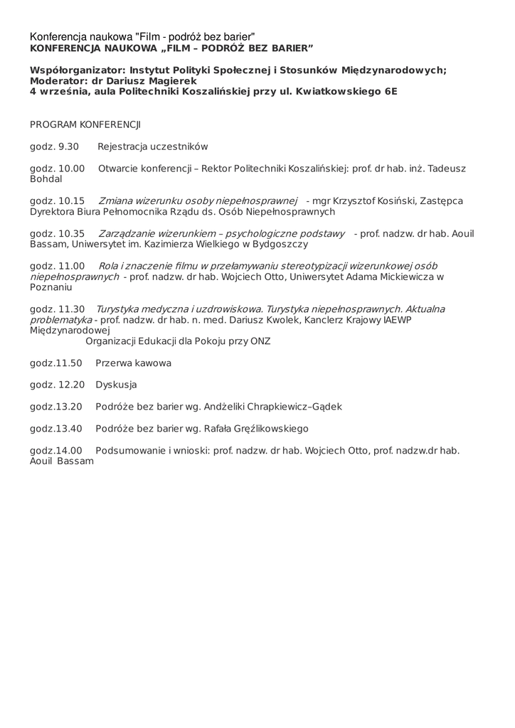 Konferencja naukowa "Film - podróż bez barier" KONFERENCJA NAUKOWA „FILM – PODRÓŻ BEZ BARIER” Współorganizator: Instytut Polityki Społecznej i Stosunków Międzynarodowych; Moderator: dr Dariusz Magierek 4 września, aula Politechniki Koszalińskiej przy ul. Kwiatkowskiego 6E PROGRAM KONFERENCJI godz. 9.30 Rejestracja uczestników godz. 10.00 Bohdal Otwarcie konferencji – Rektor Politechniki Koszalińskiej: prof. dr hab. inż. Tadeusz godz. 10.15 Zmiana wizerunku osoby niepełnosprawnej - mgr Krzysztof Kosiński, Zastępca Dyrektora Biura Pełnomocnika Rządu ds. Osób Niepełnosprawnych godz. 10.35 Zarządzanie wizerunkiem – psychologiczne podstawy Bassam, Uniwersytet im. Kazimierza Wielkiego w Bydgoszczy - prof. nadzw. dr hab. Aouil godz. 11.00 Rola i znaczenie filmu w przełamywaniu stereotypizacji wizerunkowej osób niepełnosprawnych - prof. nadzw. dr hab. Wojciech Otto, Uniwersytet Adama Mickiewicza w Poznaniu godz. 11.30 Turystyka medyczna i uzdrowiskowa. Turystyka niepełnosprawnych. Aktualna problematyka - prof. nadzw. dr hab. n. med. Dariusz Kwolek, Kanclerz Krajowy IAEWP Międzynarodowej Organizacji Edukacji dla Pokoju przy ONZ godz.11.50 Przerwa kawowa godz. 12.20 Dyskusja godz.13.20 Podróże bez barier wg. Andżeliki Chrapkiewicz–Gądek godz.13.40 Podróże bez barier wg. Rafała Gręźlikowskiego godz.14.00 Podsumowanie i wnioski: prof. nadzw. dr hab. Wojciech Otto, prof. nadzw.dr hab. Aouil Bassam