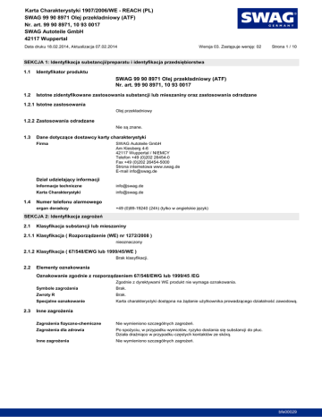Karta Charakterystyki 1907/2006/WE - REACH (PL) Nr. art. 99 90 8971, 10 93 0017 SWAG Autoteile GmbH 42117 Wuppertal Data druku 18.02.2014, Aktualizacja 07.02.2014 1.1 Strona 1 / 10 Identyfikator produktu Nr. art. 99 90 8971, 10 93 0017 1.2 Istotne zidentyfikowane zastosowania substancji lub mieszaniny oraz zastosowania odradzane 1.2.1 Istotne zastosowania 1.2.2 Zastosowania odradzane 1.3 1.4 Firma SWAG Autoteile GmbH Am Kiesberg 4-6 42117 Wuppertal / NIEMCY Telefon +49 (0)202 26454-0 Fax +49 (0)202 26454-5000 Strona internetowa www.swag.de E-mail [email protected] Informacje techniczne [email protected] Karta Charakterystyki [email protected] Numer telefonu alarmowego organ doradczy 2.1 Klasyfikacja substancji lub mieszaniny 2.1.1 nieoznaczony 2.1.2 Klasyfikacja ( 67/548/EWG lub 1999/45/WE ) Brak klasyfikacji. 2.2 Elementy oznakowania Zgodnie z dyrektywami WE produkt nie wymaga oznakowania. Brak. Zwroty R Brak. Specjalne oznakowanie 2.3 bfe00029 Karta Charakterystyki 1907/2006/WE - REACH (PL) Nr. art. 99 90 8971, 10 93 0017 SWAG Autoteile GmbH 42117 Wuppertal Data druku 18.02.2014, Aktualizacja 07.02.2014 Strona 2 / 10 Produkt typu: 1 - <5 kopolimer metakrylanu EINECS/ELINCS: Polymer GHS/CLP: Eye Irrit. 2: H319 EEC: Xi, R 36 Lista SVHC (Candidate List of Substances of Very High Concern for authorisation): nie SEKCJA 4: Pierwsza pomoc 4.1 Informacje ogólne oddechowych Kontakt z oczami 4.2 4.3 poszkodowanym 5.1 Piana. 5.2 Tlenki siarki (SOx). Tlenki azotu (NOx). 5.3 bfe00029 Karta Charakterystyki 1907/2006/WE - REACH (PL) Nr. art. 99 90 8971, 10 93 0017 SWAG Autoteile GmbH 42117 Wuppertal Data druku 18.02.2014, Aktualizacja 07.02.2014 Strona 3 / 10 6.1 6.2 lub bariery olejowej). 6.3 6.4 Odniesienia do innych sekcji Patrz SEKCJA 8+13 7.1 Produkt jest palny. 7.2 7.3 Patrz sekcja 1.2 8.1 granicznych, nad którymi konieczny jest dozór w miejscu pracy (PL) nie dotyczy bfe00029 Karta Charakterystyki 1907/2006/WE - REACH (PL) Nr. art. 99 90 8971, 10 93 0017 SWAG Autoteile GmbH 42117 Wuppertal Data druku 18.02.2014, Aktualizacja 07.02.2014 Strona 4 / 10 8.2 Ochrona oczu Okulary ochronne. kauczuk nitrylowy, >120 min (EN 374). Neoprene, >480 min (EN 374). Ochrona skóry Inne Ochrona dróg oddechowych Brak. Ograniczenie i kontrola Patrz SEKCJA 6+7. naturalnego 9.1 Stan skupienia ciecz Kolor czerwony Zapach Próg zapachu nieoznaczony nie dotyczy nie dotyczy Temperatura wrzenia [°C] nieoznaczony 175 (DIN ISO 2592) nieoznaczony nieoznaczony nieoznaczony Utlenianie brak < 0,01 (20°C) ~0,86 (DIN 51757) (15 °C / 59,0 °F) nie dotyczy nieoznaczony oktanol/woda] ~38 mm²/s (40°C) (DIN 51562/T1) nieoznaczony do powietrza nieoznaczony 9.2 Temperatura topnienia [°C] ~-40 (DIN ISO 3016) Samozapalenie [°C] nieoznaczony Temperatura rozpadu [°C] > 65 Inne informacje 10.1 bfe00029 Karta Charakterystyki 1907/2006/WE - REACH (PL) Nr. art. 99 90 8971, 10 93 0017 SWAG Autoteile GmbH 42117 Wuppertal Data druku 18.02.2014, Aktualizacja 07.02.2014 Strona 5 / 10 10.2 W normalnych warunkach otoczenia (temperatura pokojowa) stabilny. 10.3 Reaguje z mocnymi kwasami. 10.4 Patrz SEKCJA 7.2. Mocne ogrzewanie. 10.5 nieoznaczony 10.6 SEKCJA 11: Informacje toksykologiczne 11.1 nieoznaczony nieoznaczony nieoznaczony nieoznaczony nieoznaczony nieoznaczony nieoznaczony reprodukcji nieoznaczony Uwagi ogólne SEKCJA 12: Informacje ekologiczne 12.1 12.2 nieoznaczony nieoznaczony Biodegradacja nieoznaczony 12.3 12.4 bfe00029 Karta Charakterystyki 1907/2006/WE - REACH (PL) Nr. art. 99 90 8971, 10 93 0017 SWAG Autoteile GmbH 42117 Wuppertal Data druku 18.02.2014, Aktualizacja 07.02.2014 Strona 6 / 10 12.5 12.6 13.1 Metody unieszkodliwiania odpadów Produkt Kod substancji odpadowej (zalecany) 130205* Nieoczyszczone opakowania Kod substancji odpadowej (zalecany) 150102 150104 150110* SEKCJA 14: Informacje o transporcie 14.1 Numer UN (numer ONZ) 14.2 Transport morski wg IMDG NOT CLASSIFIED AS "DANGEROUS GOODS" Transport lotniczy wg IATA NOT CLASSIFIED AS "DANGEROUS GOODS" 14.3 14.4 Grupa pakowania 14.5 14.6 14.7 nie dotyczy bfe00029 Karta Charakterystyki 1907/2006/WE - REACH (PL) Nr. art. 99 90 8971, 10 93 0017 SWAG Autoteile GmbH 42117 Wuppertal Data druku 18.02.2014, Aktualizacja 07.02.2014 Strona 7 / 10 15.1 mieszaniny EEC-PRZEPISY 1967/548 (1999/45); 1991/689 (2001/118); 1999/13; 2004/42; 648/2004; 1907/2006 (Reach); 1272/2008; 75/324/EWG (2008/47/WE); 453/2010/WE TRANSPORT-PRZEPISY ADR (2013); IMDG-Code (2013, 36. Amdt.); IATA-DGR (2014) PRZEPISY NARODOWE (PL): 1. Ustawa z dnia 25 lutego 2011 r. o substancjach chemicznych i ich mieszaninach (Dz. U. 2. klasyfikacji substancji chemicznych i ich mieszanin (Dz. U. poz. 1018 z 2012 r.). 3. niebezpiecznych i mieszanin niebezpiecznych oraz niektórych mieszanin (Dz. U. 2012. 445). 4. 5. Ustawa o odpadach z dnia 14 grudnia 2012 r. (Dz. U. 2013, poz. 21). 6. Ustawa z dnia 11 maja 2001 r. o opakowaniach i odpadach opakowaniowych( Dz. U. Nr 63, 7. poz. 1206). 8. 9. odniesienia dla niektórych substancji w powietrzu (Dz. U. Nr. 16 , poz. 87). 10. 11. niektórych substancji w powietrzu (Dz. U. 2012 nr 0 poz. 1031). 12. 13. Nr 110, poz. 641). 14. 91/155/EWG, 93/67/EWG, 93/105/WE i 2000/21/WE. 15. 1999/45/WE Dyrektywa Parlamentu Europejskiego i Rady z dnia 31 maja 1999 r. w niebezpiecznych. 16. pakowania i etykietowania substancji niebezpiecznych. 17. 1907/2006. 18. 1272/2008 z dnia 16 grudnia 2008 r. w sprawie klasyfikacji, oznakowania i pakowania substancji i mieszanin. 19. 20. 2008/98/WE Dyrektywa Parlamentu Europejskiego i Rady z dnia 19 listopada 2008 r. w opakowaniowych. 21.Ustawa z dnia 20 maja 2010 r. o wyrobach medycznych (Dz. U. 2010 nr 107 poz. 679 wraz 22. 23. wyniku wykorzystania rozpuszczalników organicznych w niektórych farbach i lakierach oraz w bfe00029 Karta Charakterystyki 1907/2006/WE - REACH (PL) Nr. art. 99 90 8971, 10 93 0017 SWAG Autoteile GmbH 42117 Wuppertal Data druku 18.02.2014, Aktualizacja 07.02.2014 Strona 8 / 10 24. 25. brak zatrudnianiu - VOC (1999/13/WE) nie d