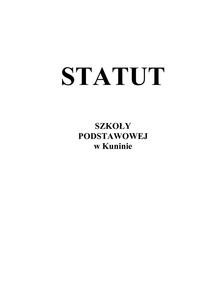 STATUT SZKOŁY PODSTAWOWEJ w Kuninie WSTĘP Statut jest zgodny z: Konstytucją Rzeczpospolitej Polski z dnia 2 kwietnia 1997 r. ( Dz. U. Nr 78, poz. 483 ) Ustawą o Systemie Oświaty z dnia 7 września 1991 r. ( Dz. U. z 2004 r. Nr 256, poz. 2572 z późn. zm.) Ustawą Karty Nauczyciela z dnia 26 stycznia 1982 r. (Dz. U. z 2006 r Nr 97, poz. 674 z późn. zm.) Powszechną Deklaracją Praw Człowieka i Obywatela z dnia 29 czerwca 1972 r. Konwencją o Prawach Dziecka przyjętą przez Zgromadzenie Ogólne Narodów Zjednoczonych dnia 20 listopada 1989r. ( Dz. U. Z 1991 r. Nr 120, poz. 526) Rozporządzeniem Ministra Edukacji Narodowej i Sportu z dnia 21 maja 2001r. w sprawie ramowych statutów publicznego przedszkola oraz publicznych szkół ( Dz. U. z 2001r. Nr 61, poz. 624 z późn. zm.) Rozporządzeniem Ministra Edukacji Narodowej z dnia 9 lutego 2007r. zmieniającym rozporządzenie w sprawie ramowych statutów publicznego przedszkola oraz szkół publicznych (Dz. U. z dnia 27 lutego 2007r. Nr 35, poz. 222 z późn. zm.) 1 NAZWA SZKOŁY § 1.1. Szkoła Podstawowa w Kuninie 2.Organem prowadzącym szkołę jest Gmina Goworowo. Nadzór pedagogiczny nad szkołą sprawuje Mazowiecki Kurator Oświaty. 3.Siedzibą szkoły jest państwowy budynek w Kuninie. § 2. Na pieczęciach ustalona nazwa jest używana przez szkołę w pełnym brzmieniu. INNE INFORMACJE O SZKOLE § 3.1.Nauka w szkole jest obowiązkowa. 2.Czas trwania cyklu kształcenia wynosi 6 lat zgodnie z przepisami w sprawie ramowych planów nauczania. 3.Świadectwo ukończenia szkoły uprawnia do kontynuowania nauki gimnazjum. CELE I ZADANIA SZKOŁY § 4.1. Szkoła oraz poszczególni nauczyciele podejmują działania mające na celu zindywidualizowane wspomaganie rozwoju każdego ucznia, stosownie do jego potrzeb i możliwości. Uczniom z niepełnosprawnościami, w tym uczniom z upośledzeniem umysłowym w stopniu lekkim, nauczanie dostosowuje się ponadto do ich możliwości psychofizycznych oraz tempa uczenia się. Szkoła realizuje cele i zadania wynikające z przepisów prawa oraz uwzględniające program wychowawczy szkoły i program profilaktyki dostosowany do potrzeb rozwojowych uczniów oraz potrzeb danego środowiska, a w szczególności: - umożliwia zdobycie wiedzy i umiejętności niezbędnych do uzyskania świadectwa ukończenia szkoły; - umożliwia absolwentom podjęcie nauki w gimnazjum; - kształtuje środowisko wychowawcze sprzyjające realizowaniu celów i zasad określonych w ustawie stosownie do warunków szkoły i wieku uczniów; - sprawuje opiekę nad uczniami odpowiednio do ich potrzeb oraz możliwości szkoły; - określa szczegółowe zasady oceniania w szkole, które są załącznikiem do statutu. 2.Program wychowawczy szkoły i program profilaktyki uchwala Rada Pedagogiczna i Rada Rodziców. Program wychowawczy i program profilaktyki są załącznikami do statutu. 2 § 5.1. Zadaniem szkoły jest: 1) realizowanie programu nauczania skoncentrowanego na dziecku, na jego indywidualnym tempie rozwoju i możliwościach uczenia się; 2) respektowanie trójpodmiotowości oddziaływań wychowawczych i kształcących: uczeń- szkoła- dom rodzinny; 3) rozwijanie predyspozycji i zdolności poznawczych dziecka; 4) kształtowanie u dziecka pozytywnego stosunku do nauki oraz rozwijanie ciekawości w poznawaniu otaczającego świata i w dążeniu do prawdy; 5) poszanowanie godności dziecka; zapewnienie dziecku przyjaznych, bezpiecznych i zdrowych warunków do nauki i zabawy, działania indywidualnego i zespołowego, rozwijania samodzielności oraz odpowiedzialności za siebie i najbliższe otoczenie, ekspresji plastycznej, muzycznej i ruchowej, aktywności badawczej, a także działalności twórczej; 6) wyposażenie dziecka w umiejętność czytania i pisania, w wiadomości i sprawności matematyczne potrzebne w sytuacjach życiowych i szkolnych oraz przy rozwiązywaniu problemów; 7) dbałość o to, aby dziecko mogło nabywać wiedzę i umiejętności potrzebne do rozumienia świata, w tym zagwarantowanie mu dostępu do różnych źródeł informacji i możliwości korzystania z nich; 8) sprzyjanie rozwojowi cech osobowości dziecka koniecznych do aktywnego i etycznego uczestnictwa w życiu społecznym. Kształcenie i wychowanie ma na celu: - wpajanie miłości do Ojczyzny, - wpajanie do poszanowania Konstytucji Rzeczypospolitej Polskiej, godła i symboli narodowych, - poznawanie przeszłości i teraźniejszości kraju, - budzenie szacunku dla postępowych tradycji narodu polskiego i jego kultury, literatury i języka przy jednoczesnym otwarciu się na wartości kultur Europy i świata, - przygotowanie uczniów do współuczestnictwa w życiu kraju, - kształtowanie odpowiedzialności za jego losy i pomyślną przyszłość, - wdrażanie do myślenia w kategoriach nierozerwalności interesów państwa i narodu, - poszanowanie prawa i konieczności umacniania państwa jako organizatora życia narodu, - wychowanie dla pokoju, - umożliwianie uczniom udziału w obchodach rocznic ważnych wydarzeń historycznych i państwowych, uroczystościach i imprezach szkolnych z zachowaniem ceremoniału szkoły, - kształtowanie poczucia tożsamości religijnej poprzez uczestnictwo uczniów w katechizacji w szkole zgodnie z wyznawaną religią i ich udział w obrzędach religijnych, 3 - kształtowanie umiejętności stosowania zasad współżycia społecznego, tolerancji, życzliwości, wrażliwości na sprawy innych, - przygotowanie do życia w społeczeństwie, rodzinie, - nabywanie umiejętności spełniania powinności wzorowego ucznia, dobrego kolegi, odpowiedzialnego członka rodziny, pracownika, wzorowego obywatela, - wychowanie przez pracę, ukazywanie jej wartości, kształtowanie szacunku do pracy i ludzi ją wykonujących, - przygotowanie do aktywnego i twórczego uczestnictwa w kulturze, - upowszechnianie dorobku kultury narodowej i światowej, - kształtowanie wrażliwości na piękno, - wzbogacanie doznań i potrzeb estet